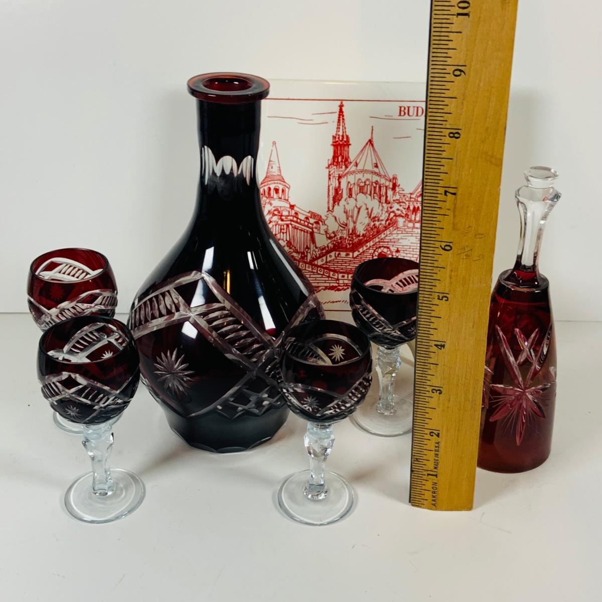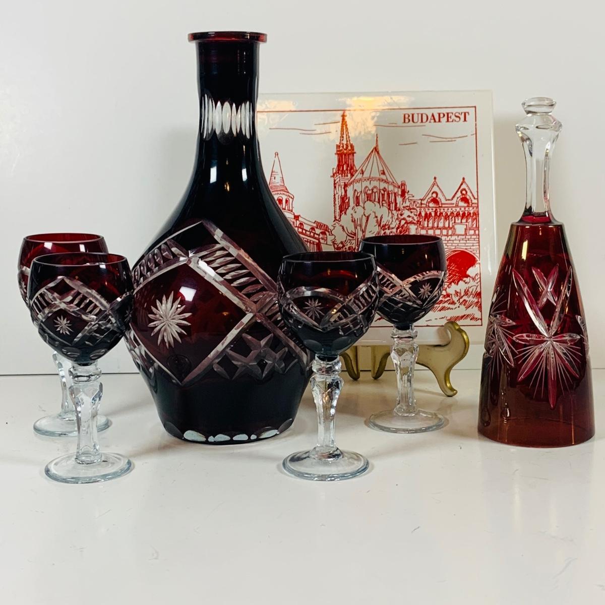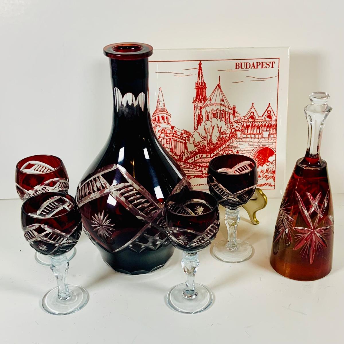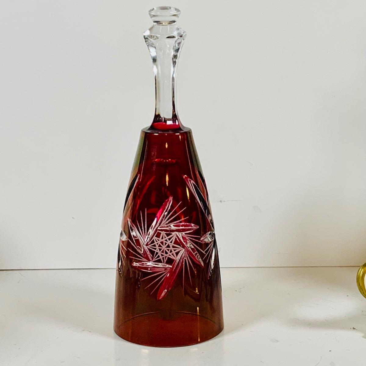 LOT 310: Etched Glass Cranberry Glass Decanter Set and Etched Glass Bell and More