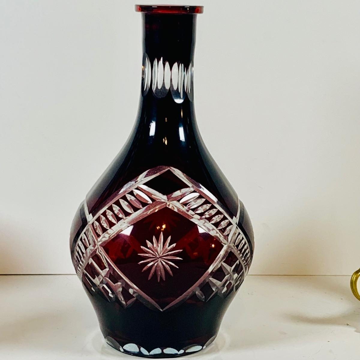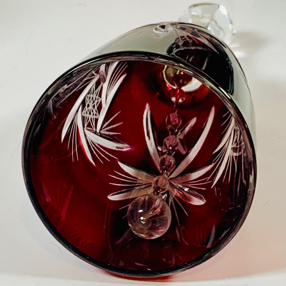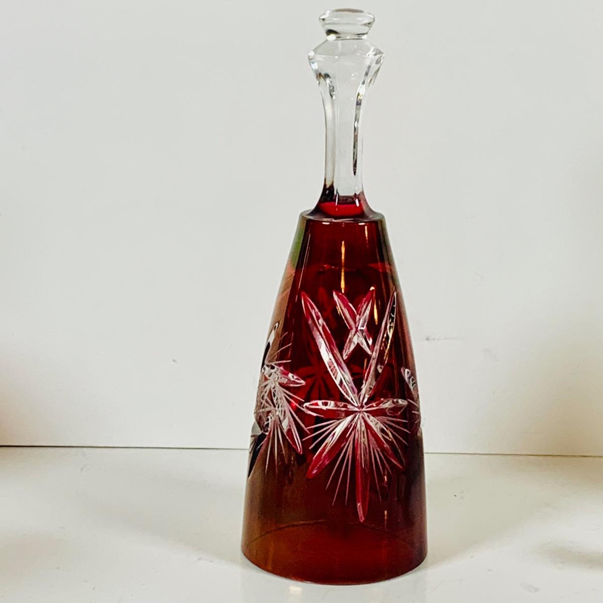 LOT 310: Etched Glass Cranberry Glass Decanter Set and Etched Glass Bell and More