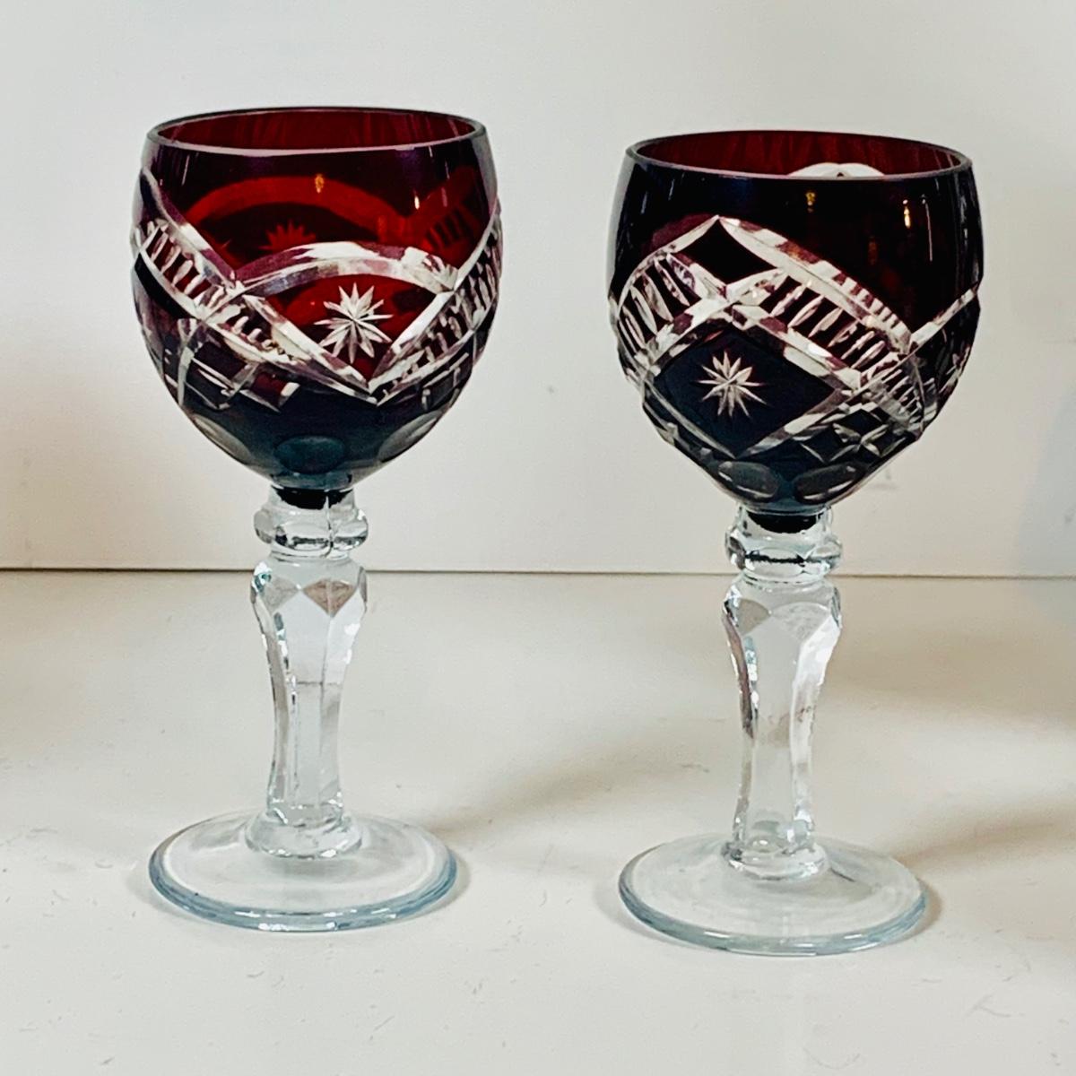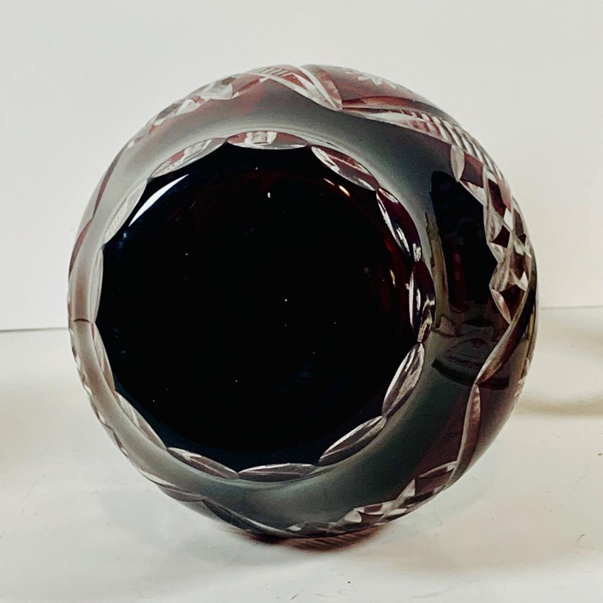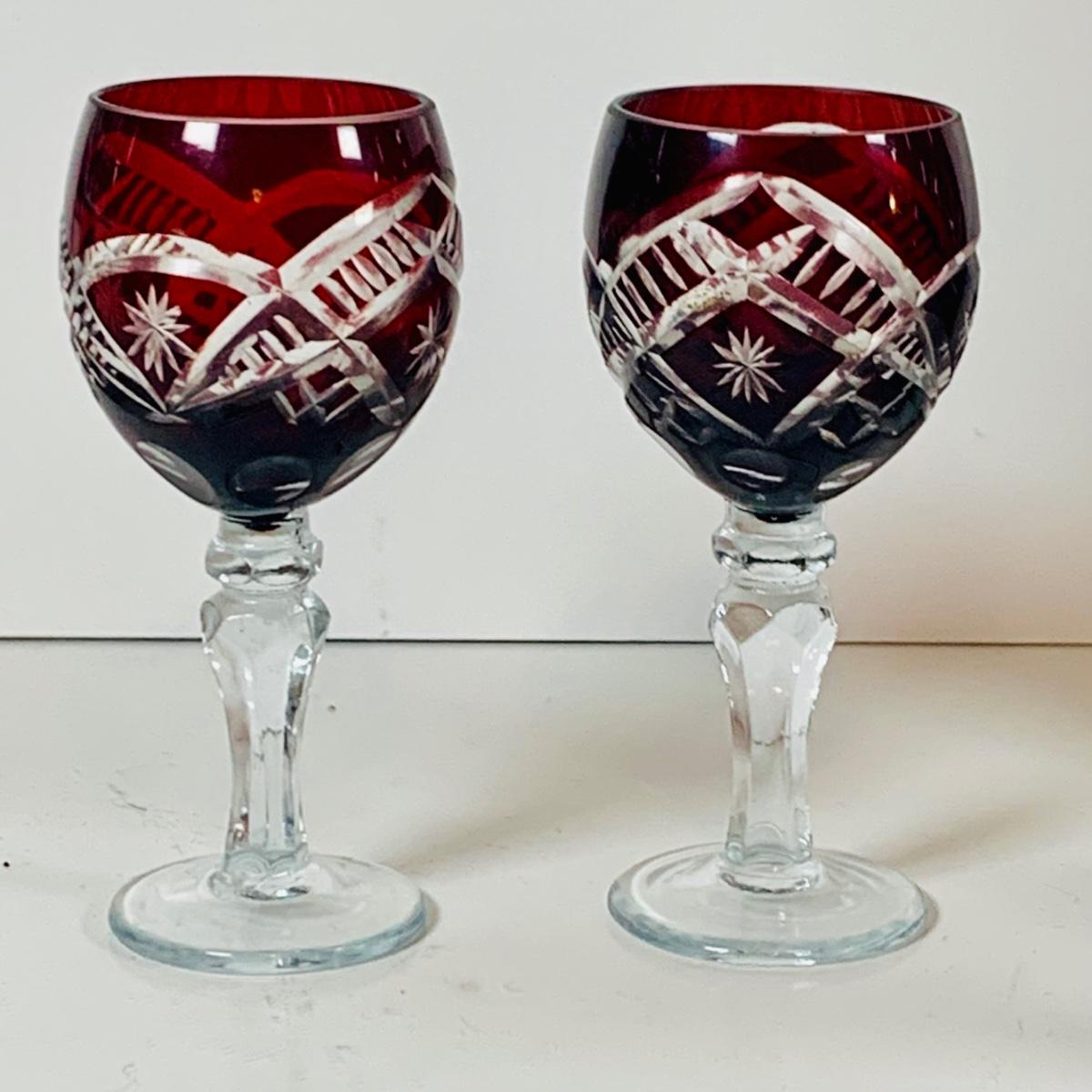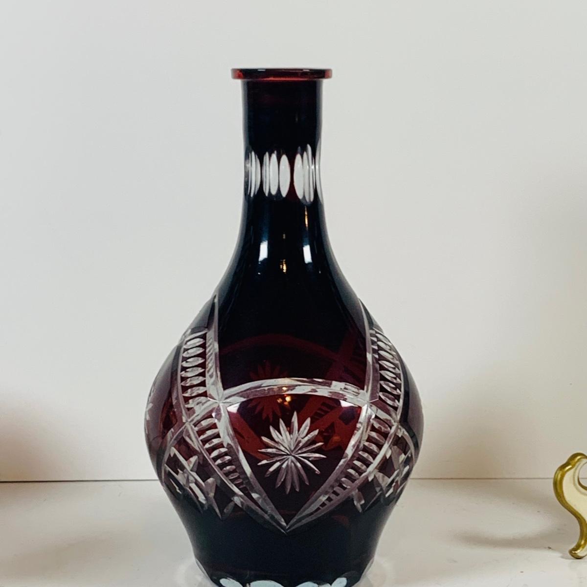 LOT 310: Etched Glass Cranberry Glass Decanter Set and Etched Glass Bell and More