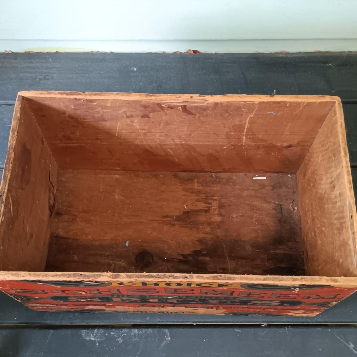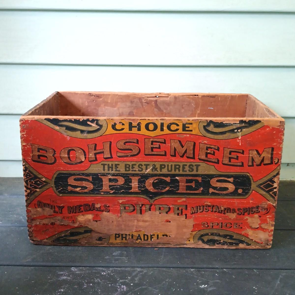 LOT 313: Antique Bohsemeem Spices Advertisement Wood Box with Holiday Decor