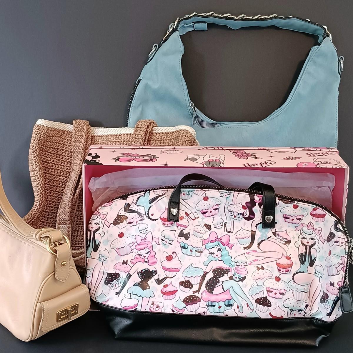 LOT 320: Miss Fluff Cupcake Doll Shoulder Bag, Blue Faux Leather Shoulderbag, The Sak Crocheted Purse & Ralph Lauren Purse