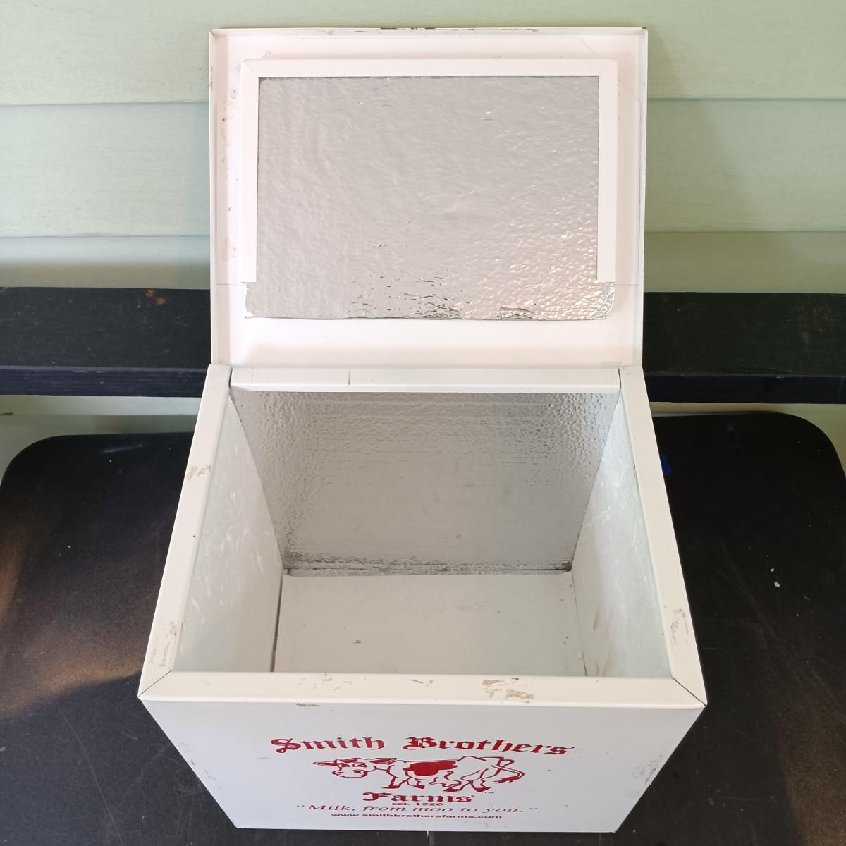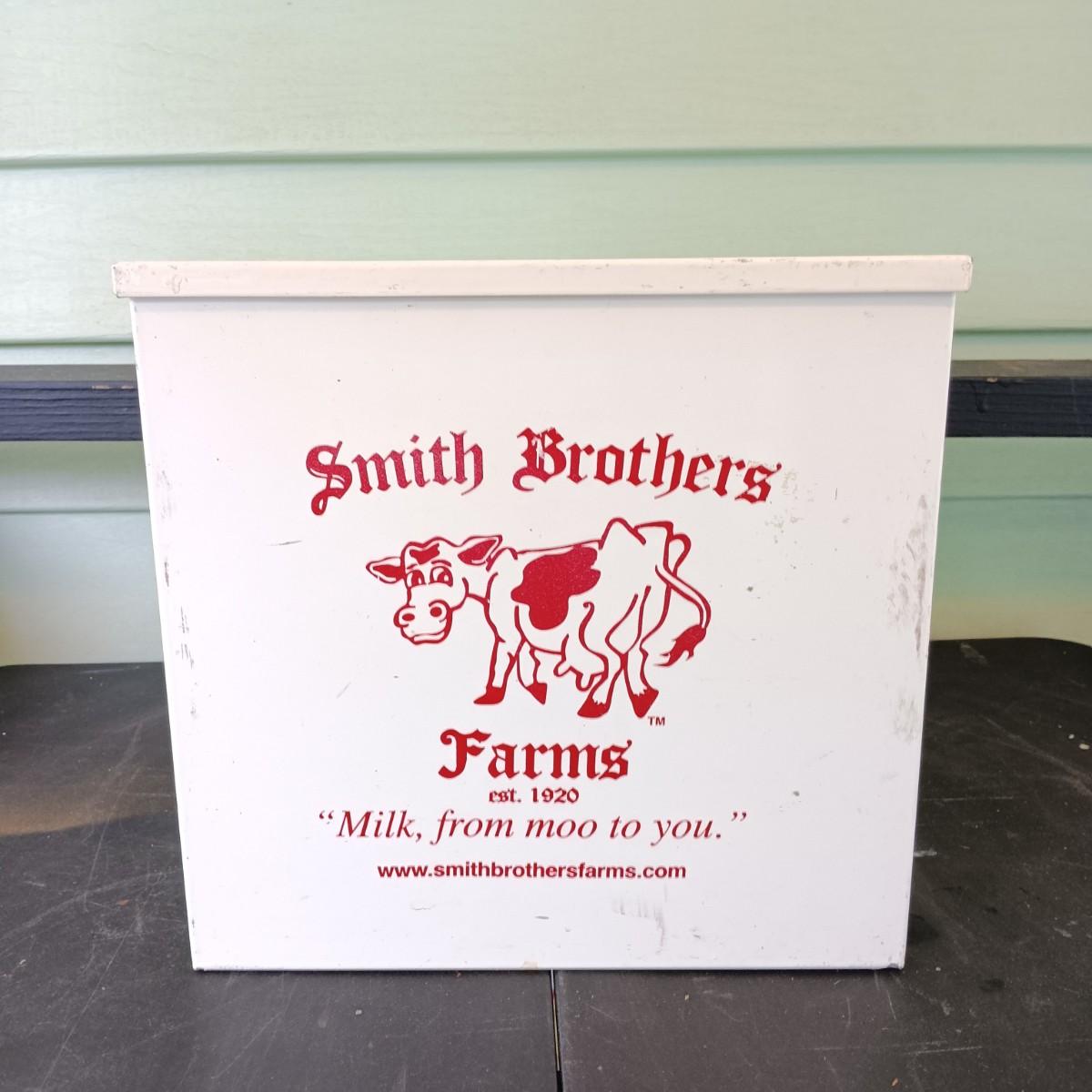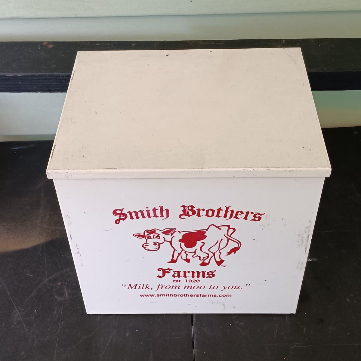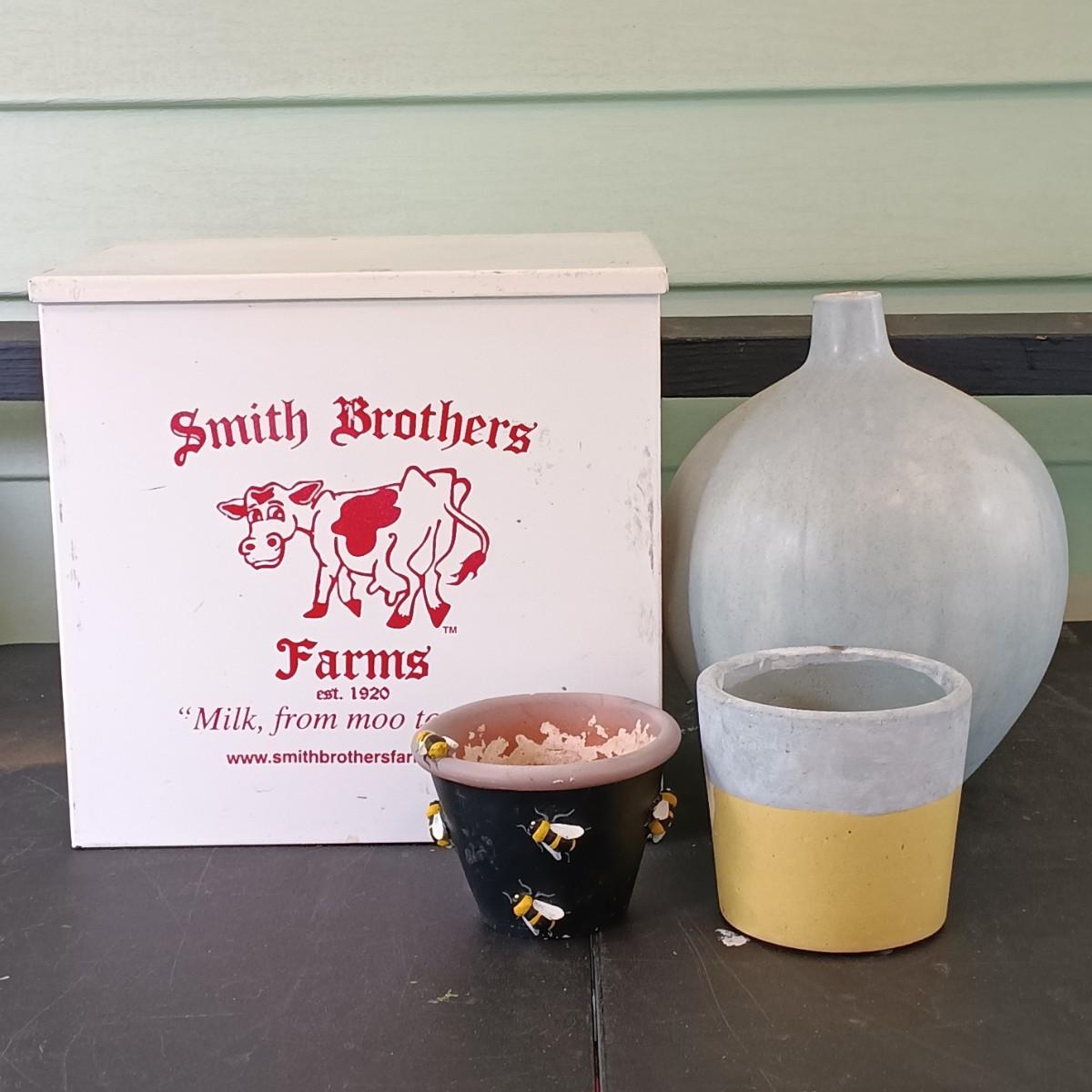 LOT 324: Smith Brothers Farms Metal Dairy Porch Box with Blue Glaze Vase & Garden Pottery