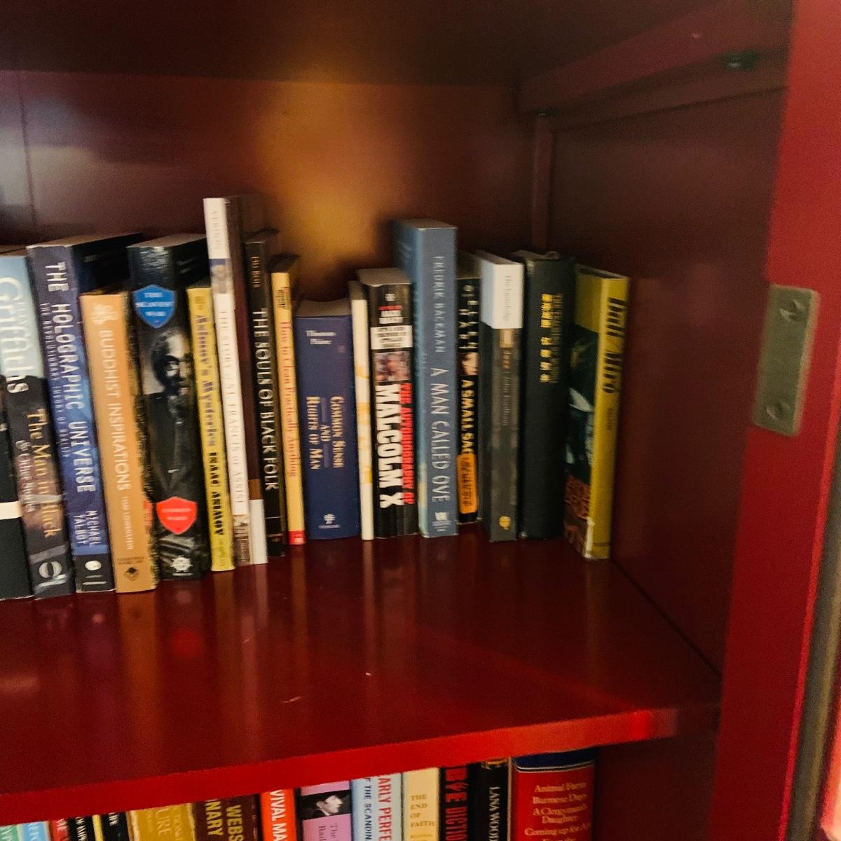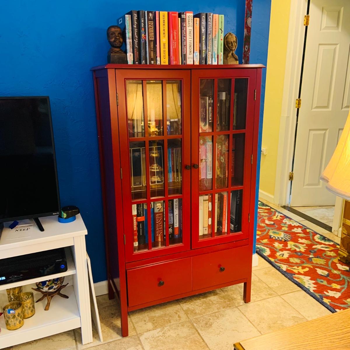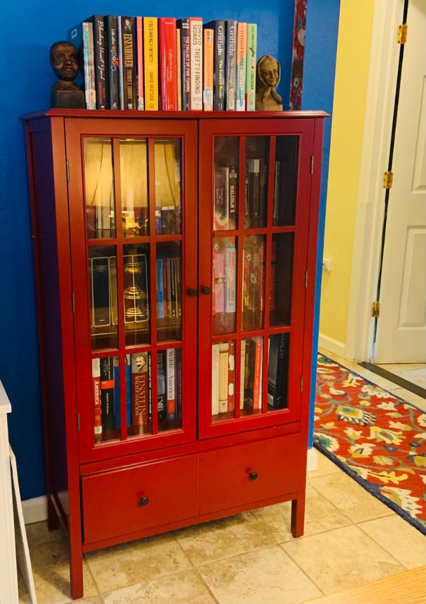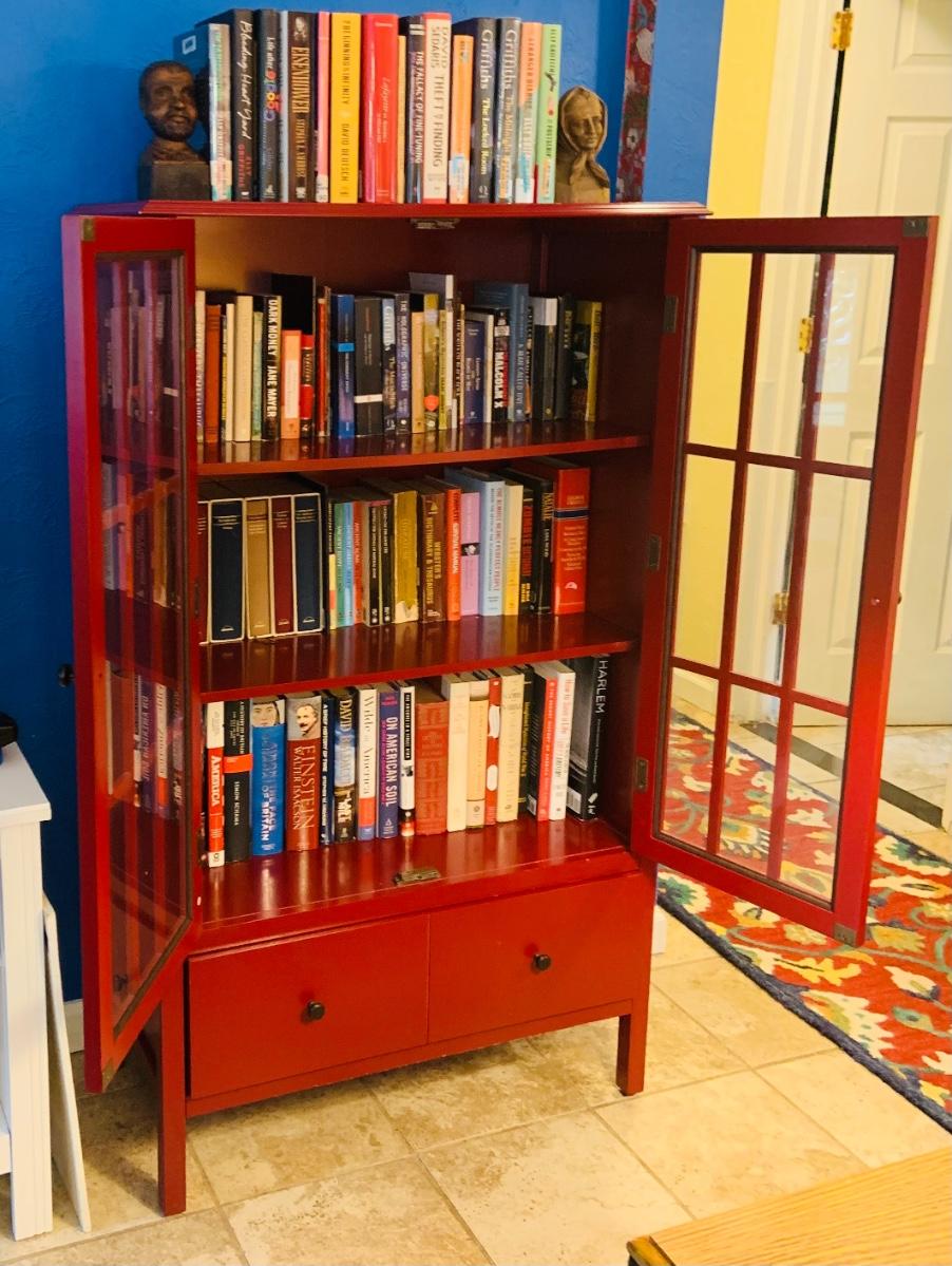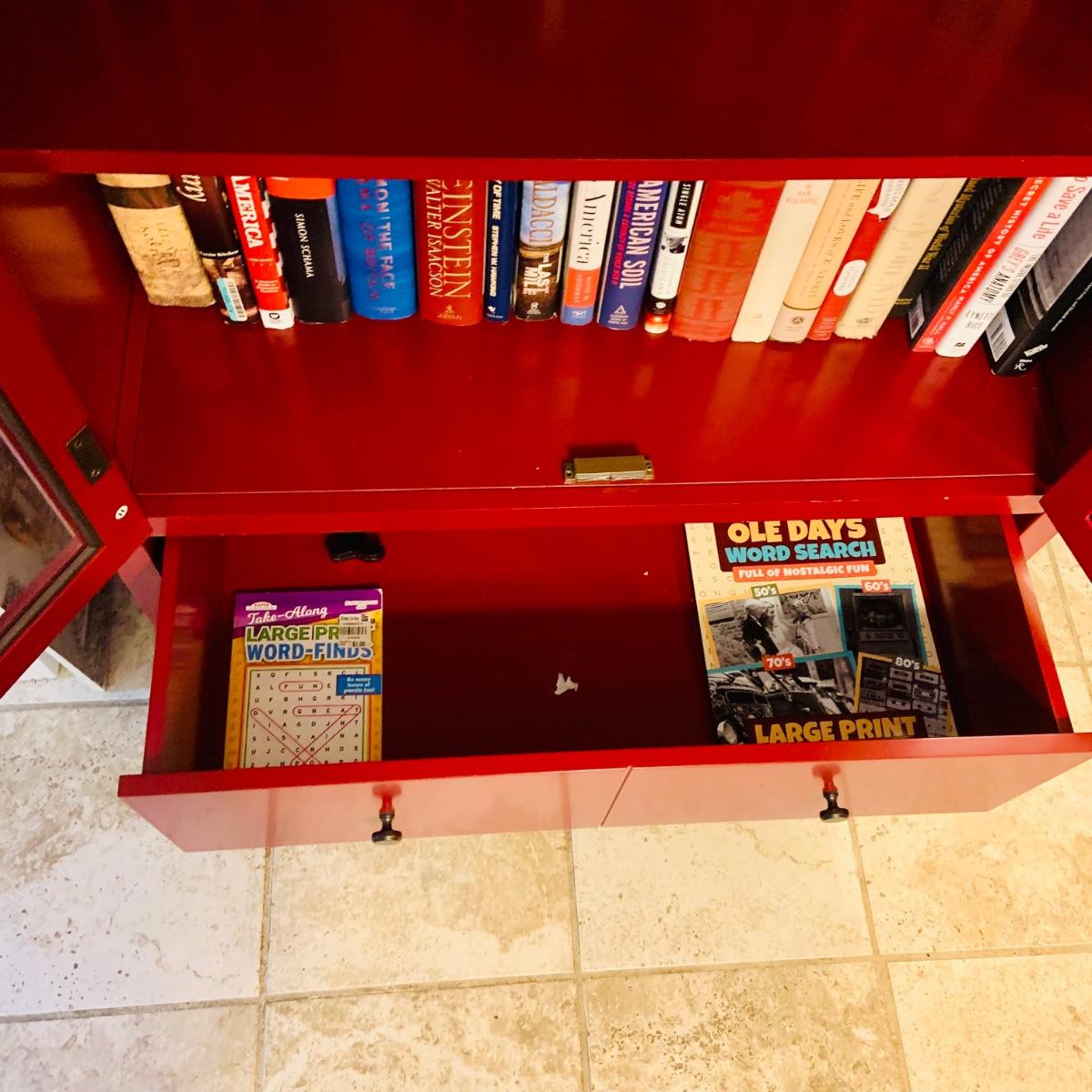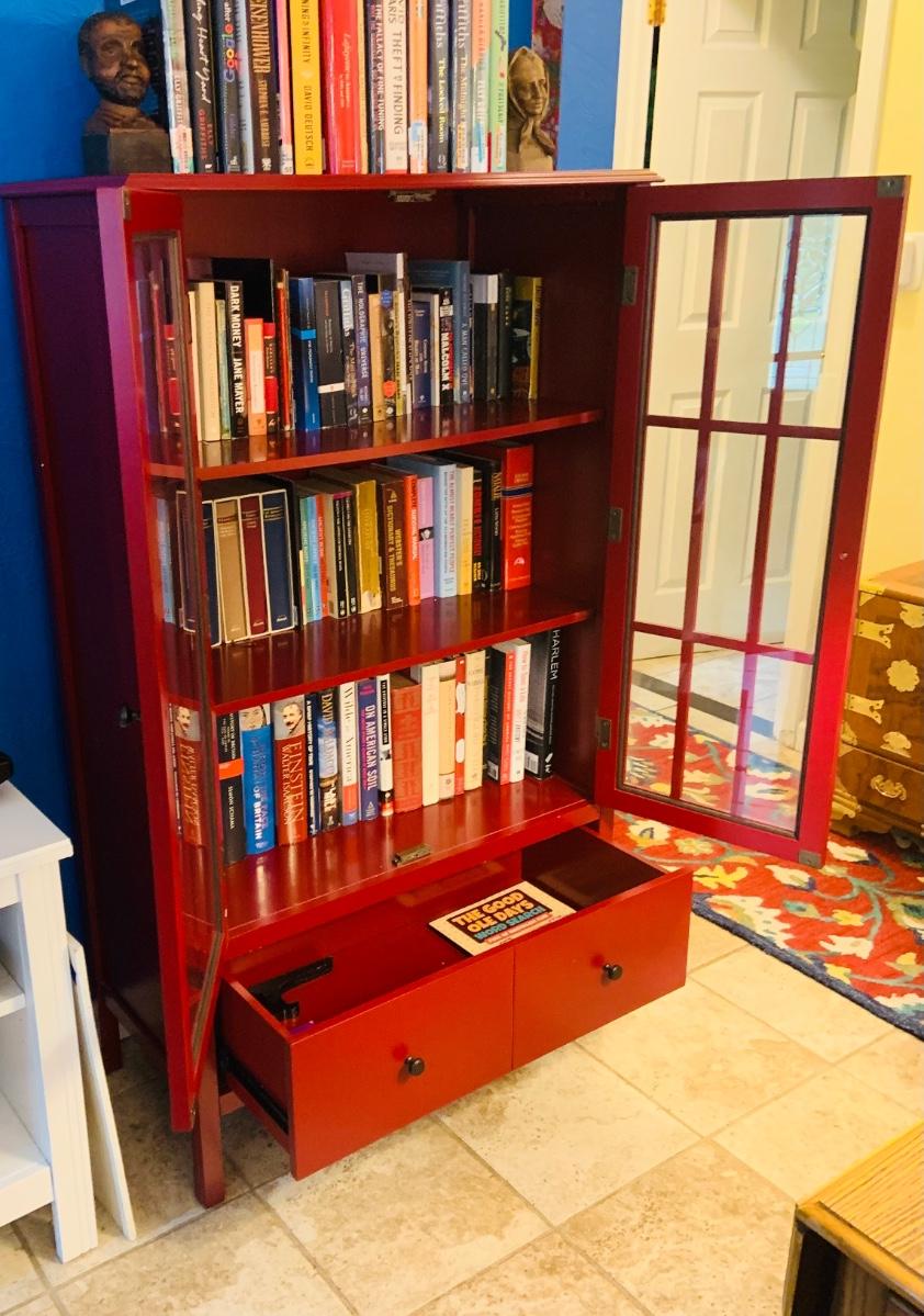LOT 330: Red Wooden Book Case with Drawer and Glass Front Doors Books, and Book Ends