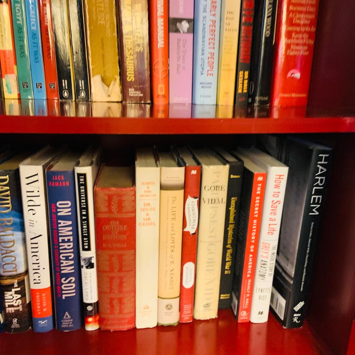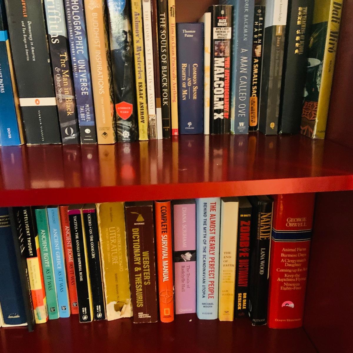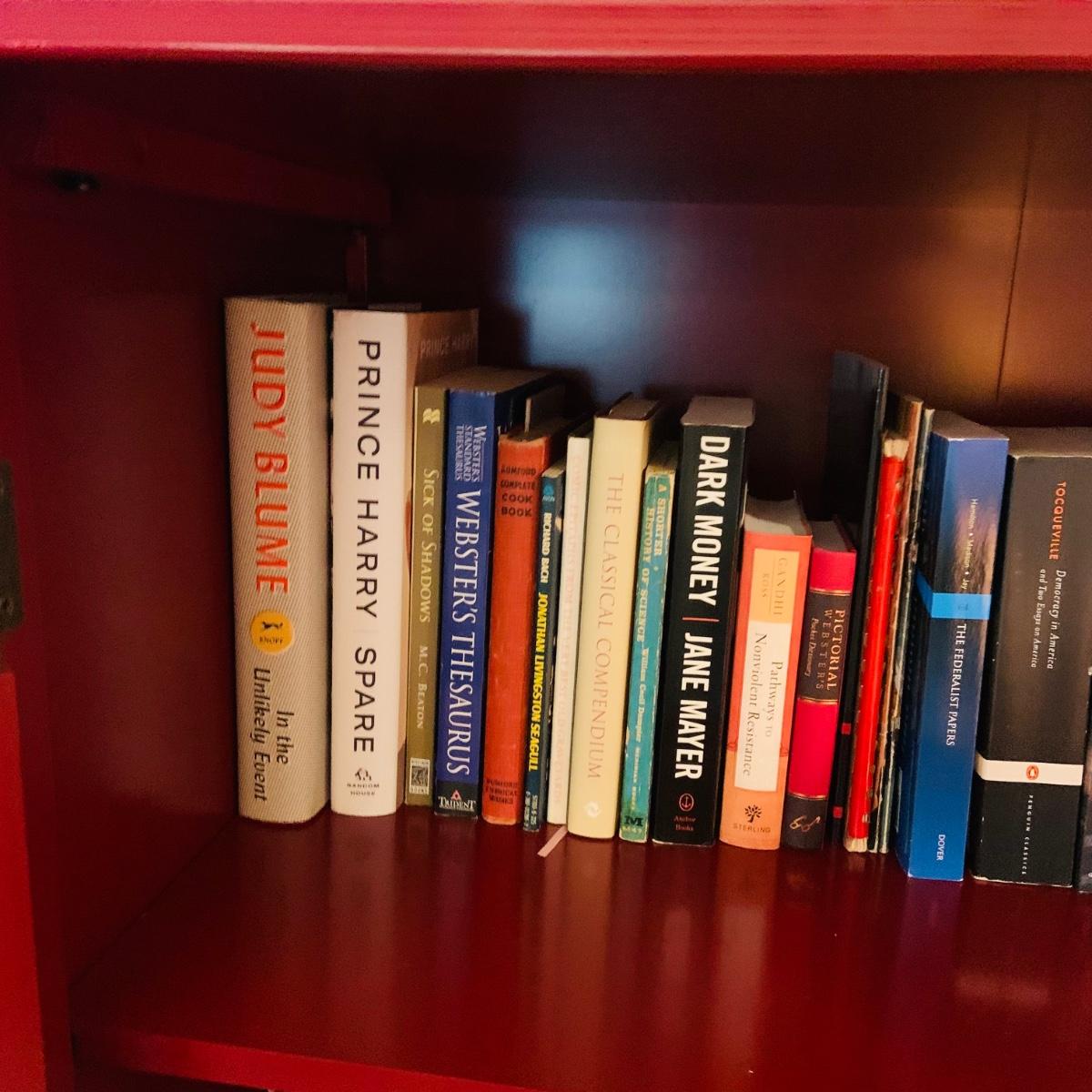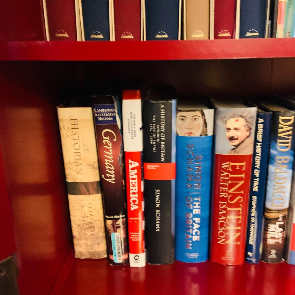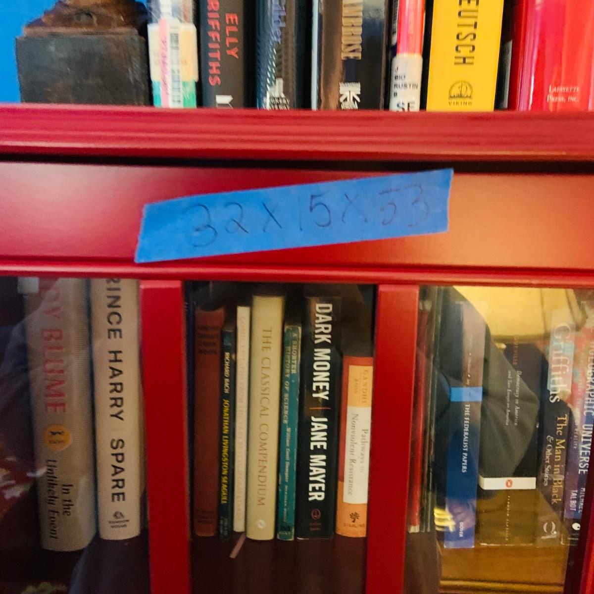 LOT 330: Red Wooden Book Case with Drawer and Glass Front Doors Books, and Book Ends