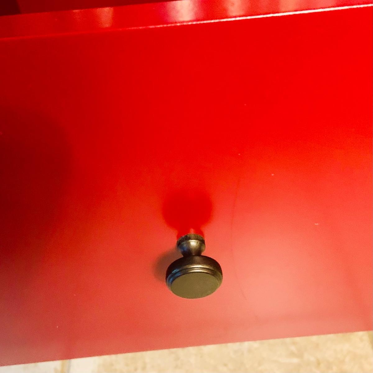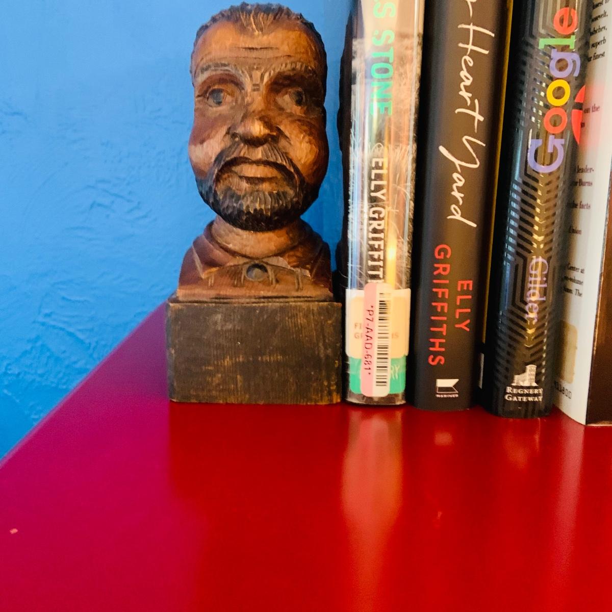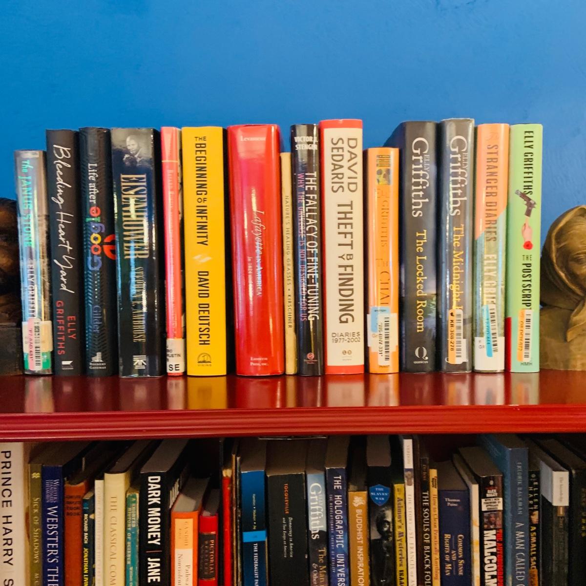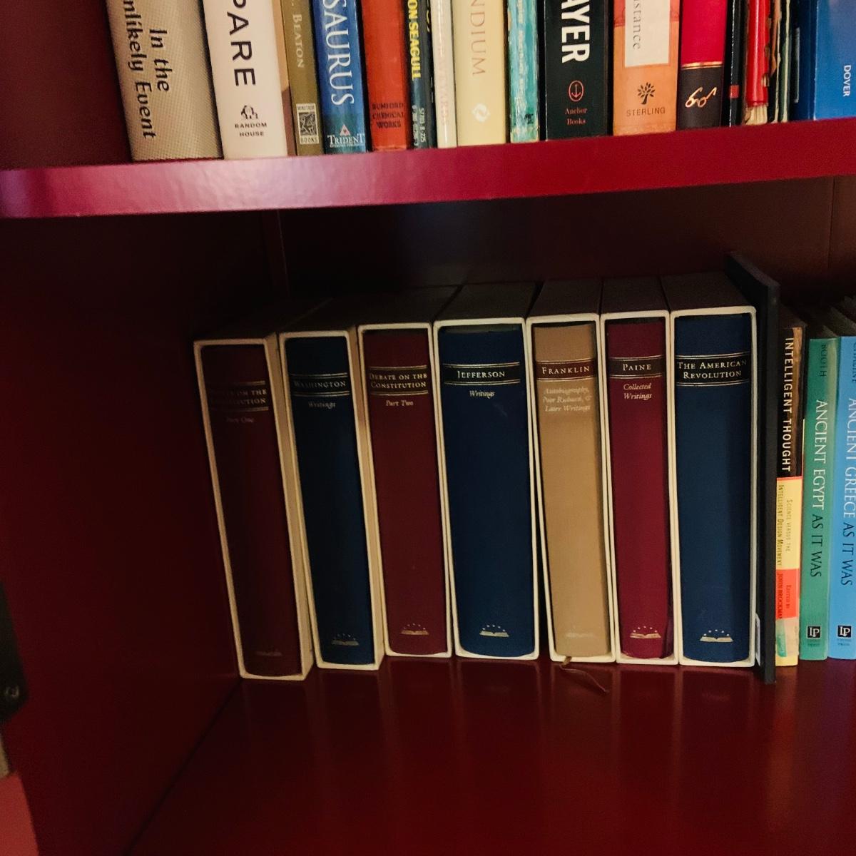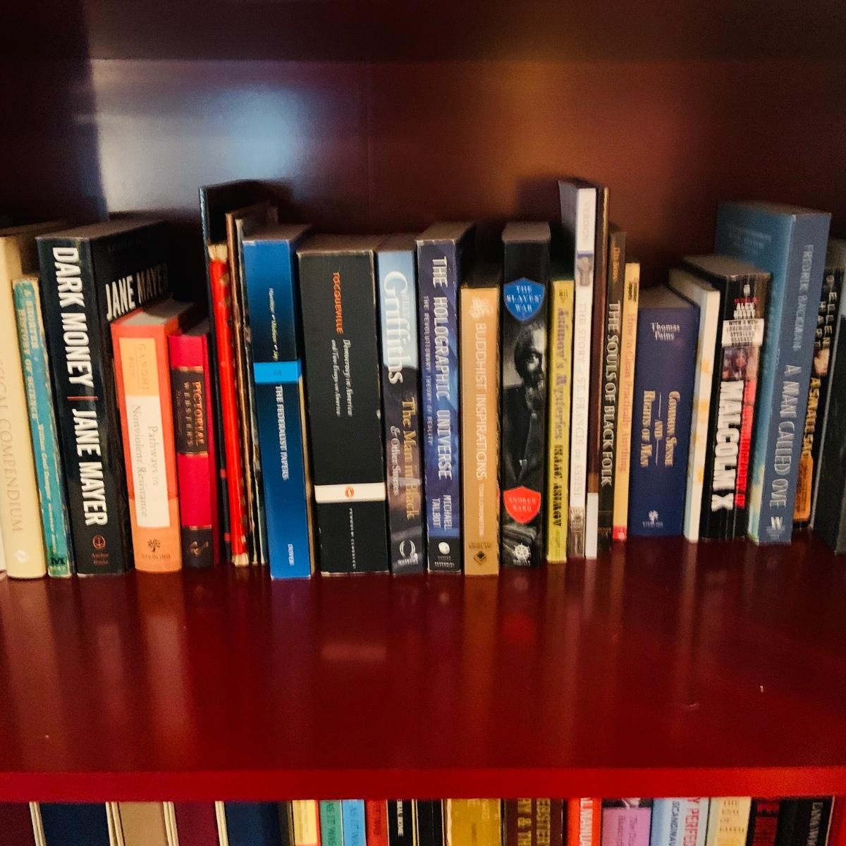 LOT 330: Red Wooden Book Case with Drawer and Glass Front Doors Books, and Book Ends
