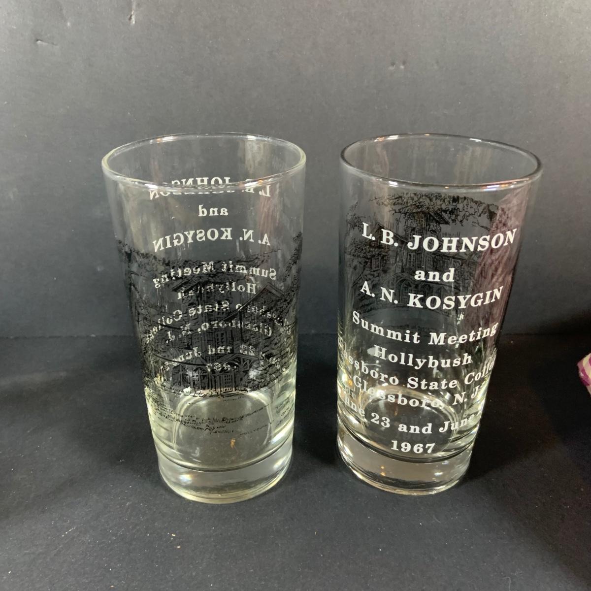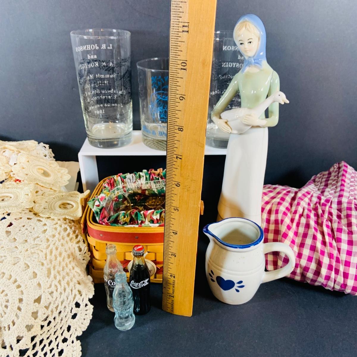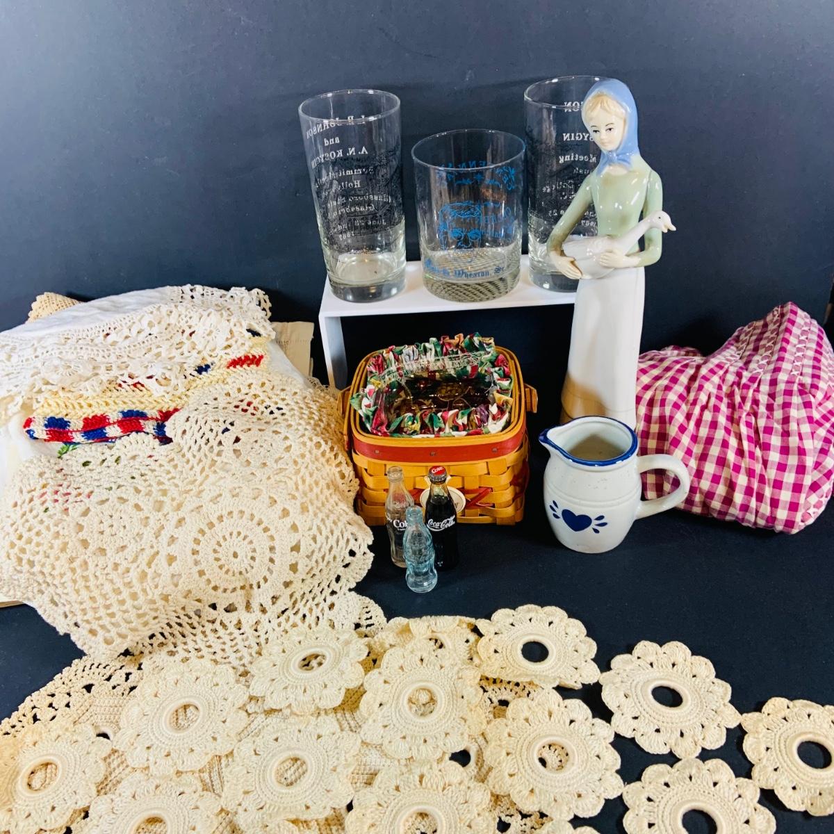 LOT335: Glassboro State Glasses, Wheaton Glass, Longaberger Basket, Table Linens Mini Coke Bottles and More