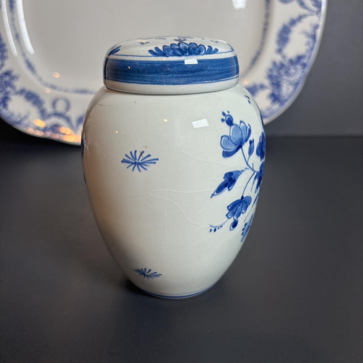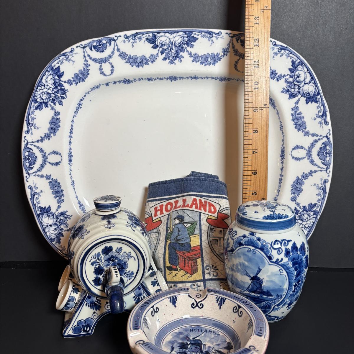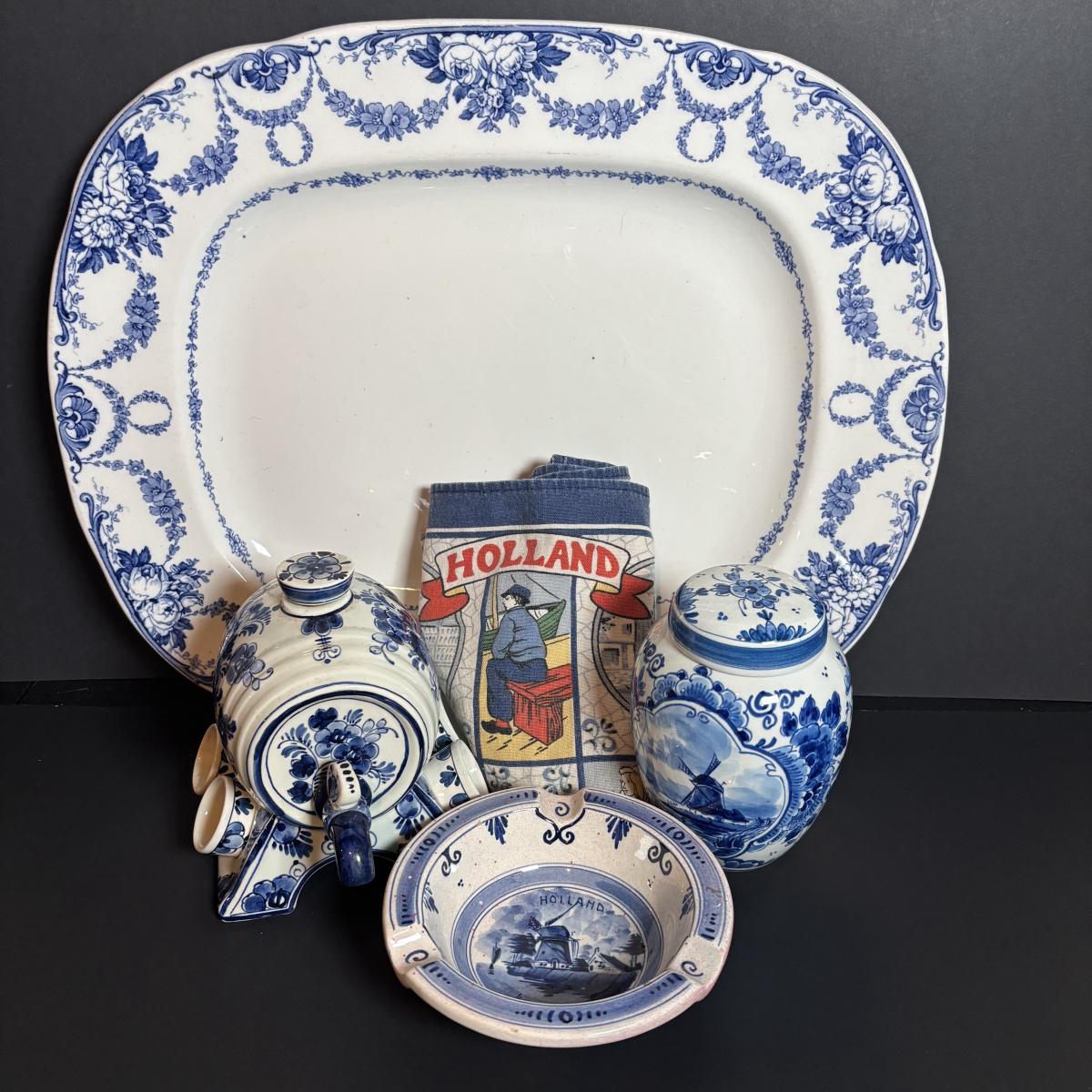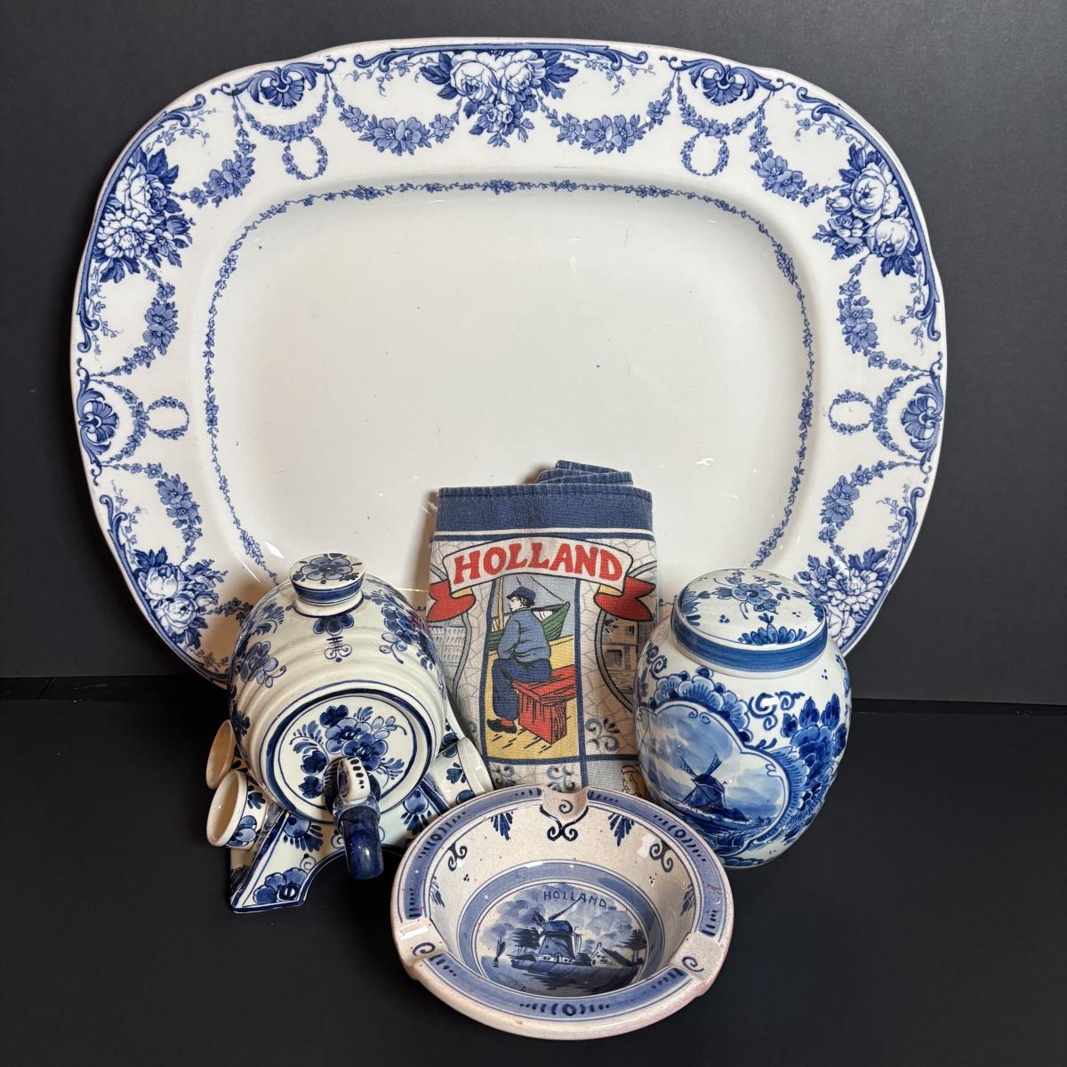 LOT 363: Wedgewood Grosvenor Blue Swag Pattern Platter and Delft Blue Decanter/Jug Set, Tea Caddy & Ashtray