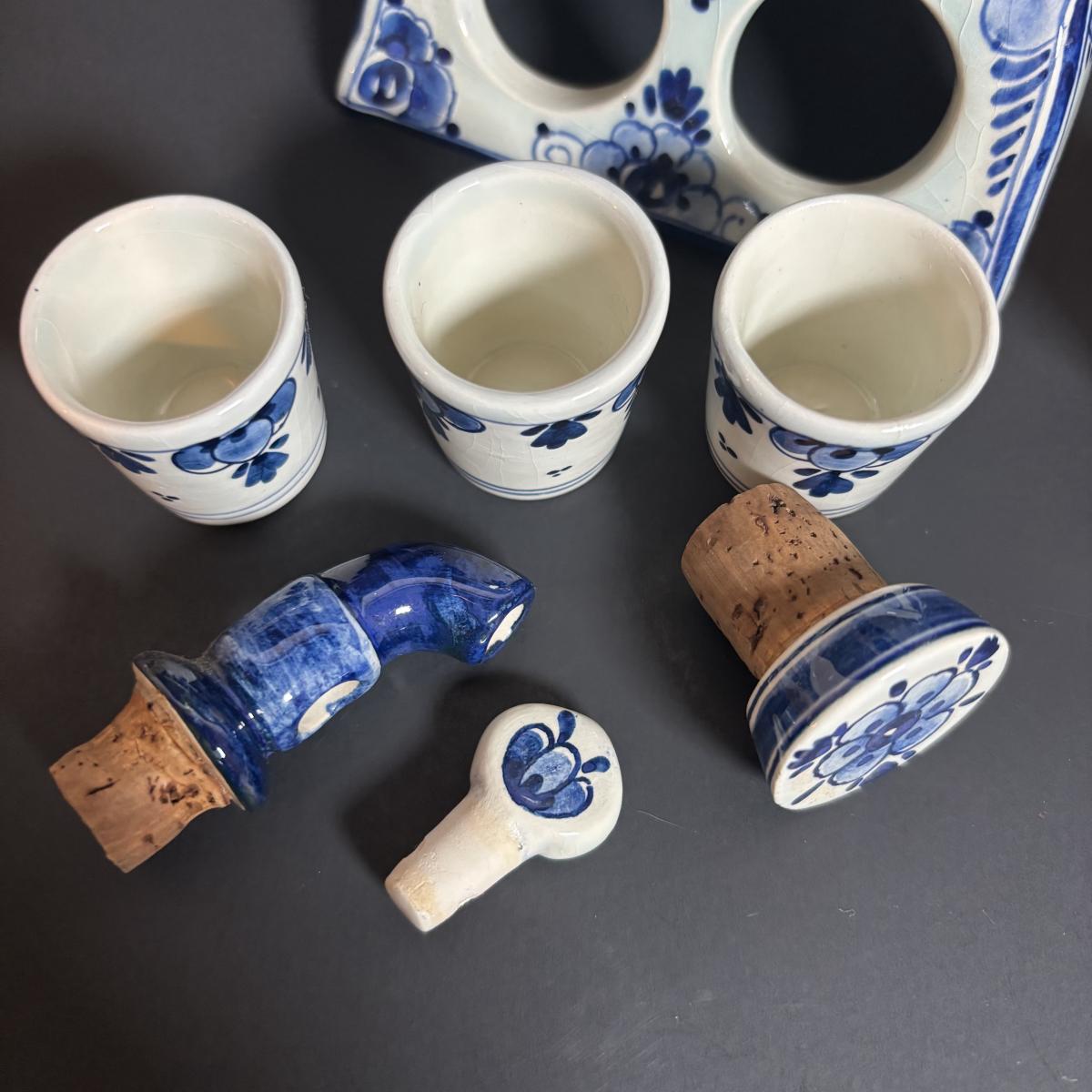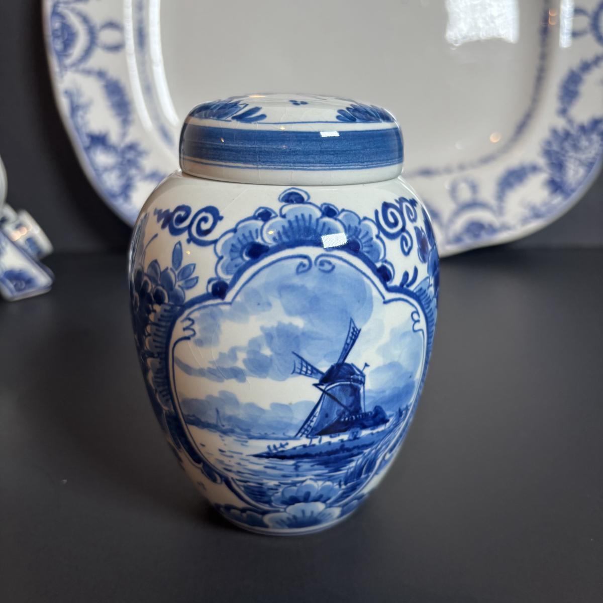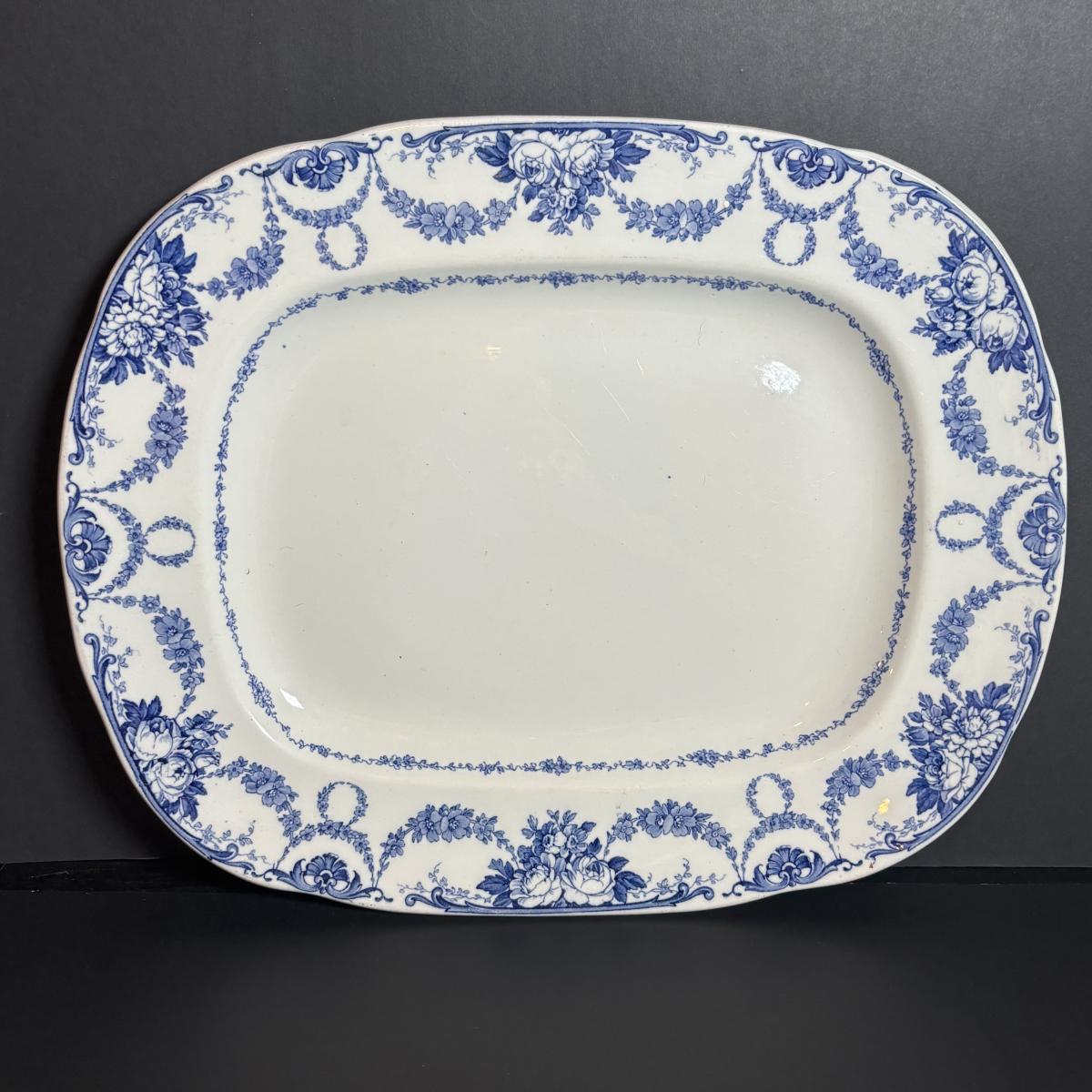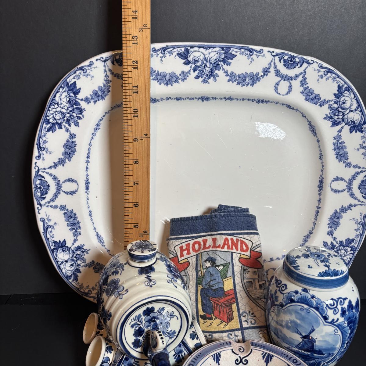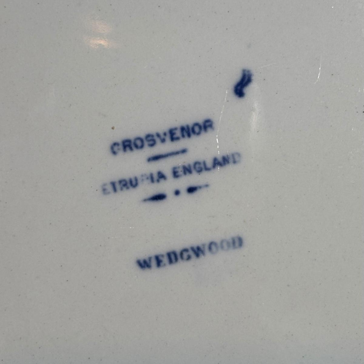LOT 363: Wedgewood Grosvenor Blue Swag Pattern Platter and Delft Blue Decanter/Jug Set, Tea Caddy & Ashtray
