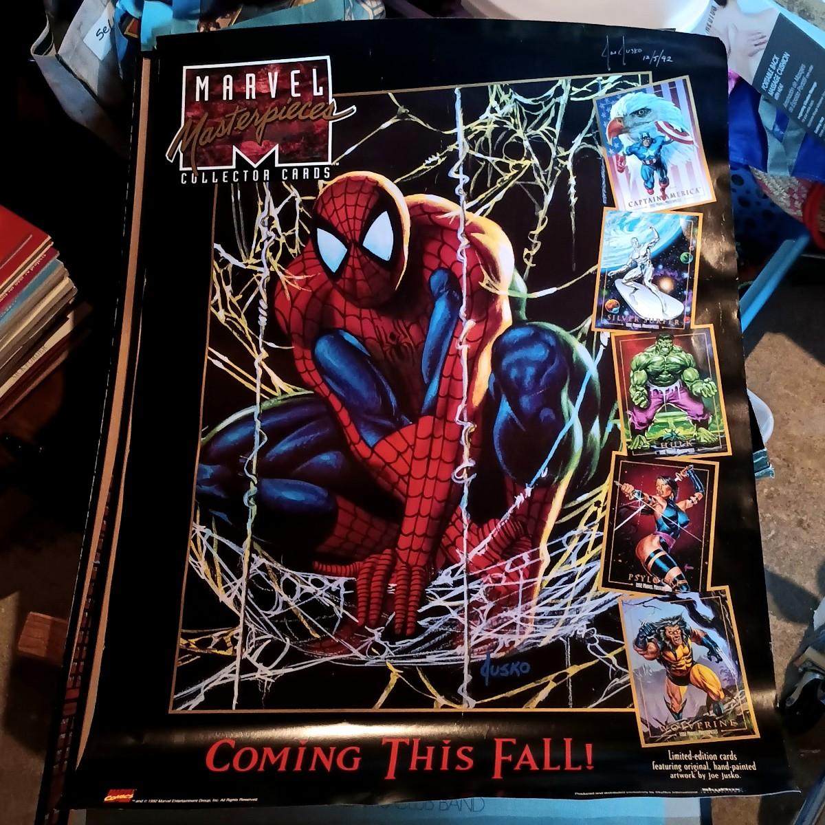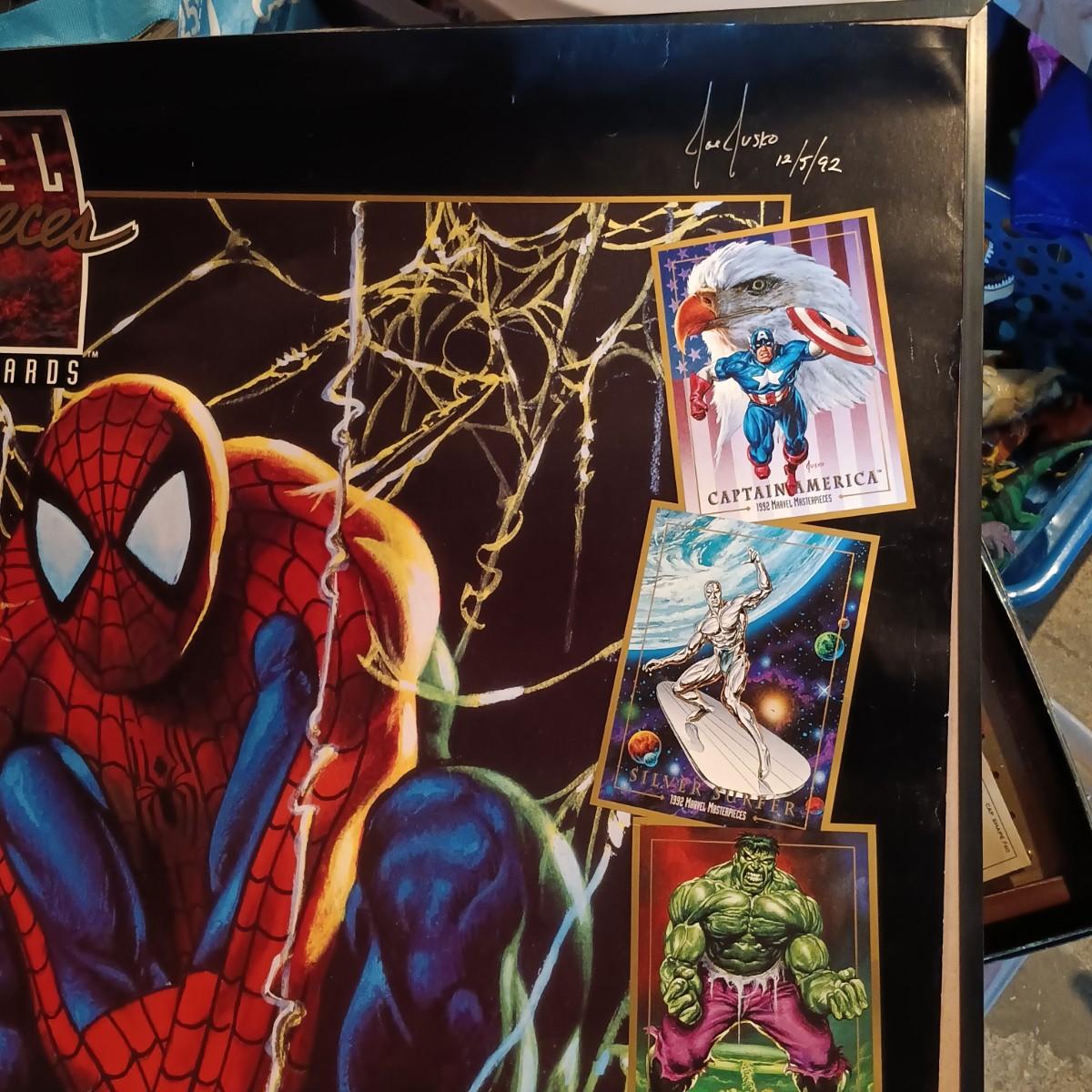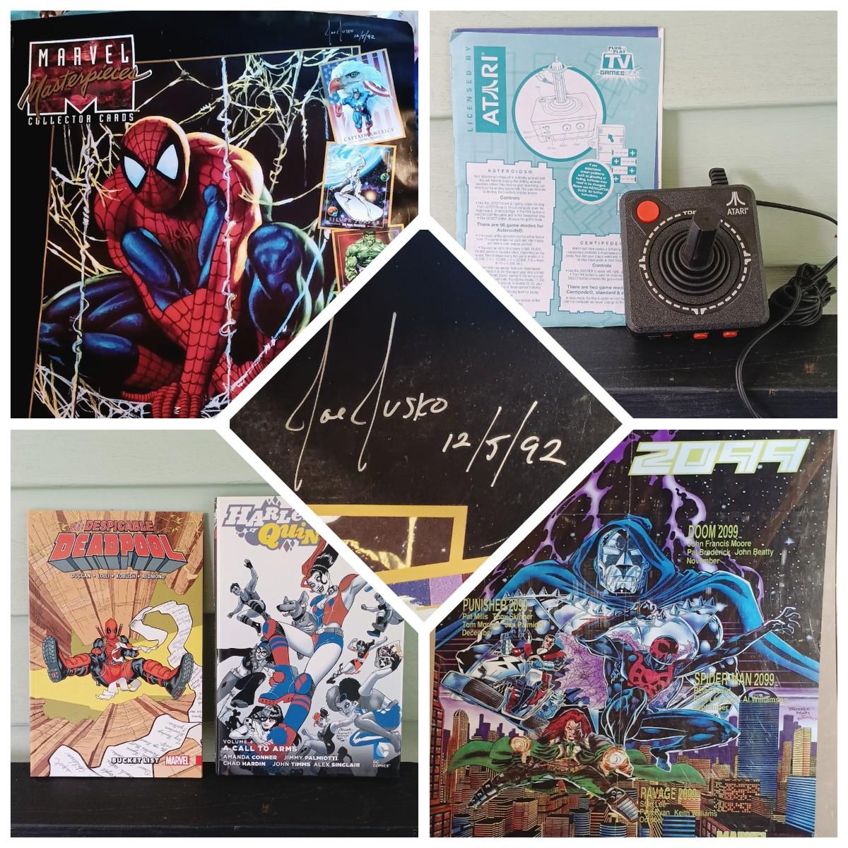 LOT 365: Signed Joe Jusko Marvel Collector Cards Promotional Poster, Marvel Comics 2099 Promotional Poster, Deadpool and Harley Quinn Comics & Atari TV Gam