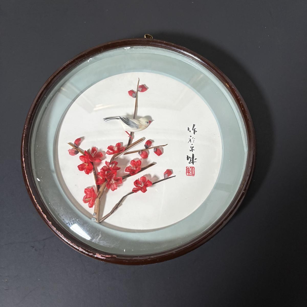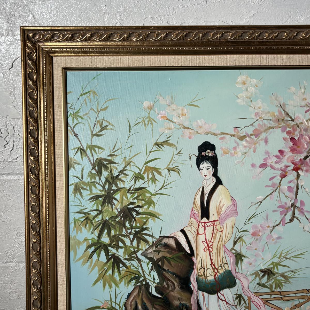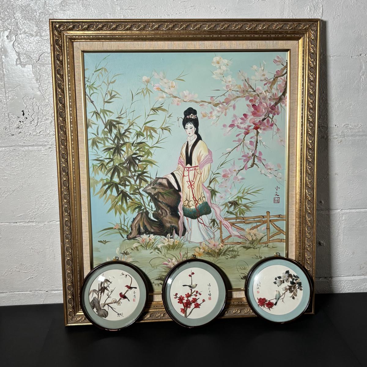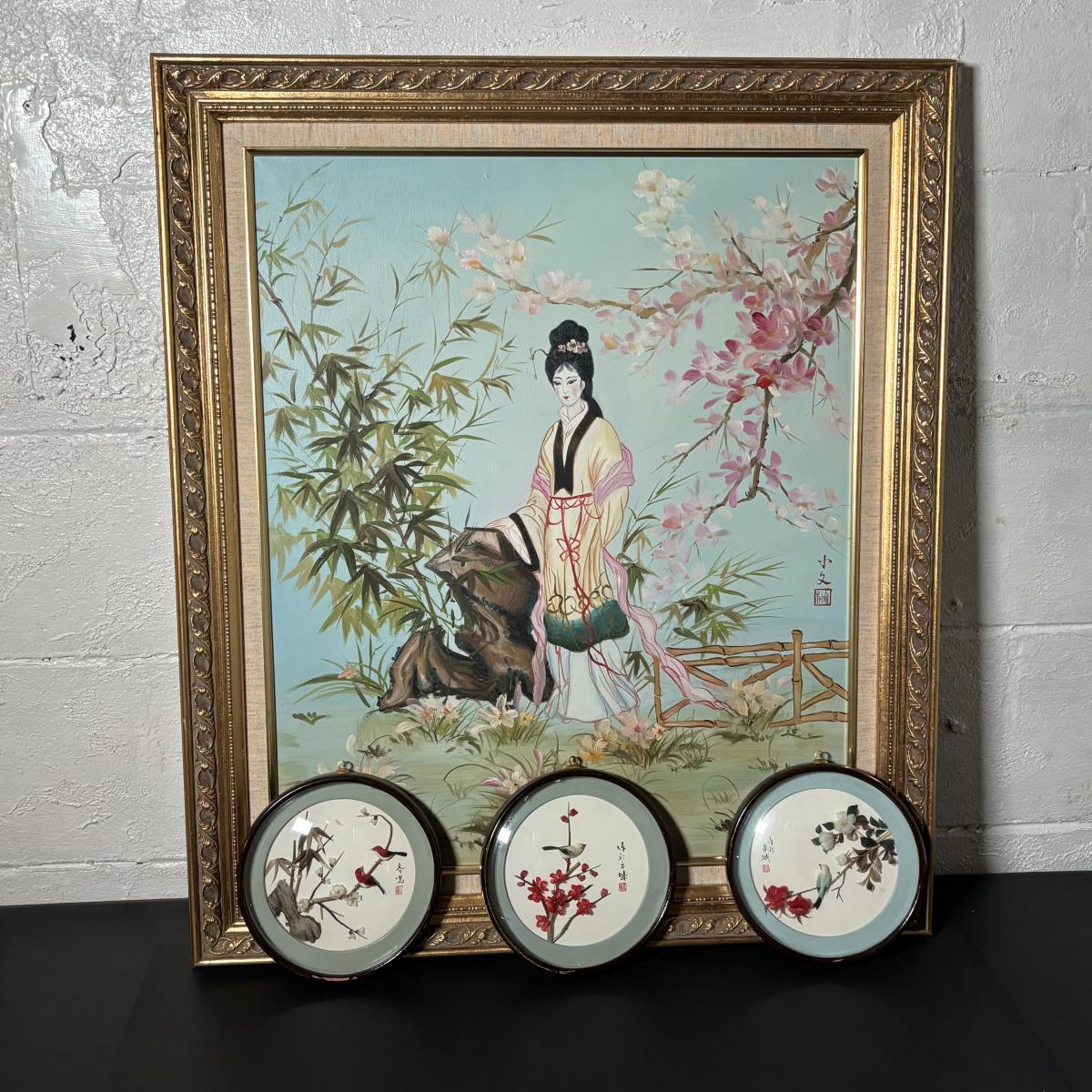 LOT 382: Home Decor Geisha Girl Print on Canvas & Set of 3 Round Japanese 3D Art Shadow Boxes