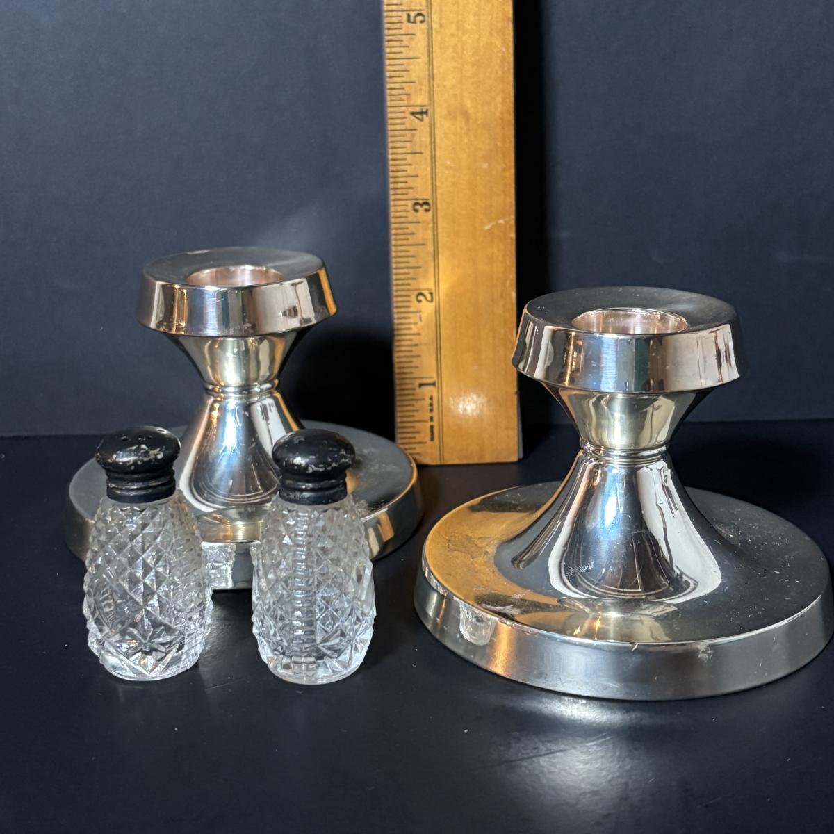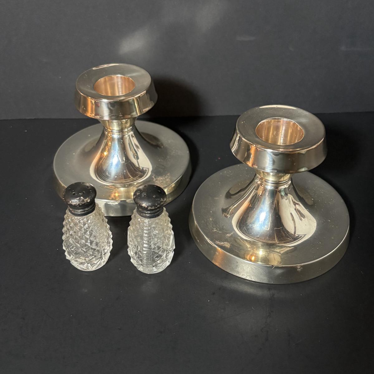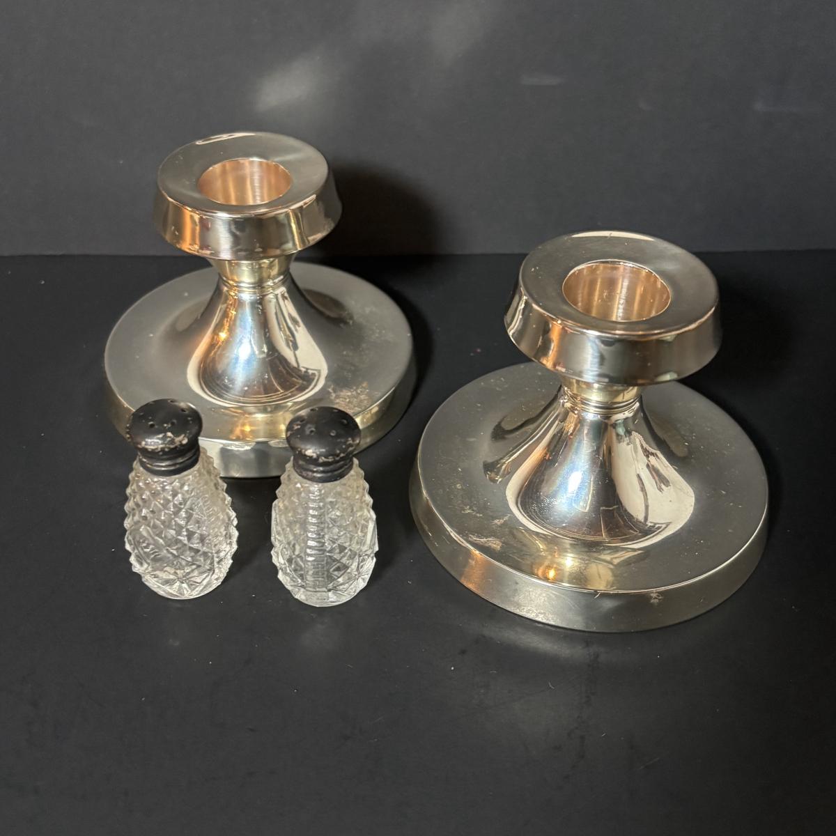 LOT 406: Weighted Sterling Silver Candle Holders & Crystal Salt/Pepper Shakers w/Sterling Silver Tops