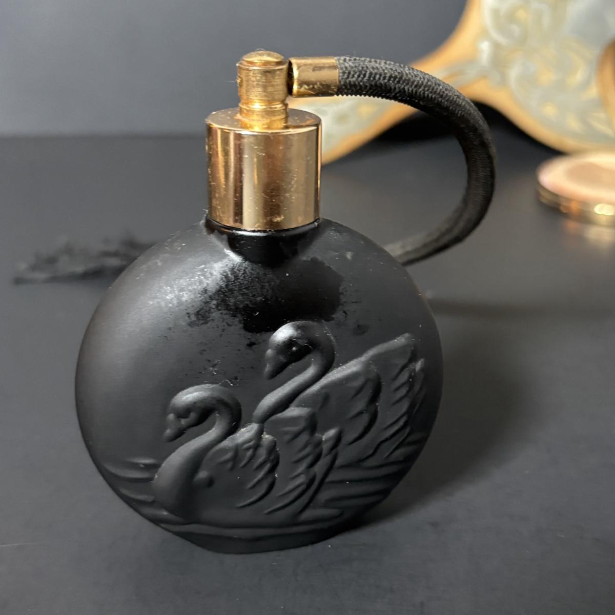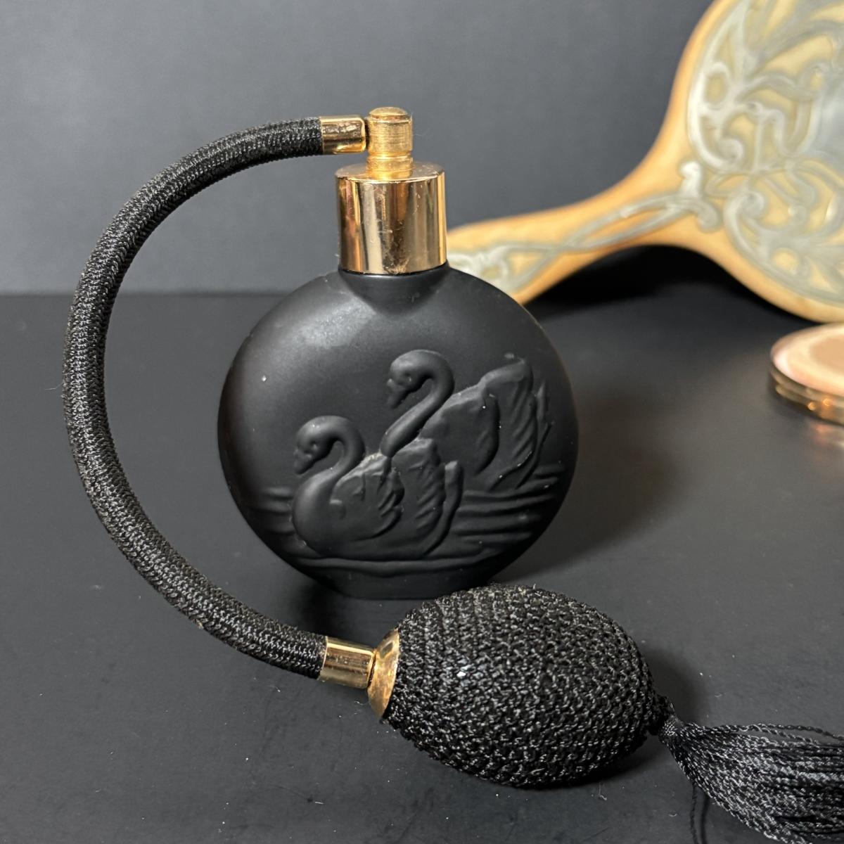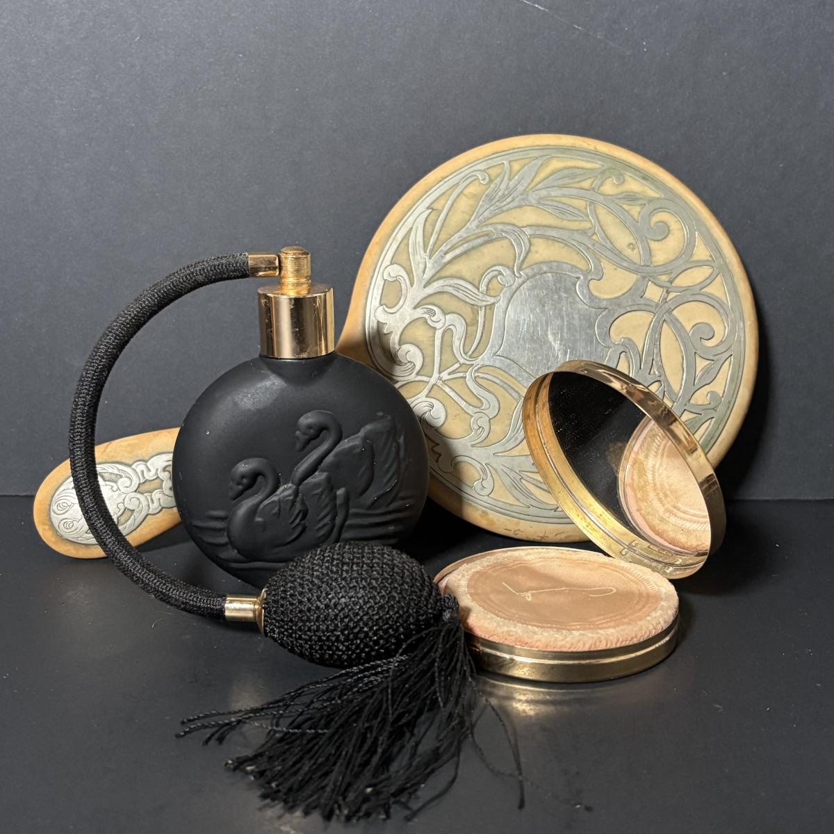 LOT 414: Vintage Art Nouveau Hand Mirror, Black Glass Atomizer w/Swans & Compact