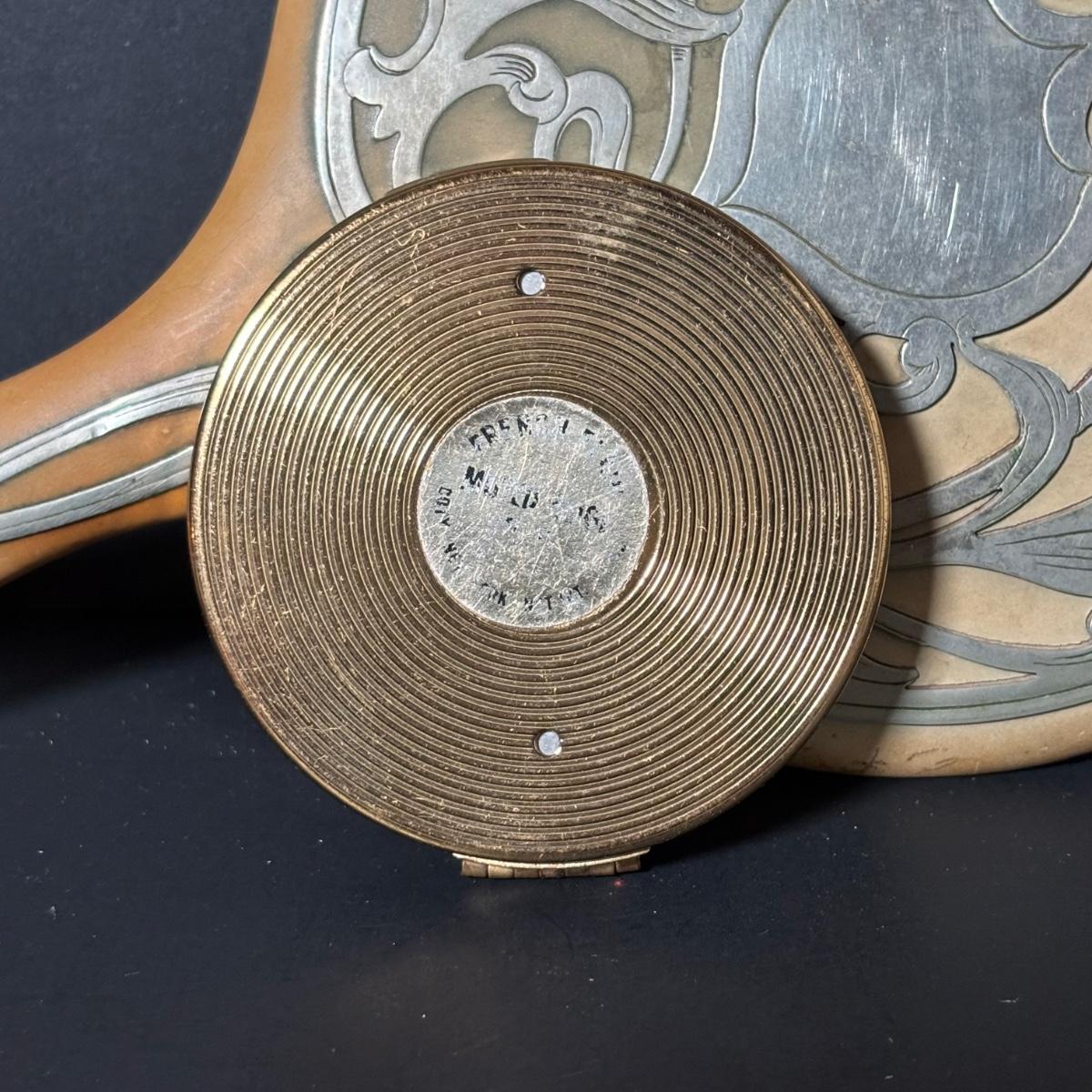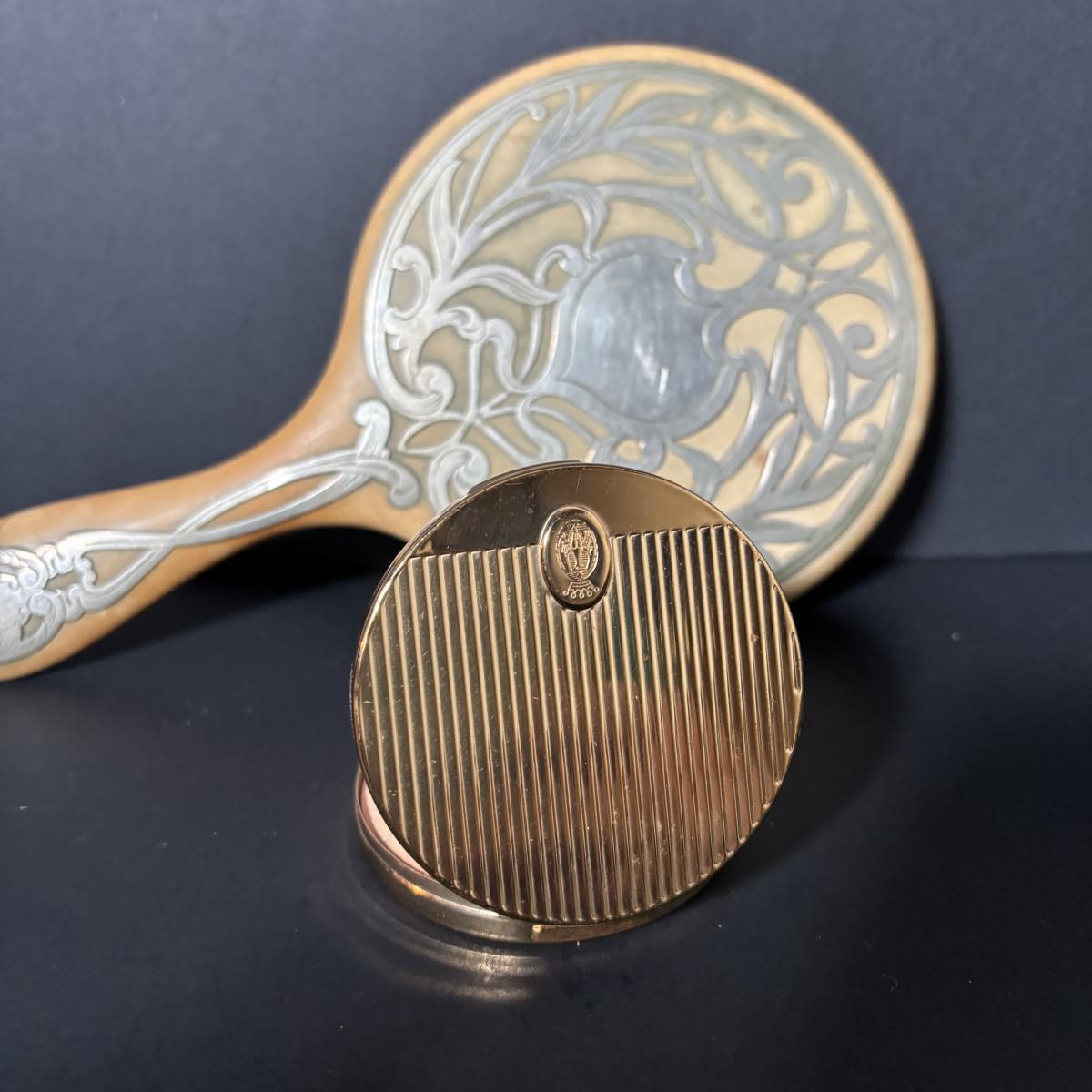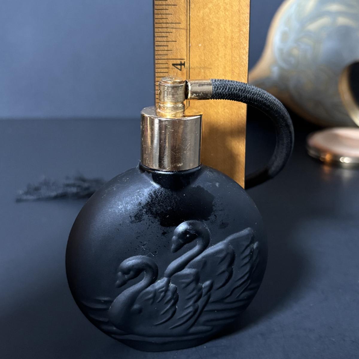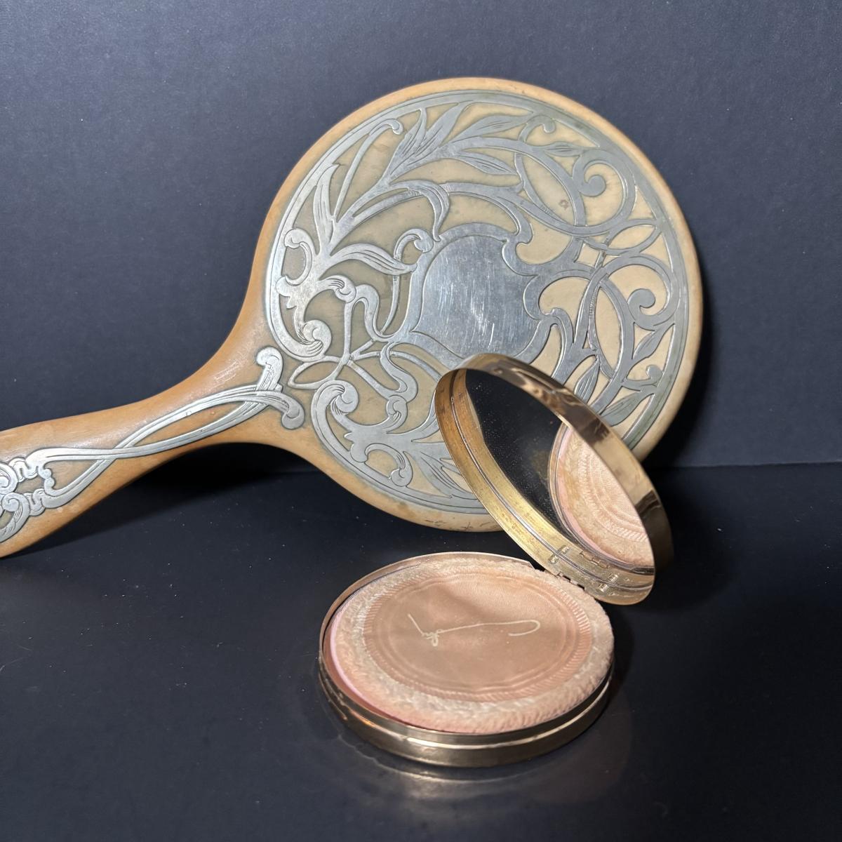 LOT 414: Vintage Art Nouveau Hand Mirror, Black Glass Atomizer w/Swans & Compact