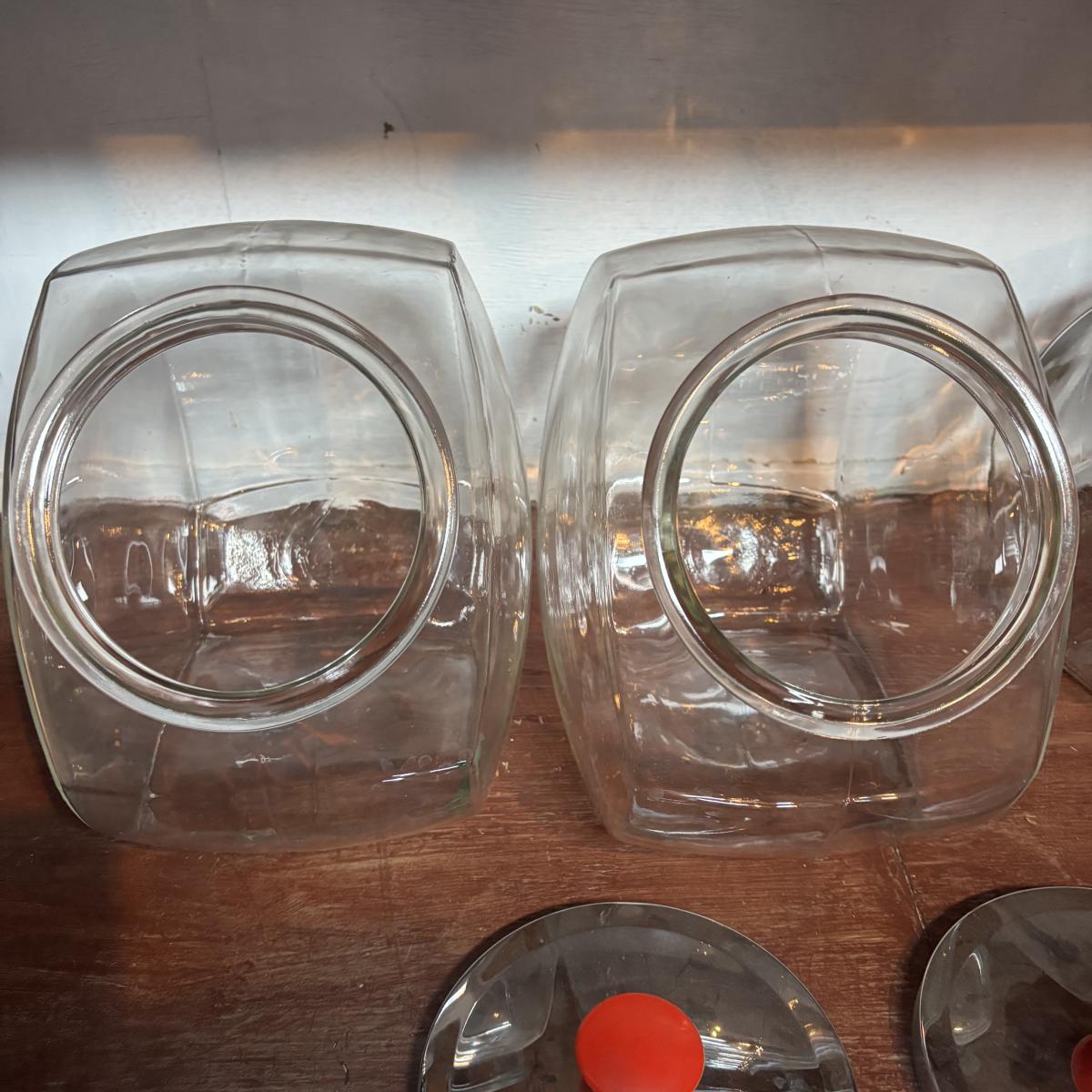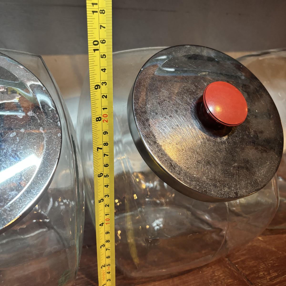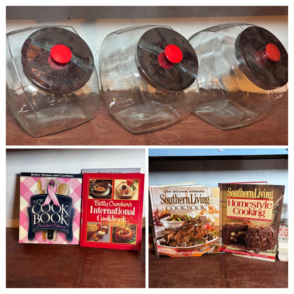 LOT 277-429: Set of Large Clear Glass Tilted Candy/Cookie Jar with Metal Lids & Red Knobs, Southern Living, Betty Crocker Cookbooks & More