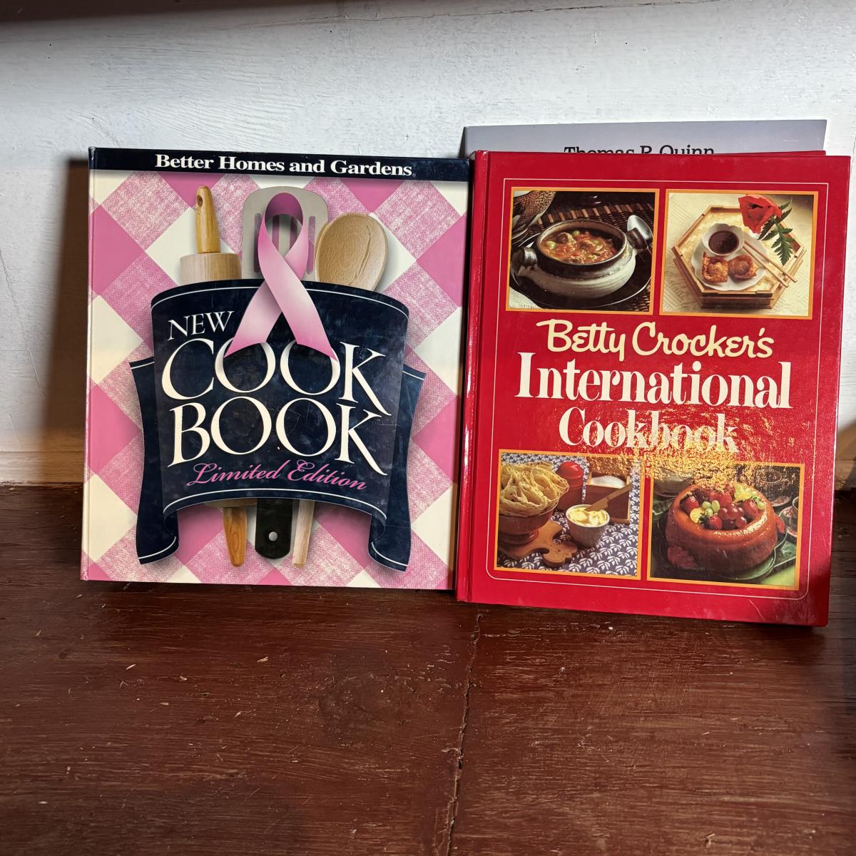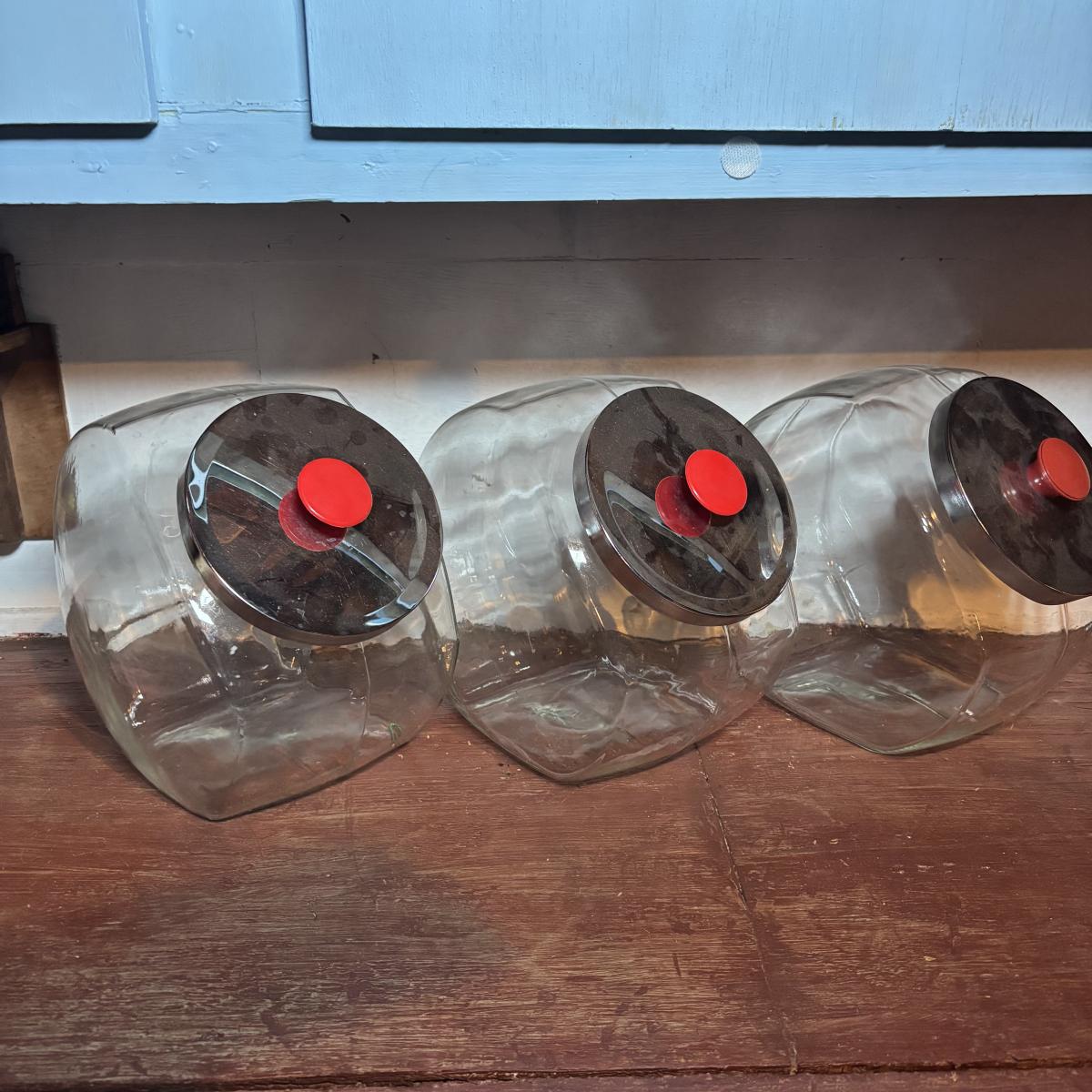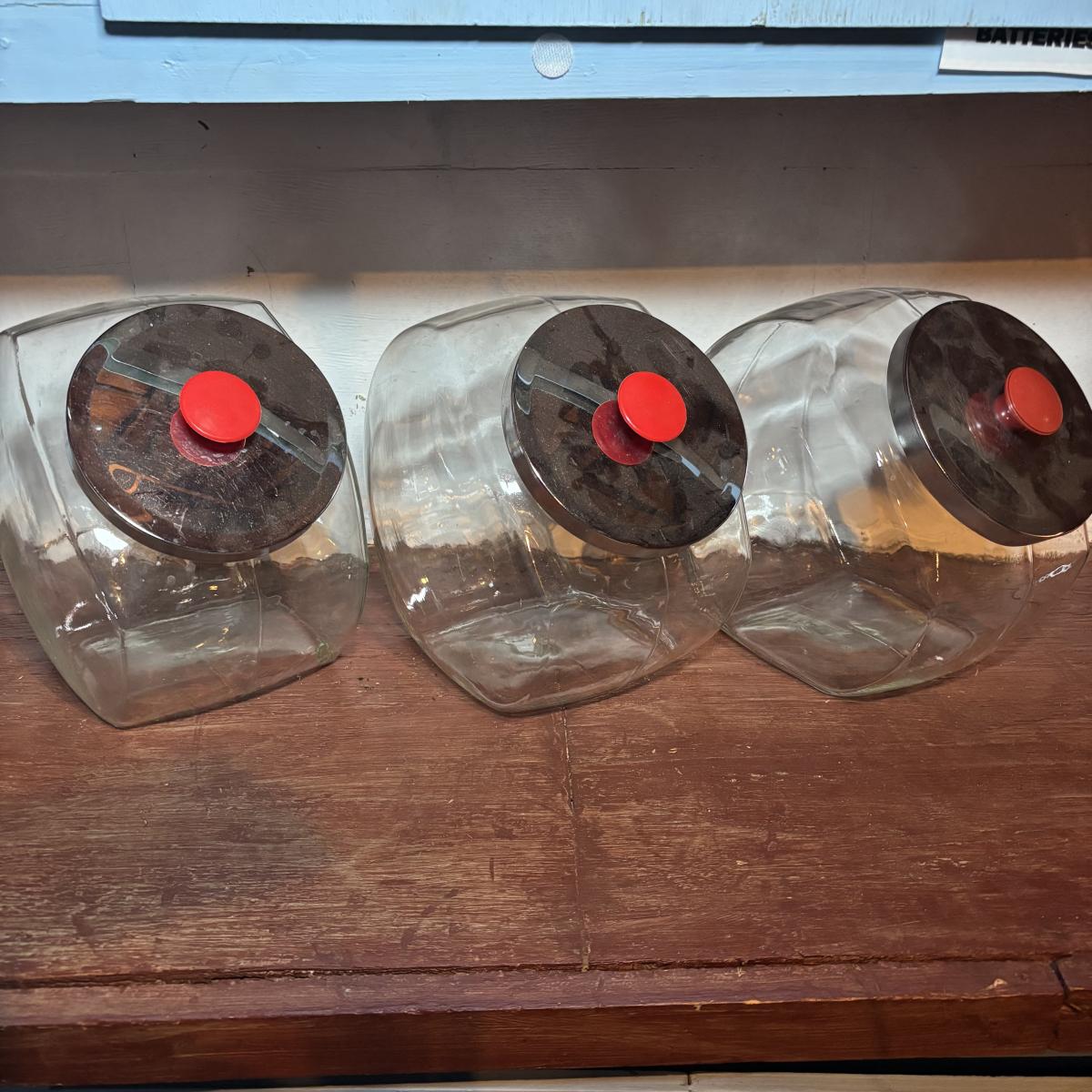 LOT 277-429: Set of Large Clear Glass Tilted Candy/Cookie Jar with Metal Lids & Red Knobs, Southern Living, Betty Crocker Cookbooks & More