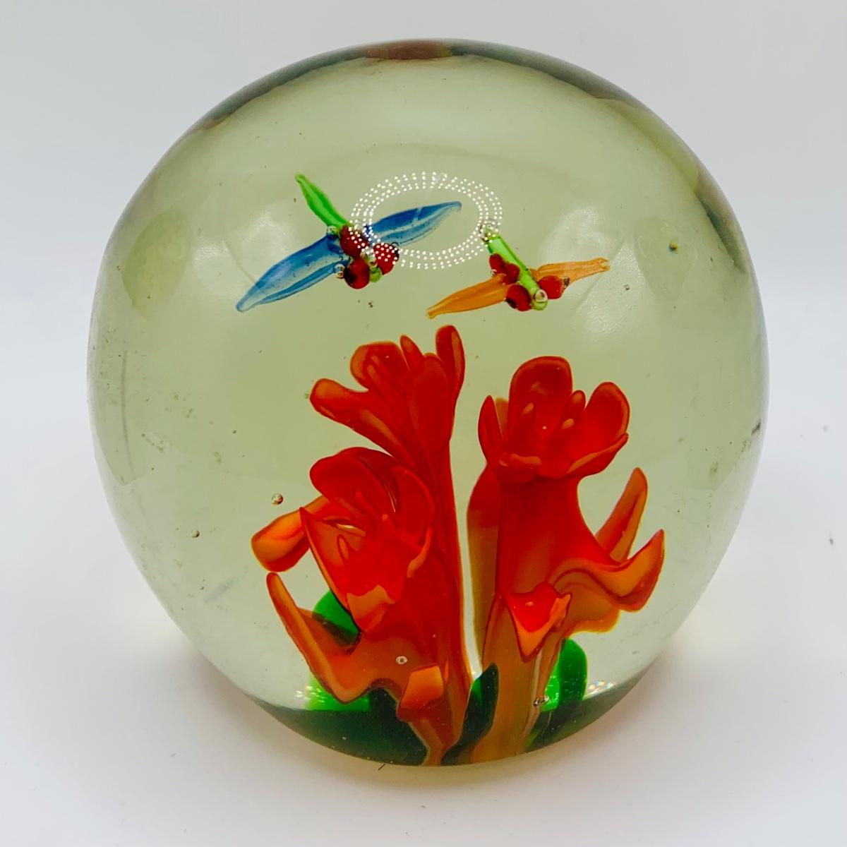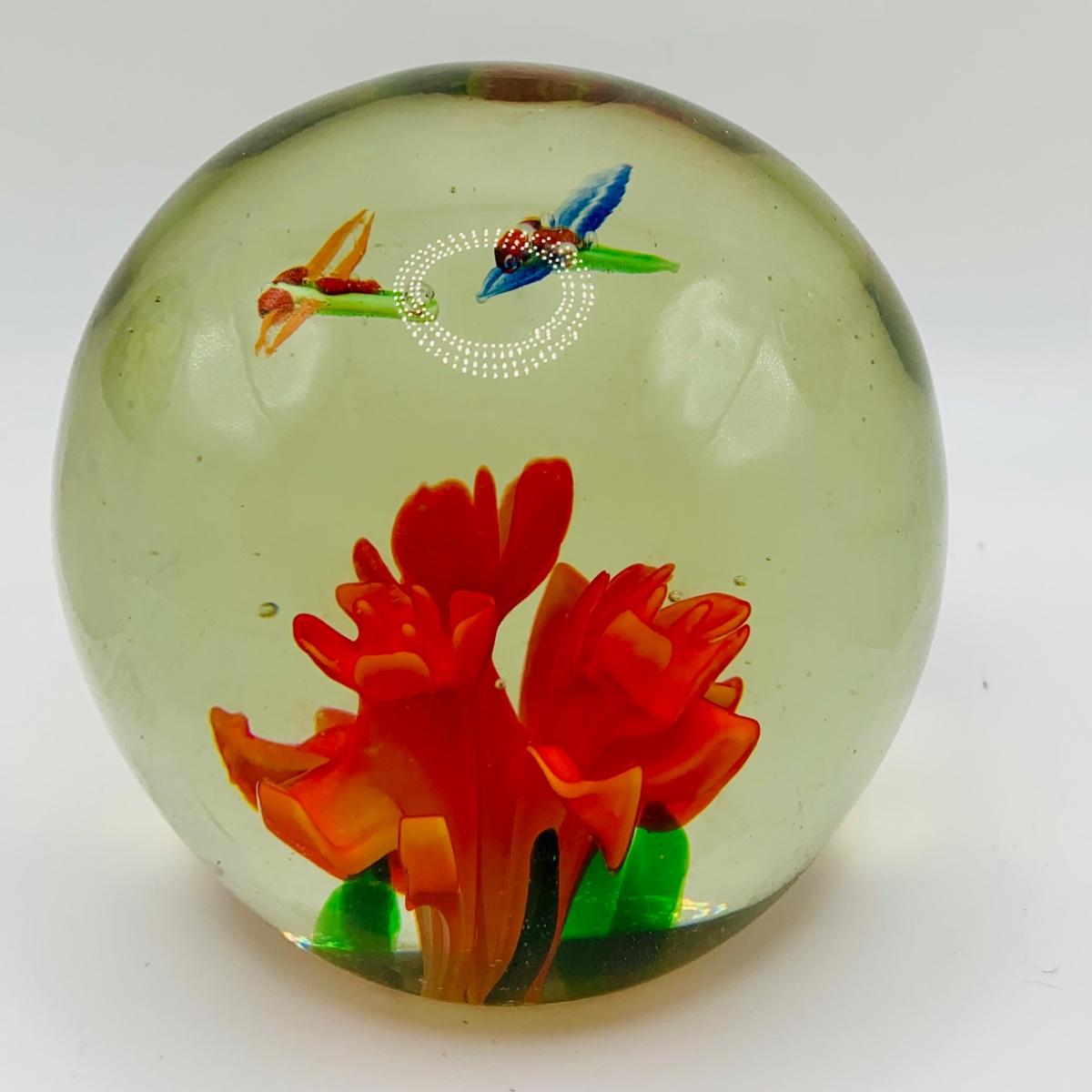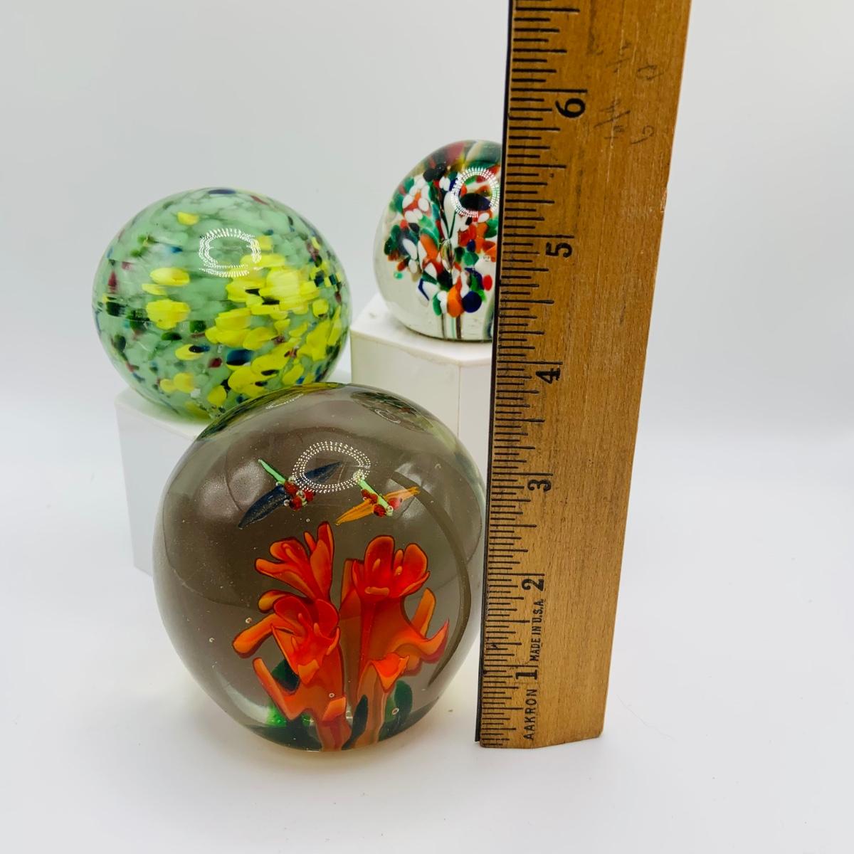 LOT 3: Collection of Three (3) Vintage Art Glass Paperweights Featuring a Dragonfly Floral Design and Confetti Style Designs