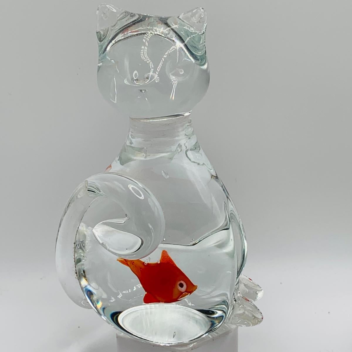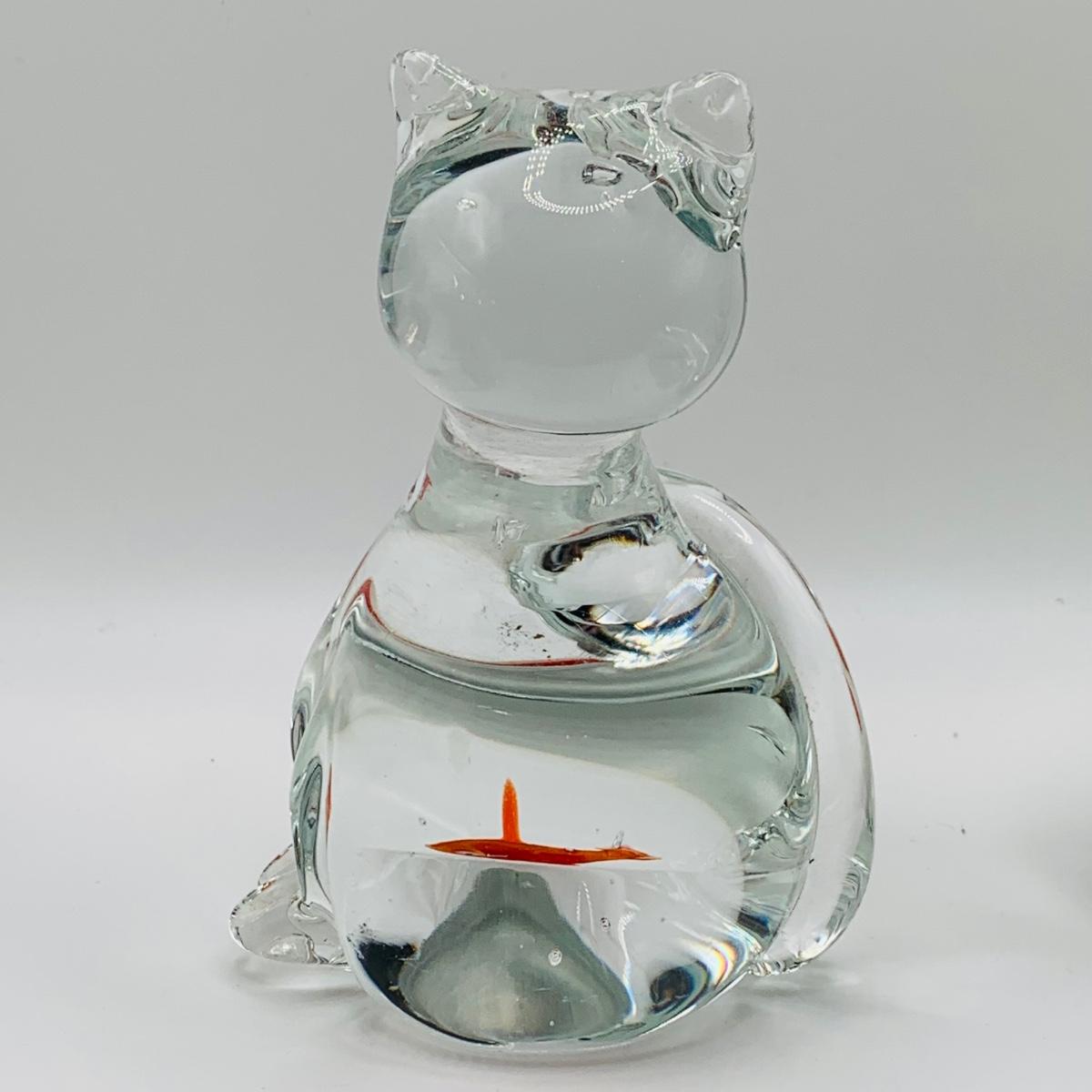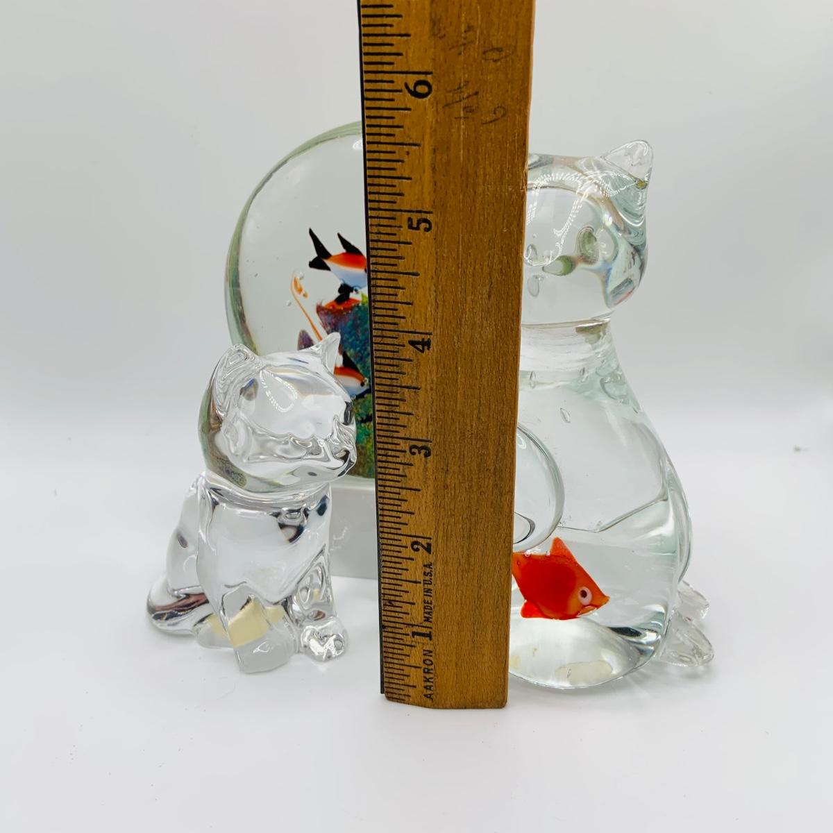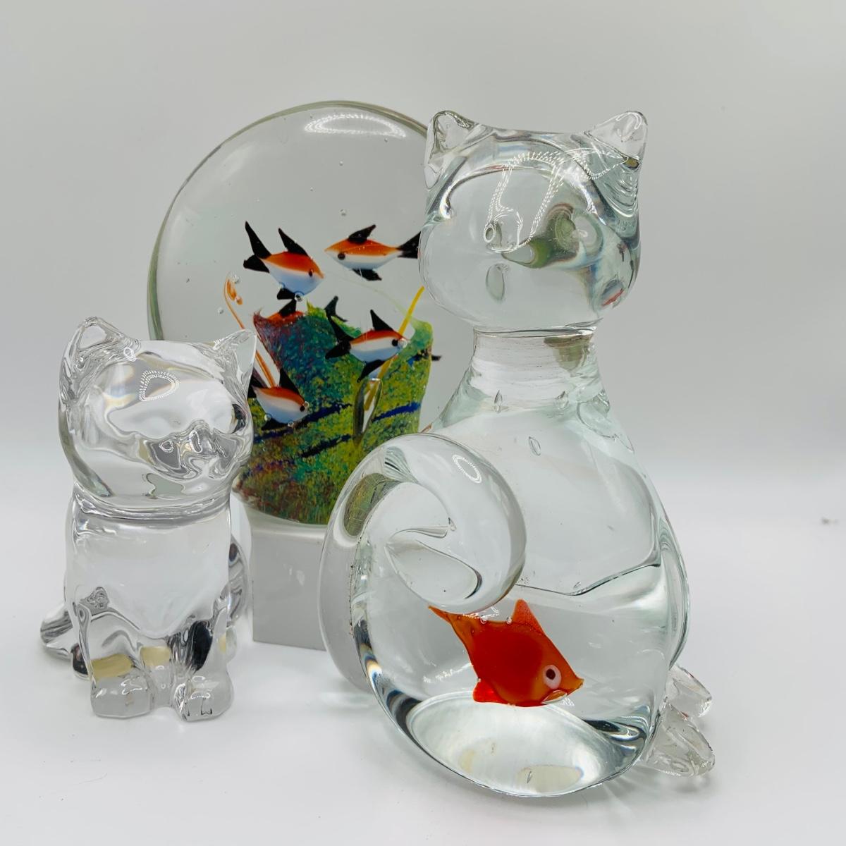 LOT 5: Art Glass Aquarium Paperweight, Maurano Style Art Glass Cat with Goldfish and a Princess House Art Glass Cat