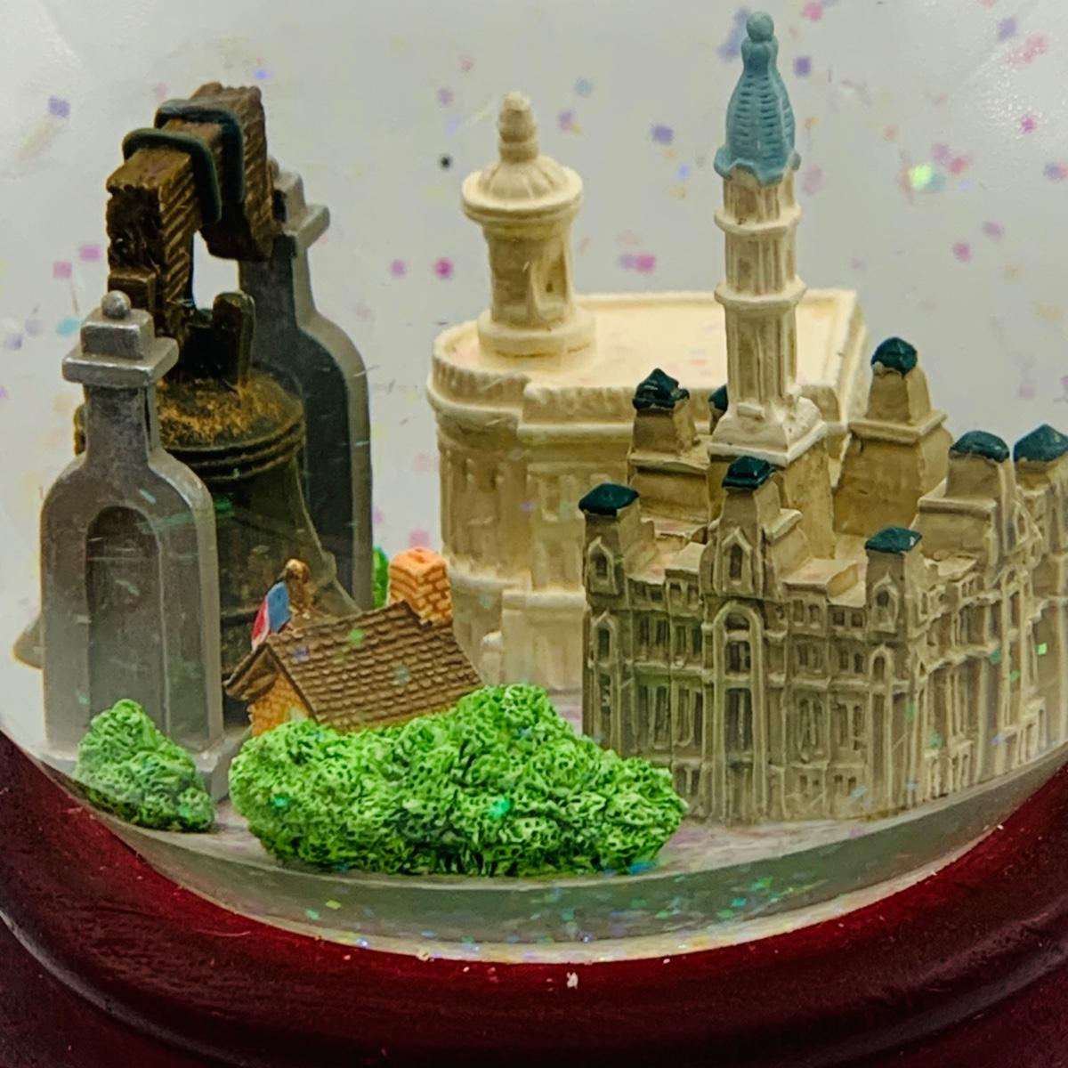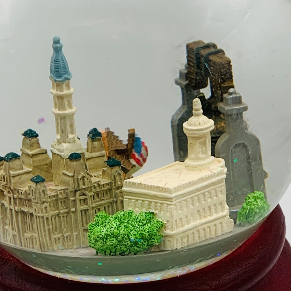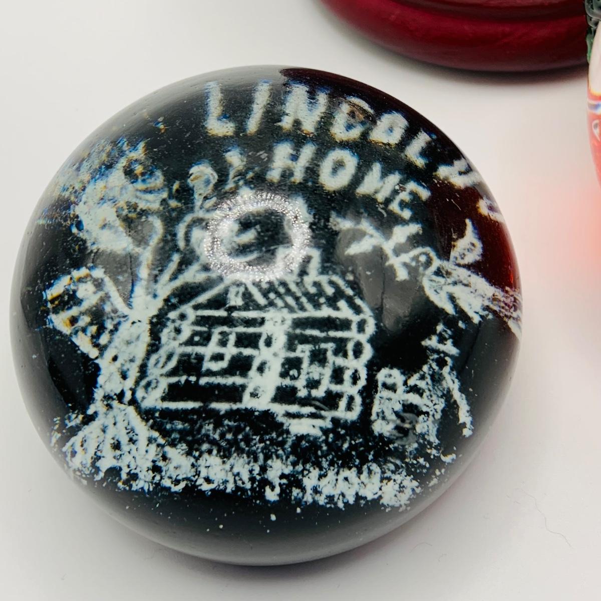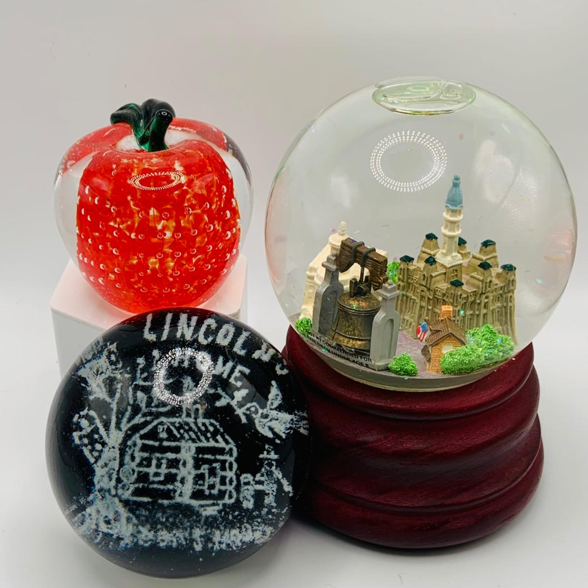 LOT 9: Lenox Glass Apple and Lincolns Home Glass Paperweight and a Philadelphia Snow Globe