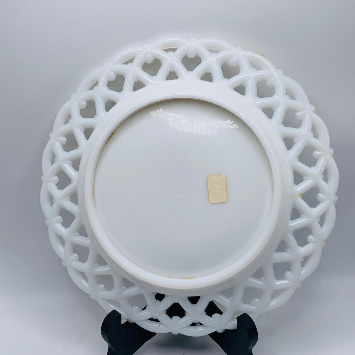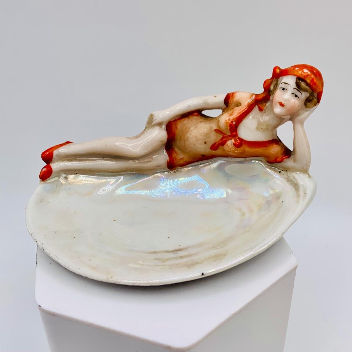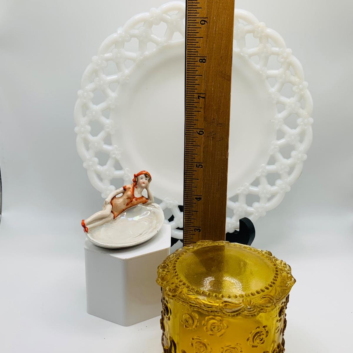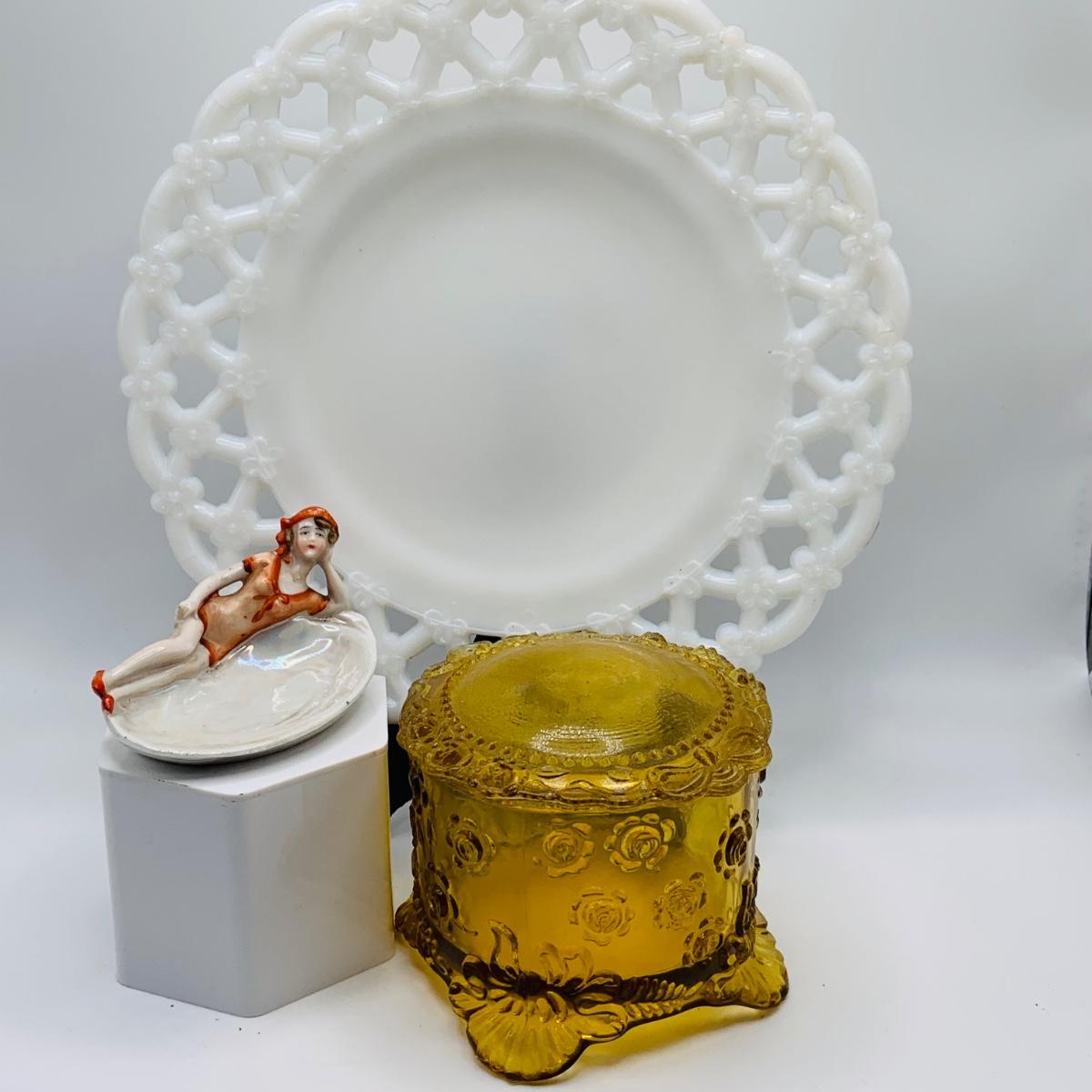 LOT 25: Kemble-Wheaton Glass Floral Glass Trinket Box, Westmorland Milk Glass Plate and Vintage Porcelain Ring Tray with a Bathing Beauty