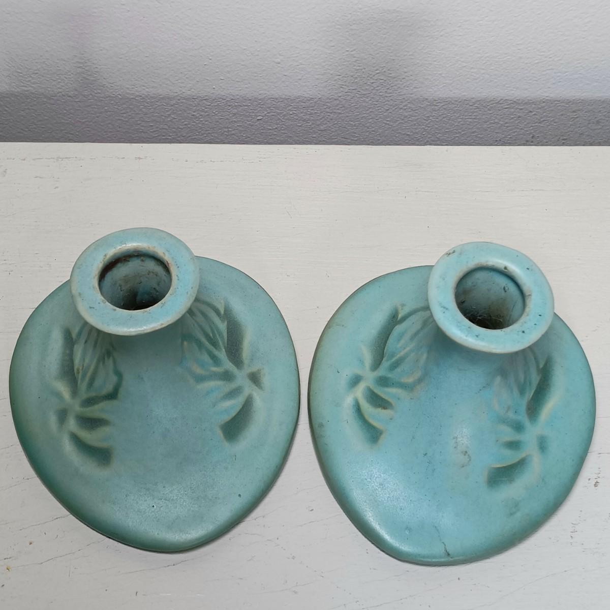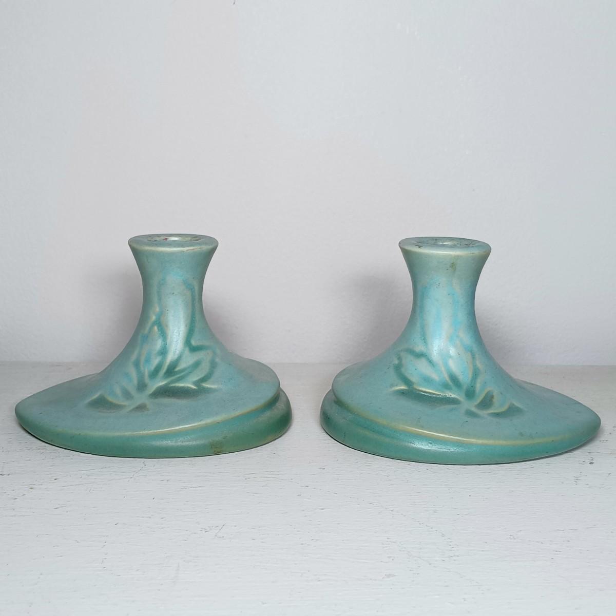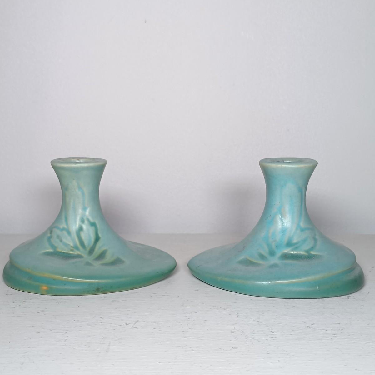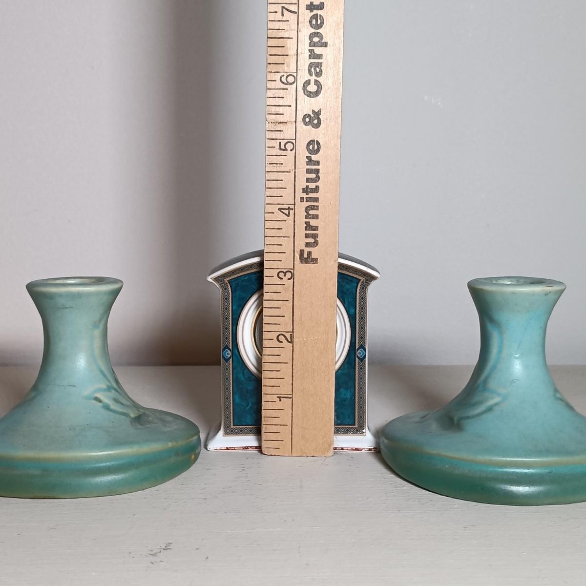 LOT 47: Pair of Roseville Pottery Blue Silhouette Candleholders with Royal Doulton Biltmore Miniature Mantel Clock
