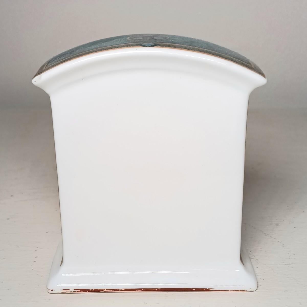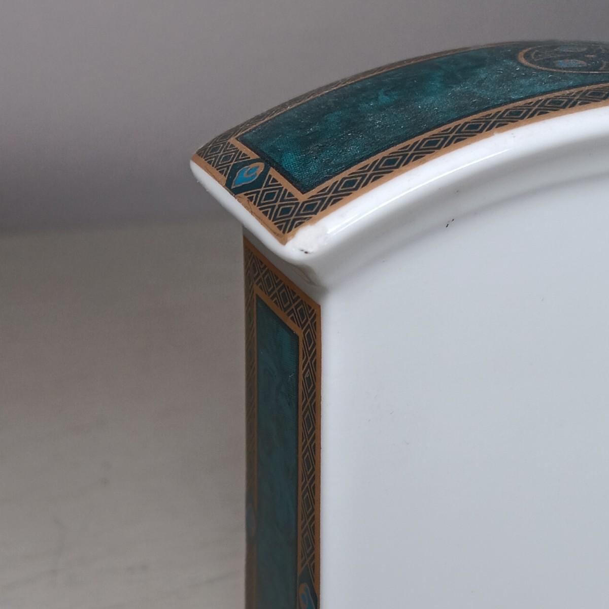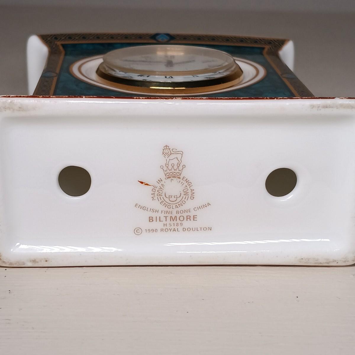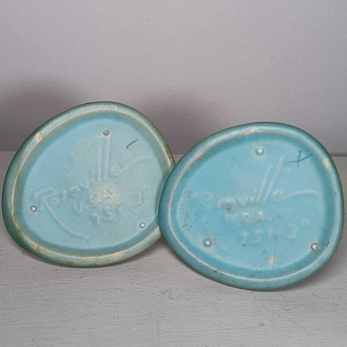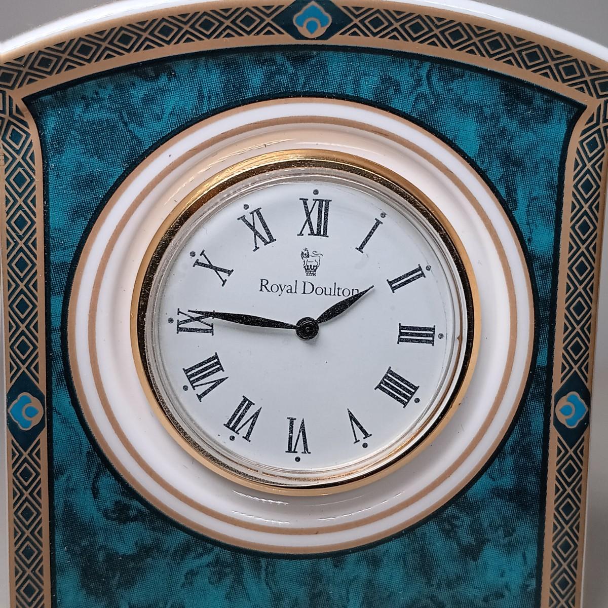 LOT 47: Pair of Roseville Pottery Blue Silhouette Candleholders with Royal Doulton Biltmore Miniature Mantel Clock
