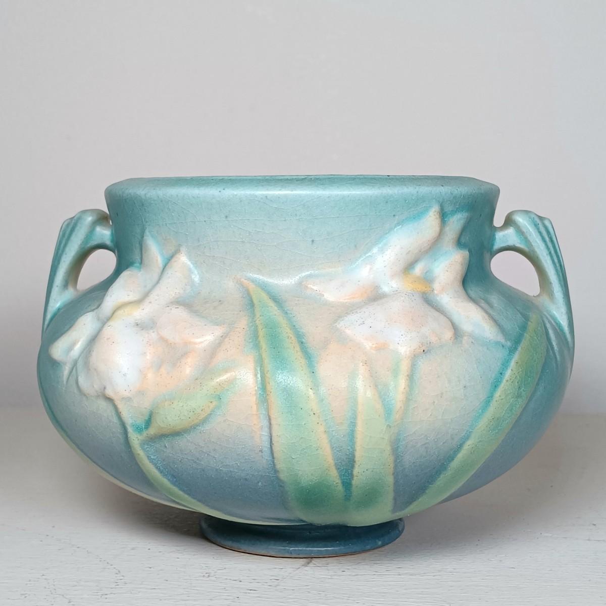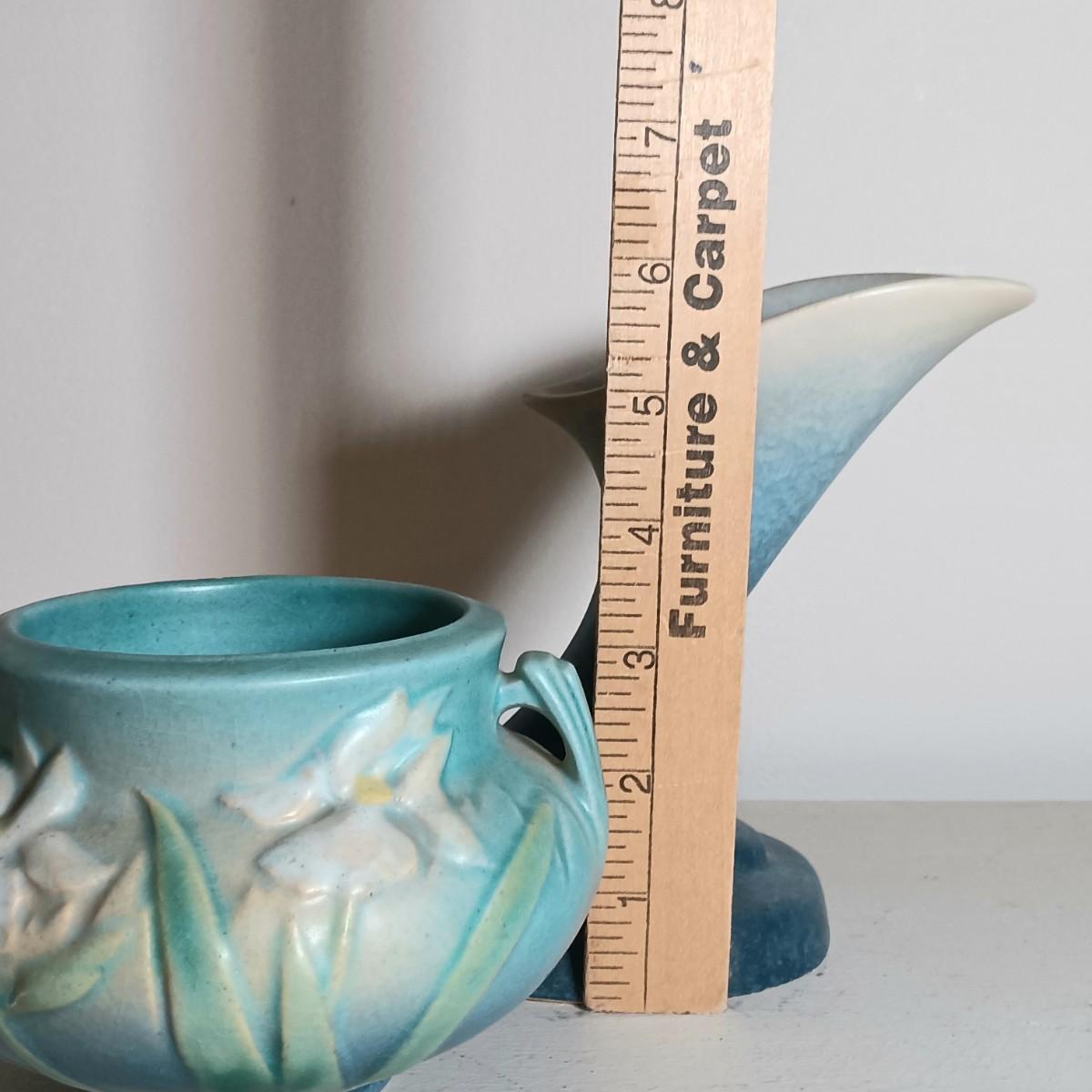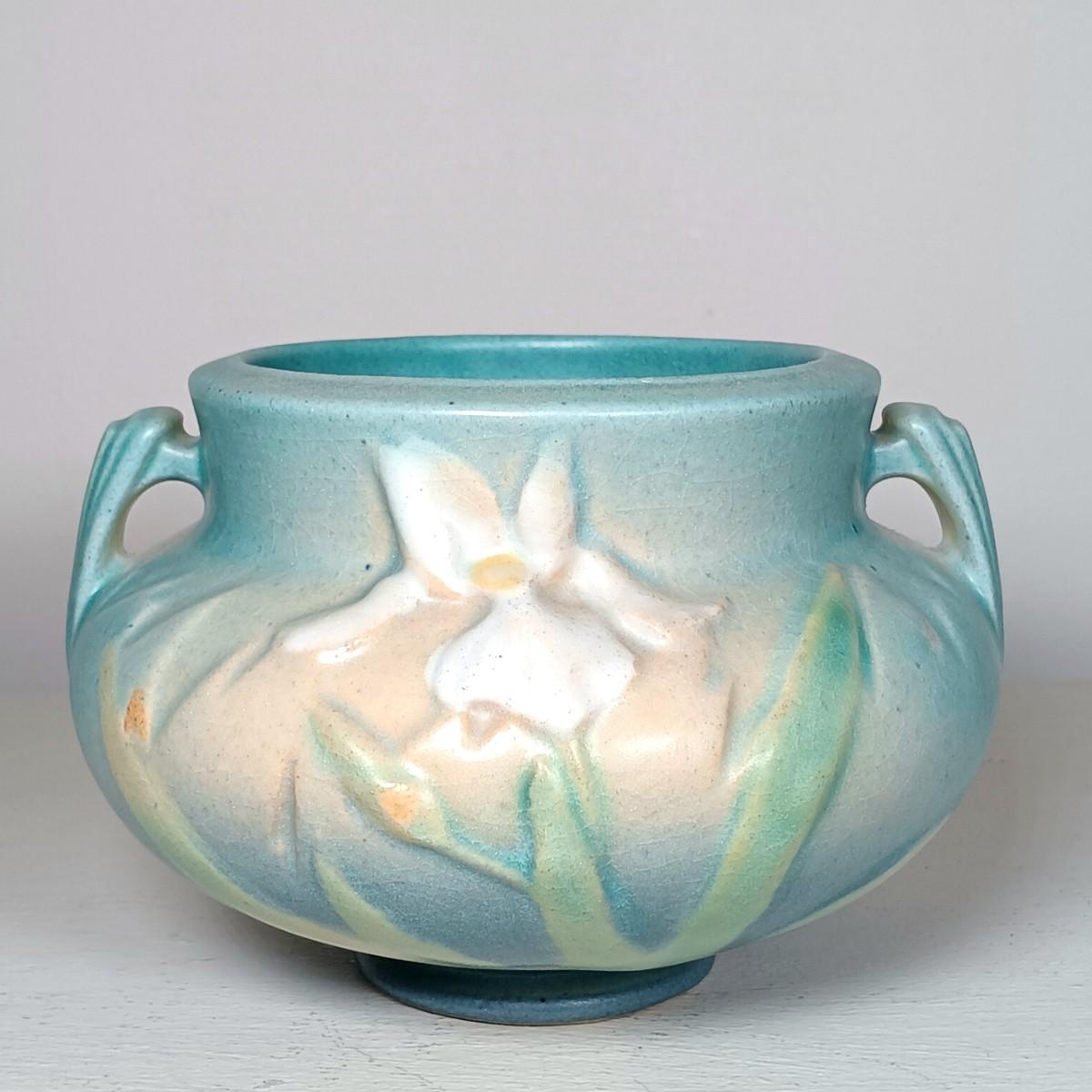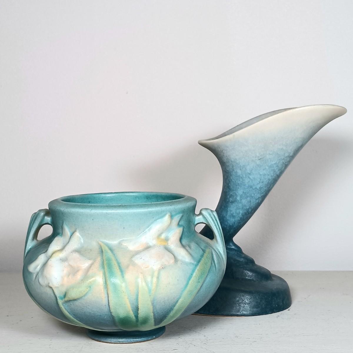 LOT 51: Roseville Pottery Iris Blue Two-Handled Vase and Rozane Pattern Cornucopia Vase