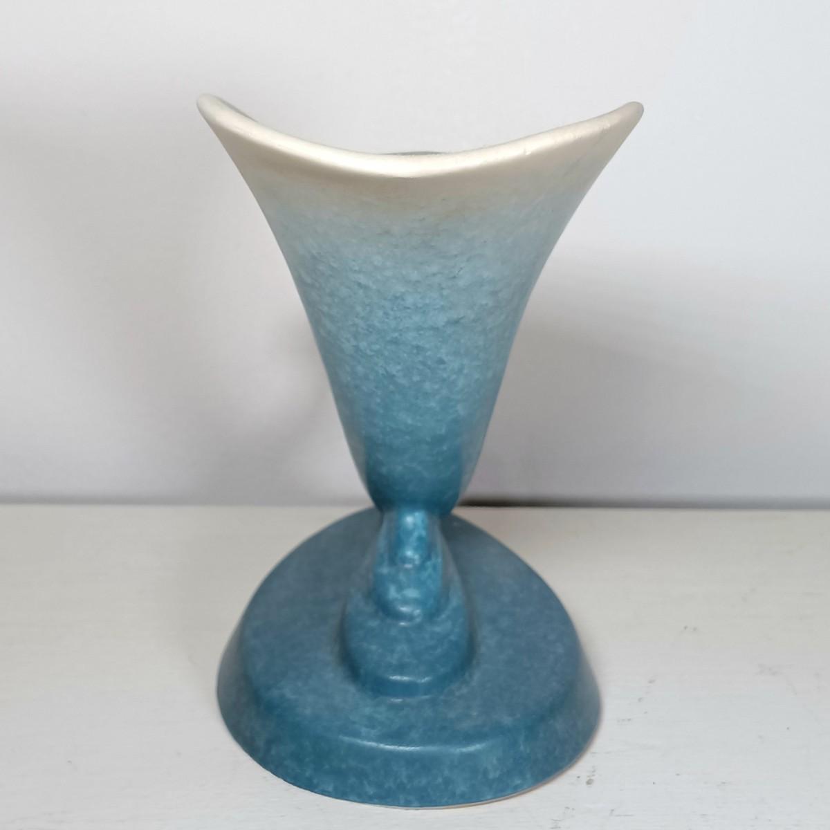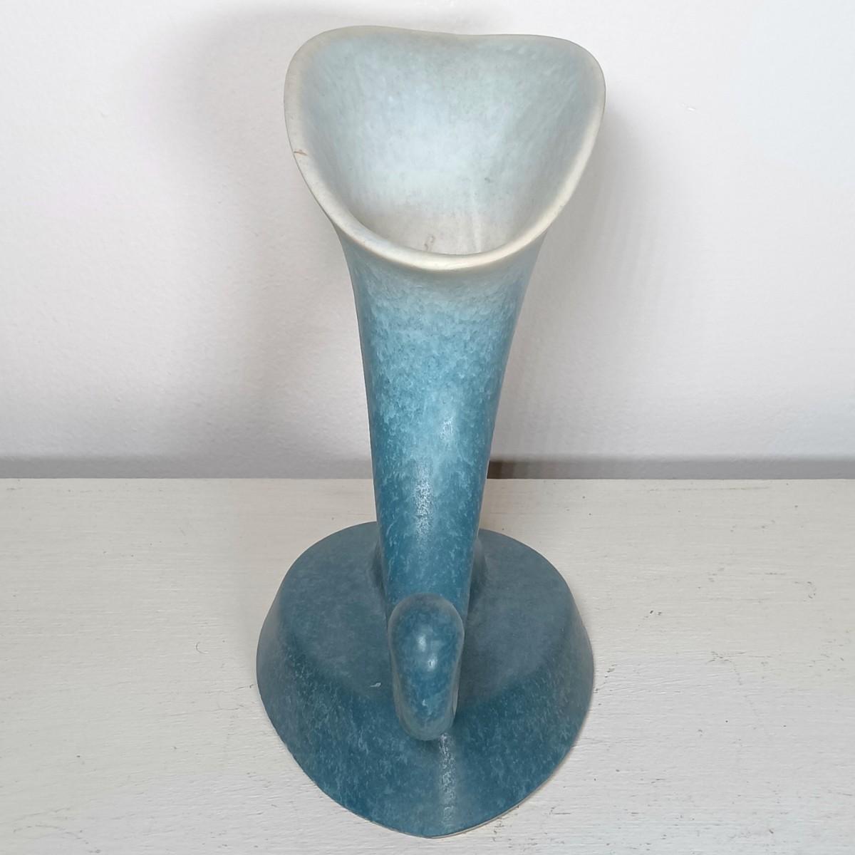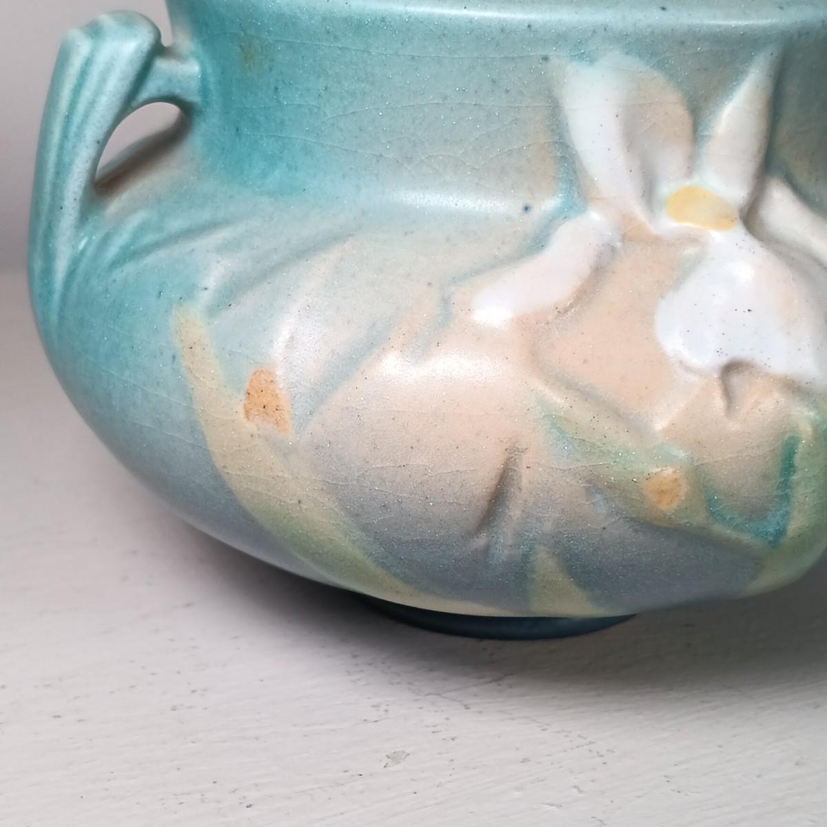 LOT 51: Roseville Pottery Iris Blue Two-Handled Vase and Rozane Pattern Cornucopia Vase