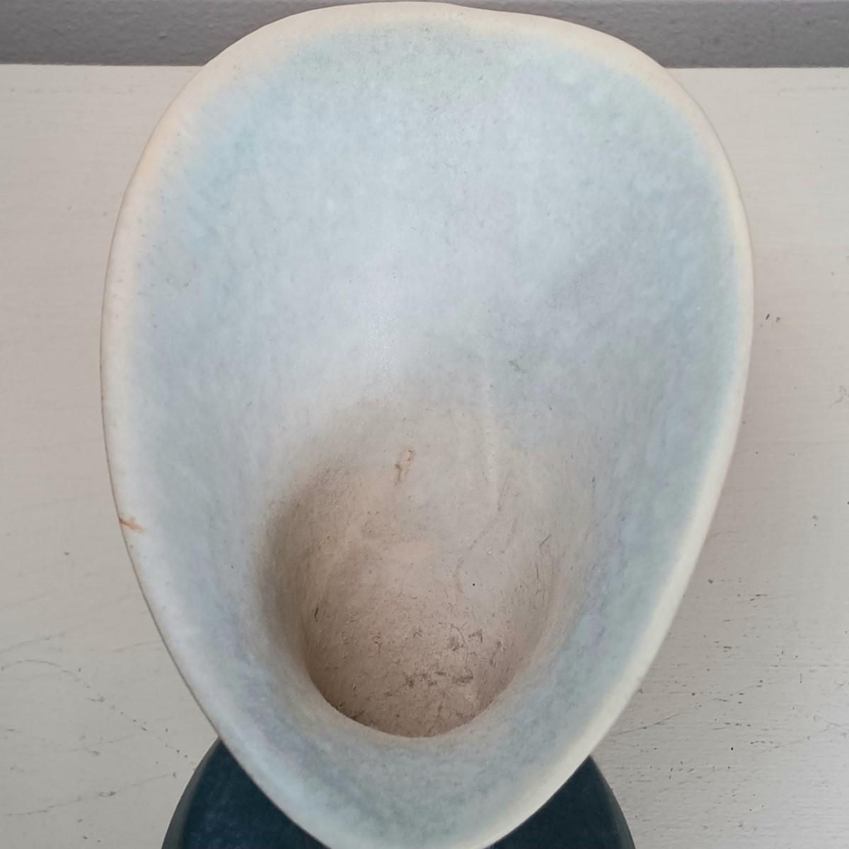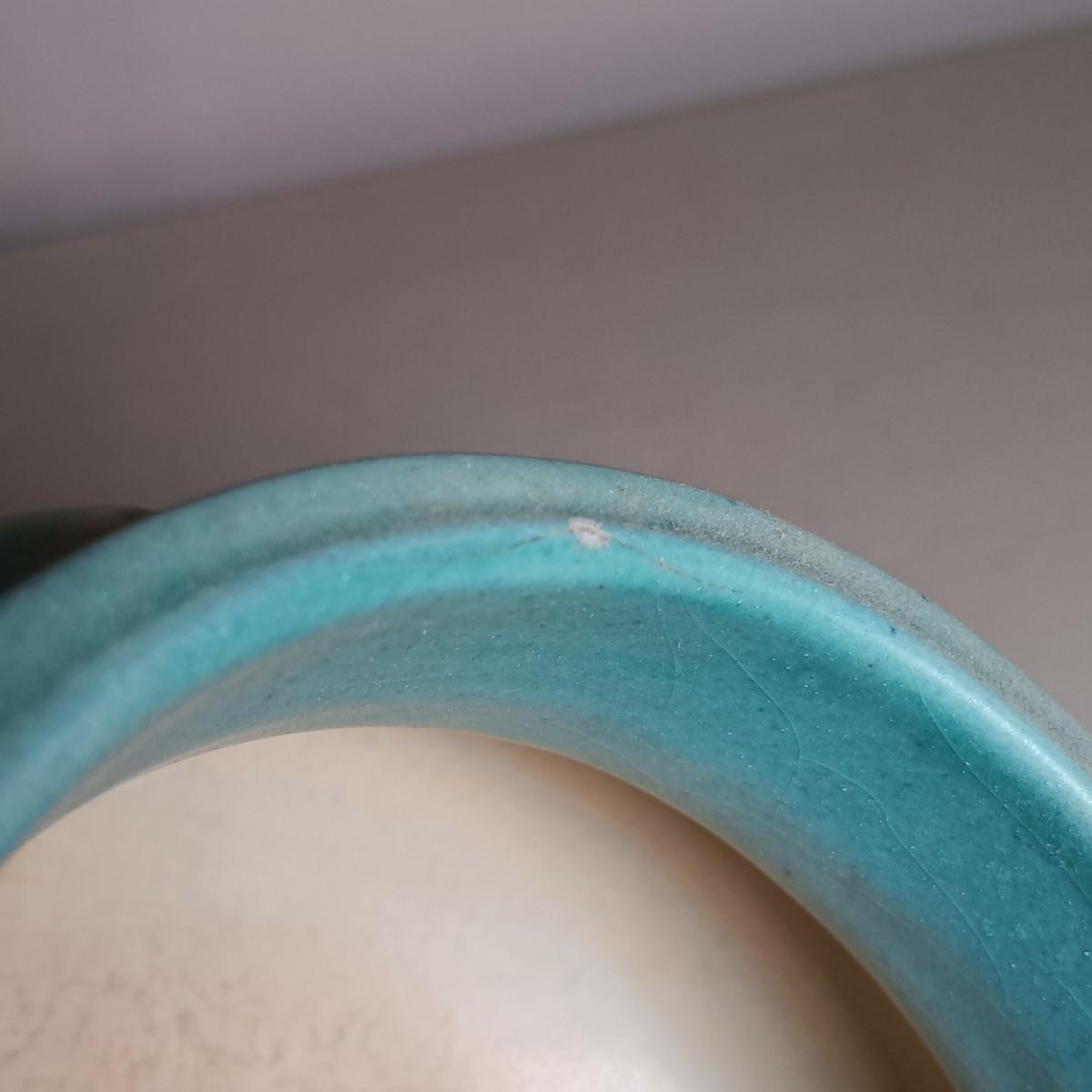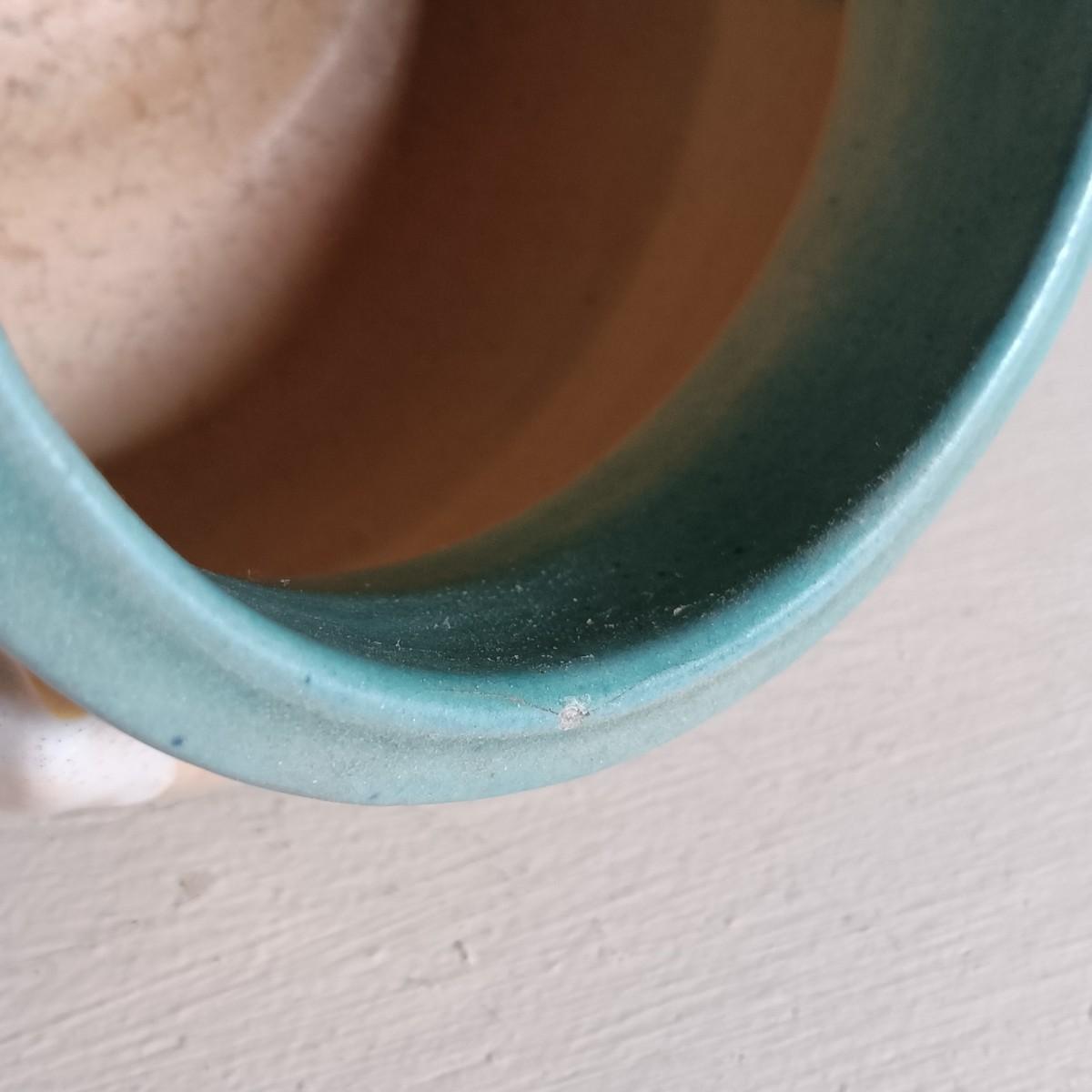The iris vase has a small chip with a crack spreading from it along the rim.