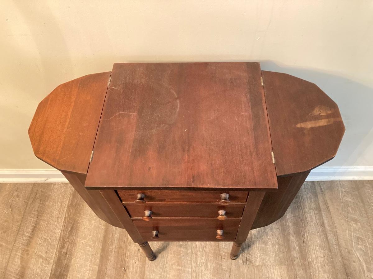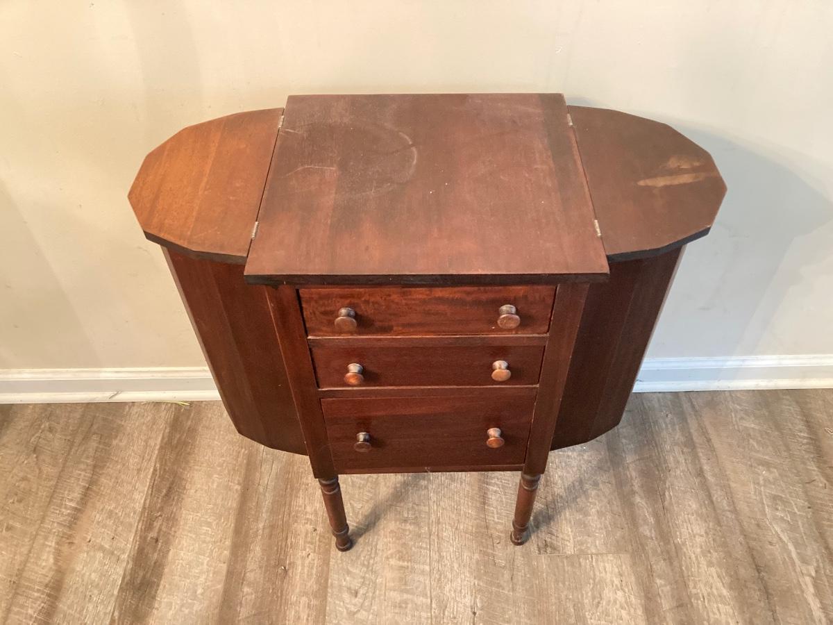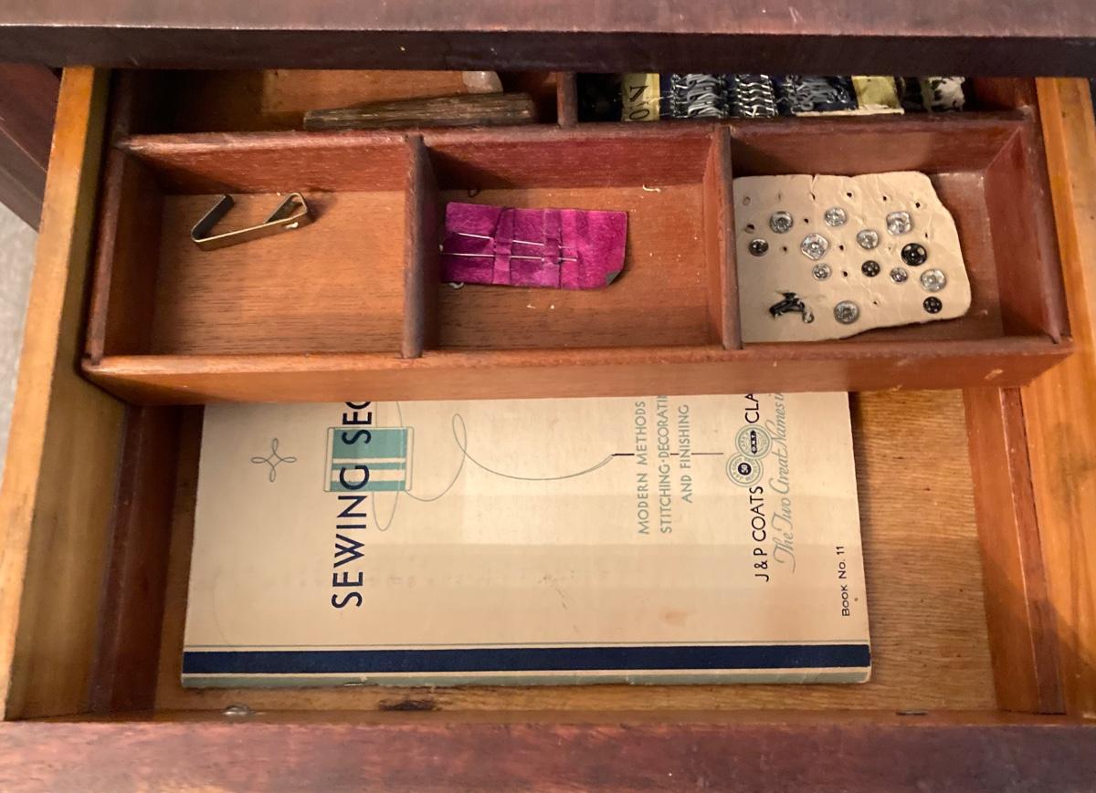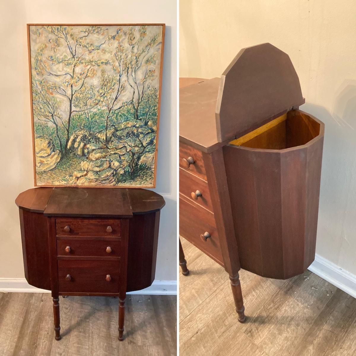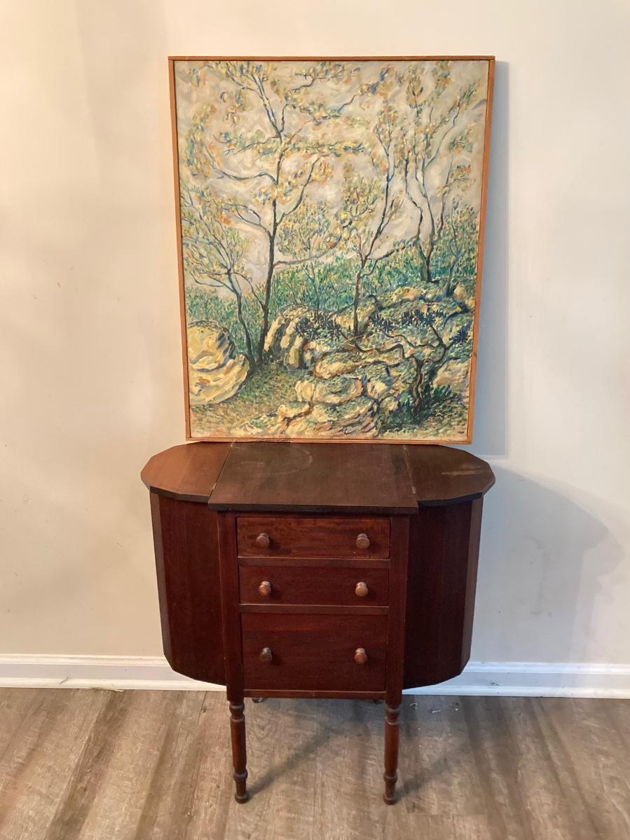 LOT 55: Martha Washington Sewing Table and Contents with Oil Painting