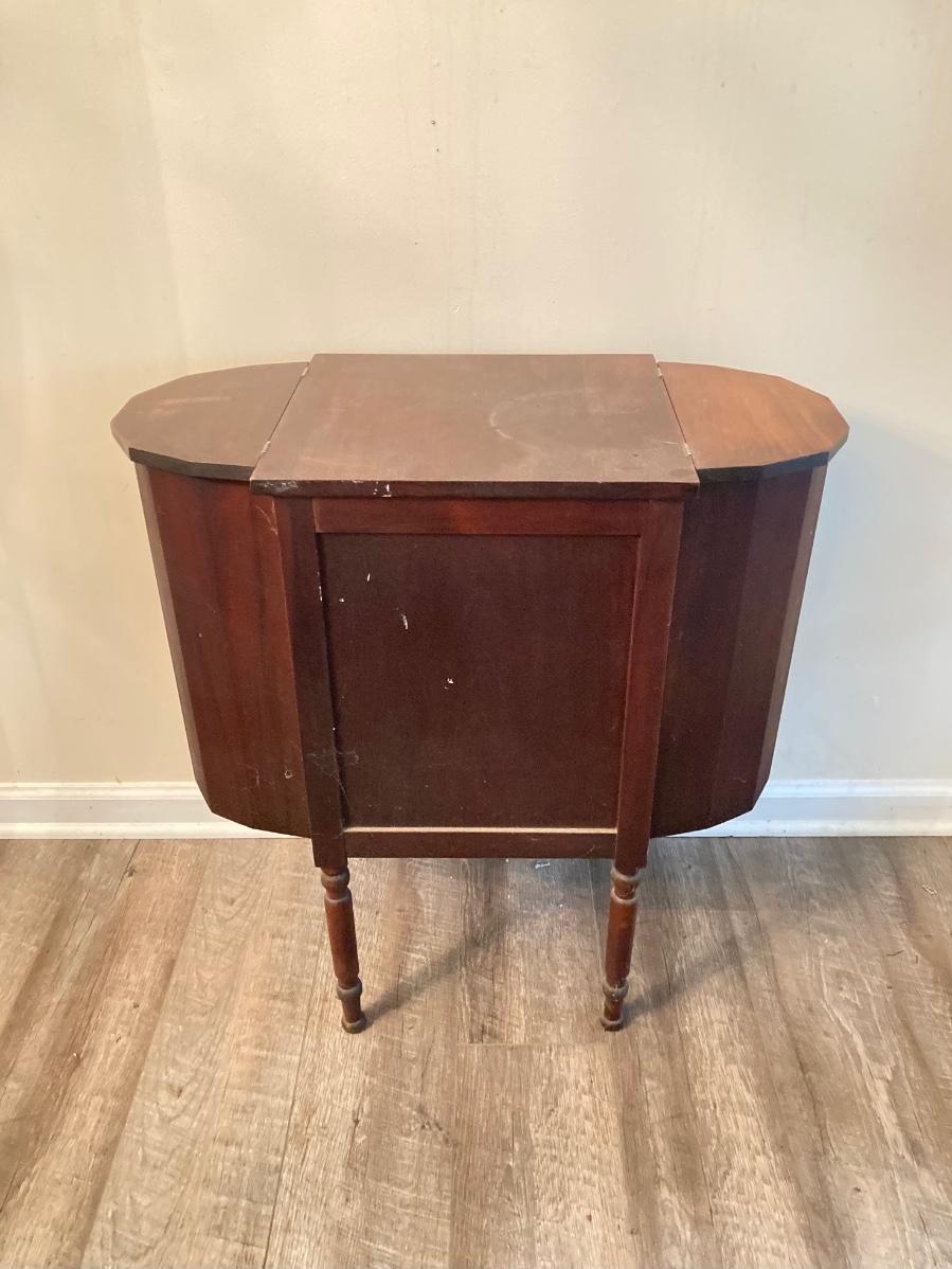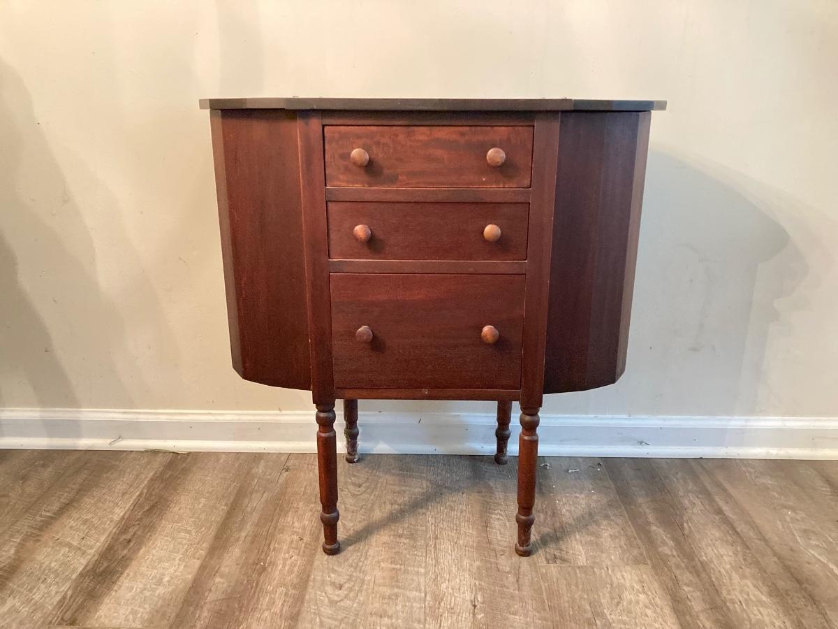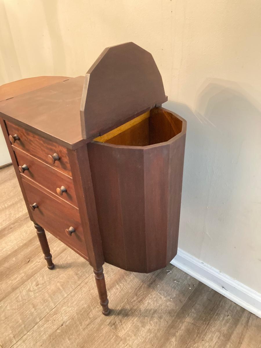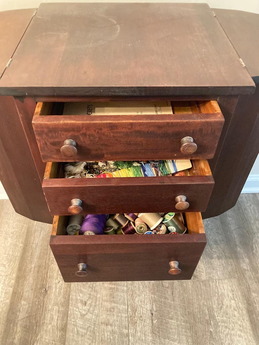 LOT 55: Martha Washington Sewing Table and Contents with Oil Painting