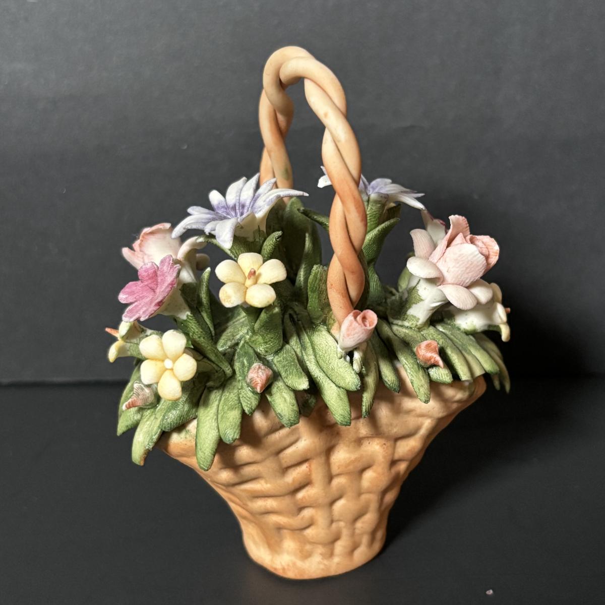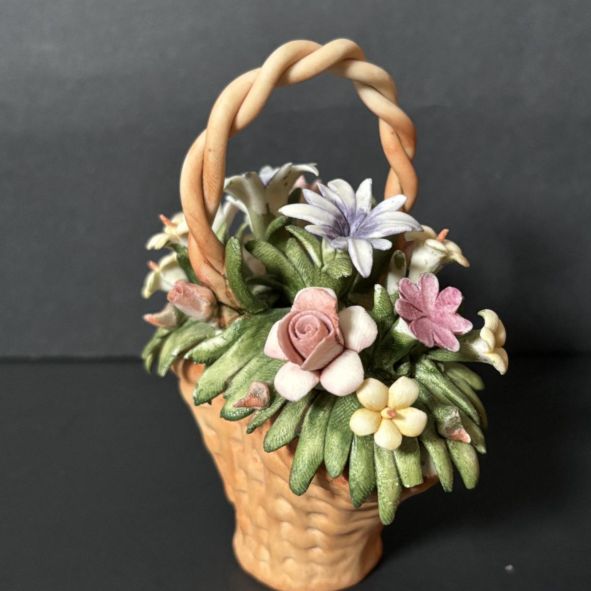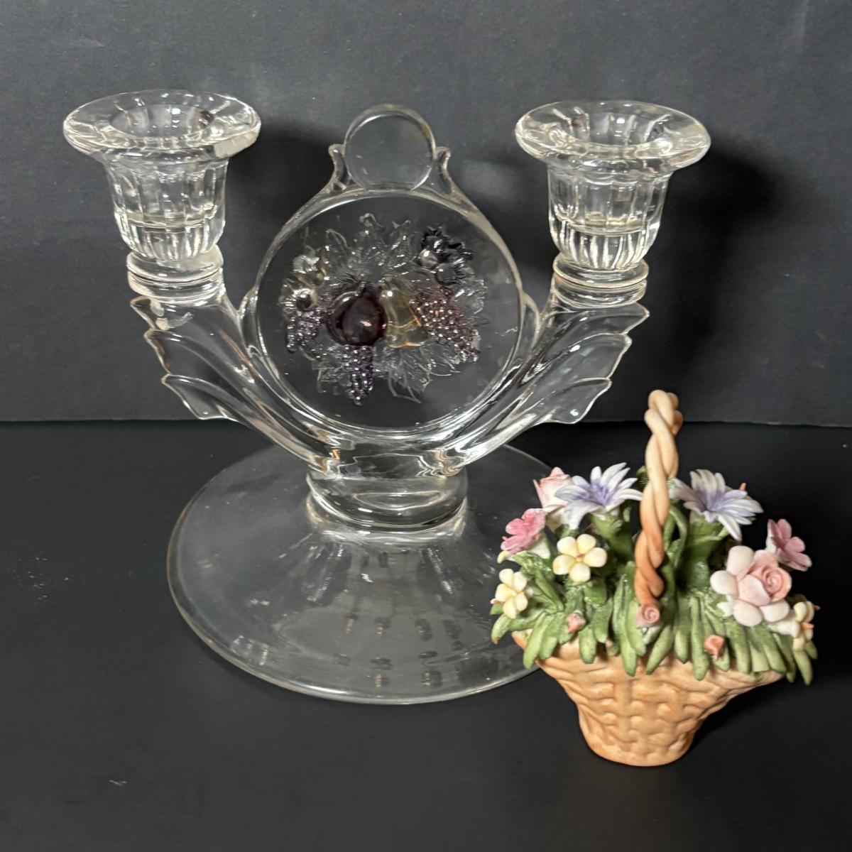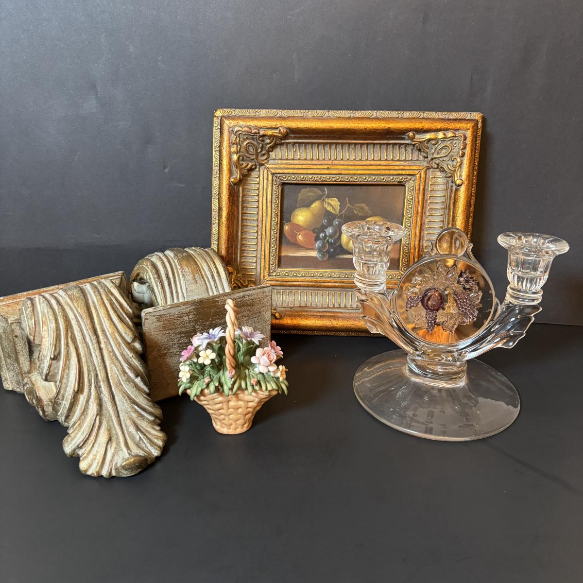 LOT 89: Home Decor Wall Sconces/Shelves & Still Life Print, Capodimonte Basket of Flowers,Glass Dual Light Candlestick/Holder w/Applied Color