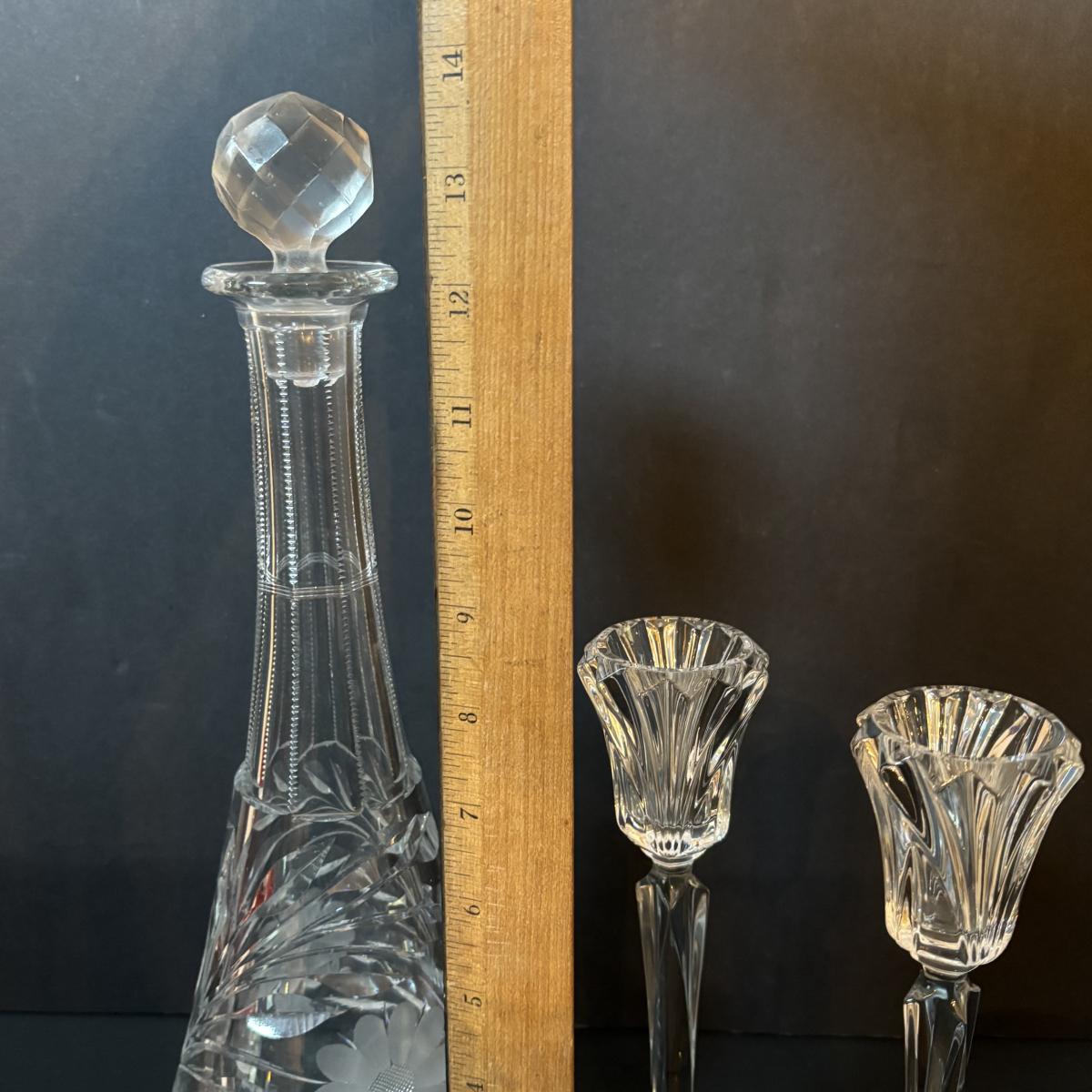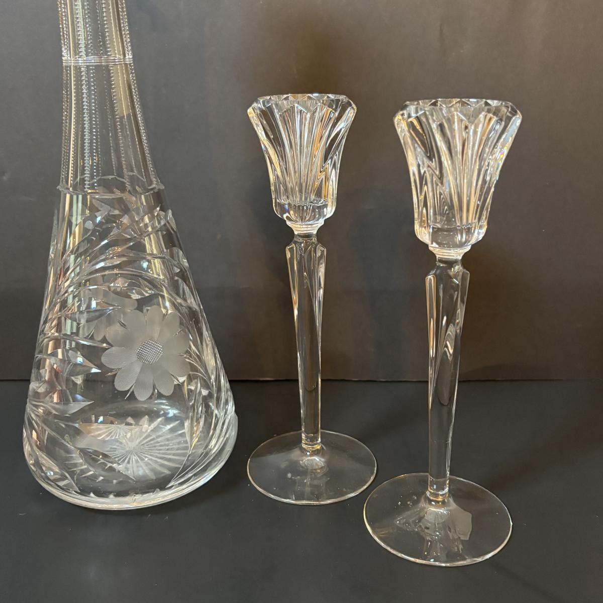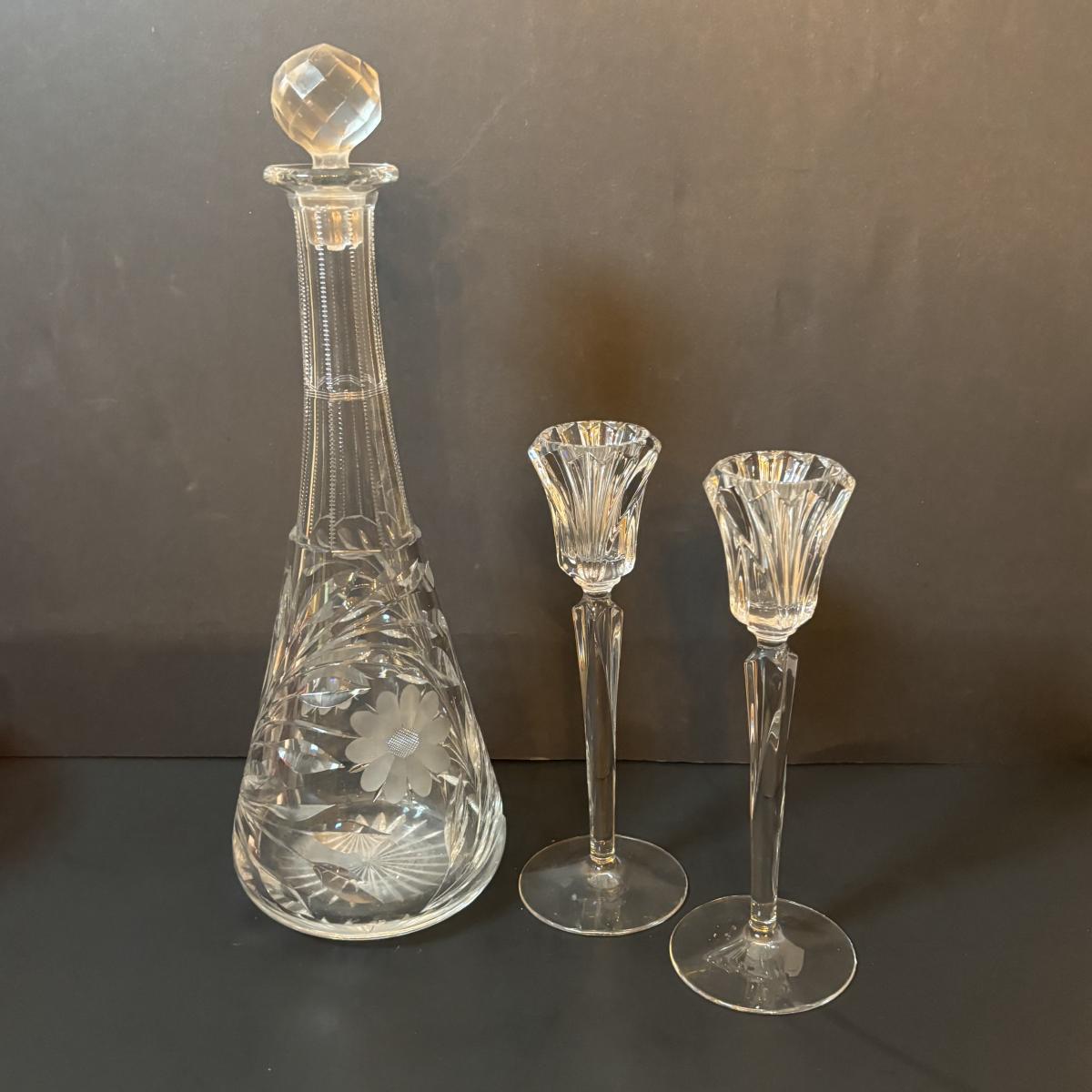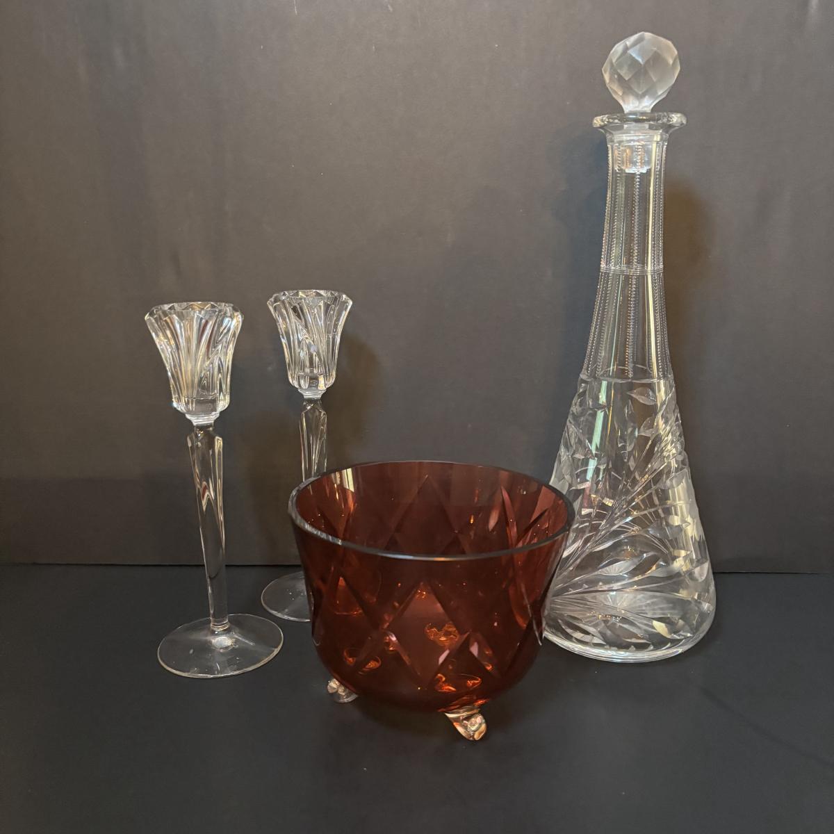 LOT 97: Vintage Footed Cranberry Glass Bowl along with Crystal Candle Sticks & Decanter