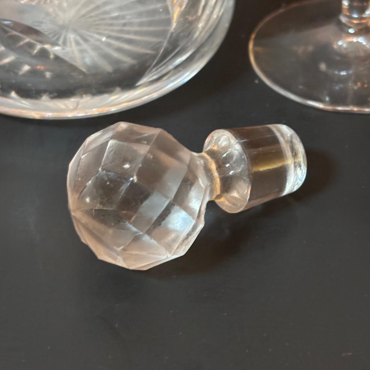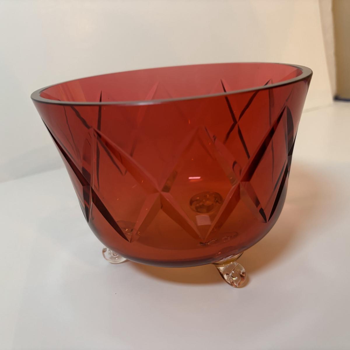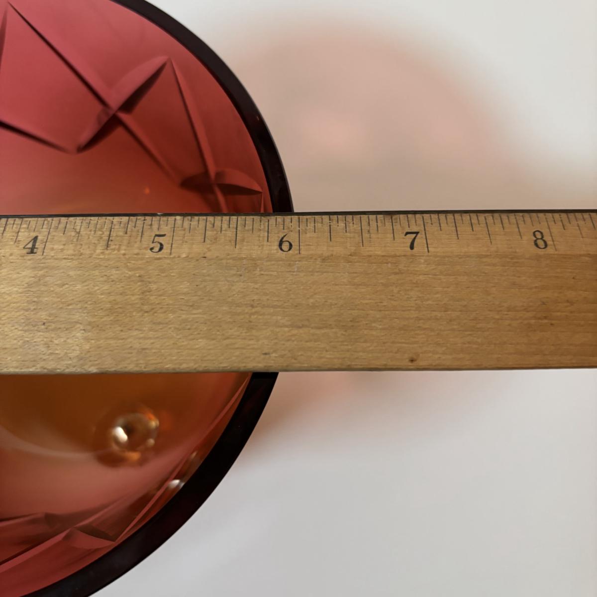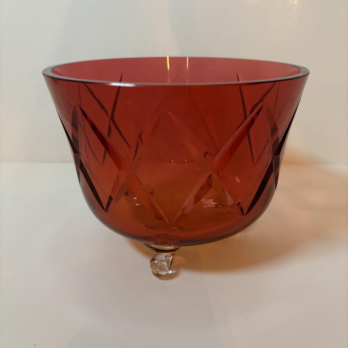 LOT 97: Vintage Footed Cranberry Glass Bowl along with Crystal Candle Sticks & Decanter