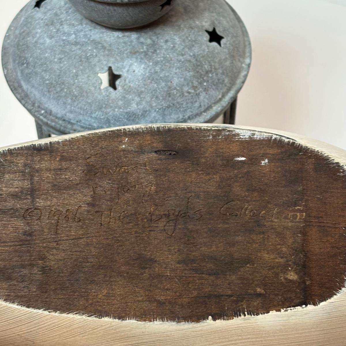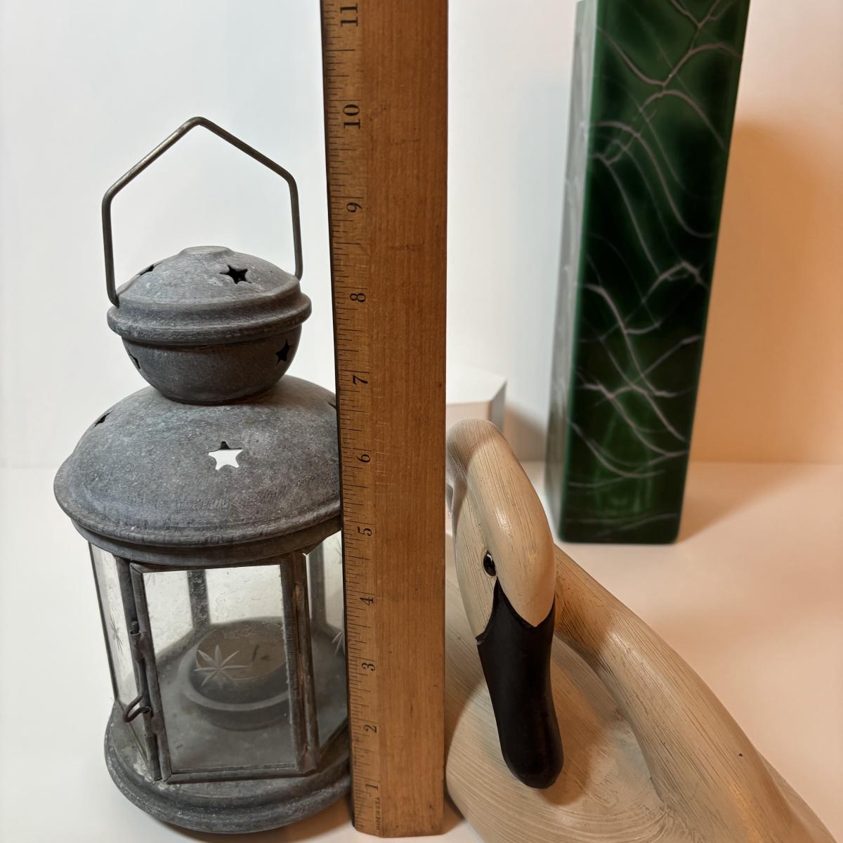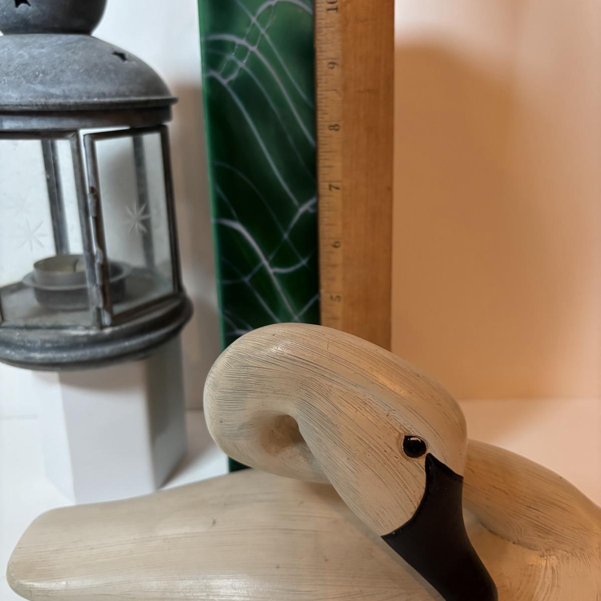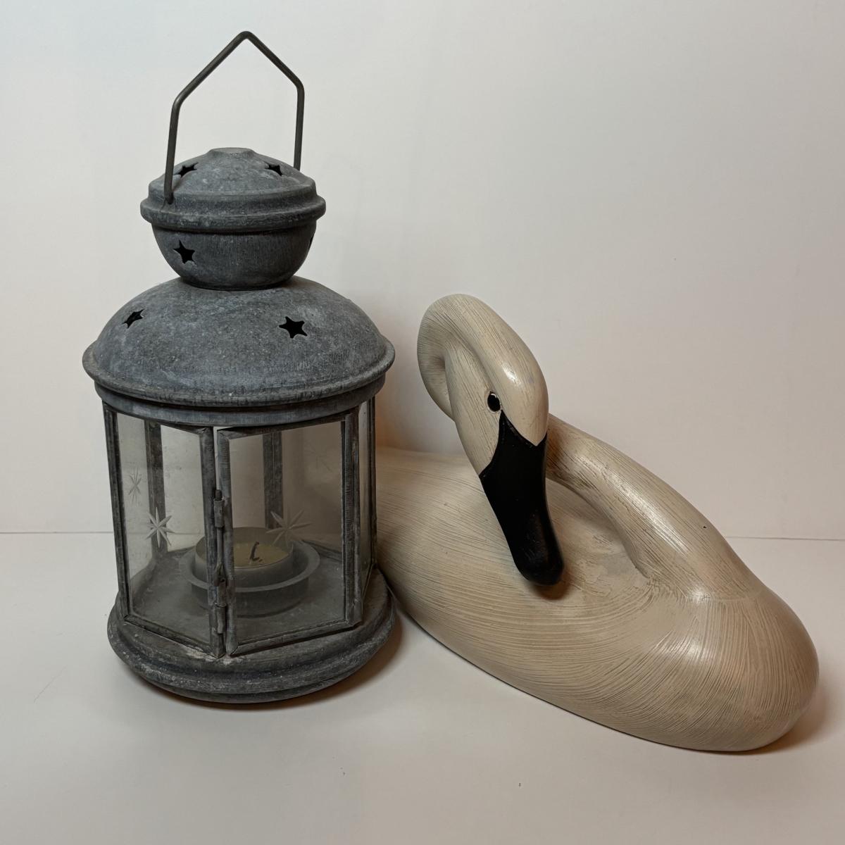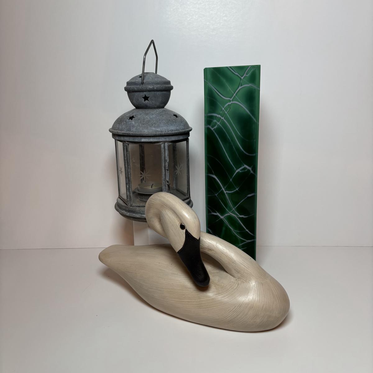 LOT 99: MCM Studio Art Glass Spaghetti String Green Artisan Vase, Wooden Resting Swan 1986 The Boyds Collection & Votive Candle Lantern