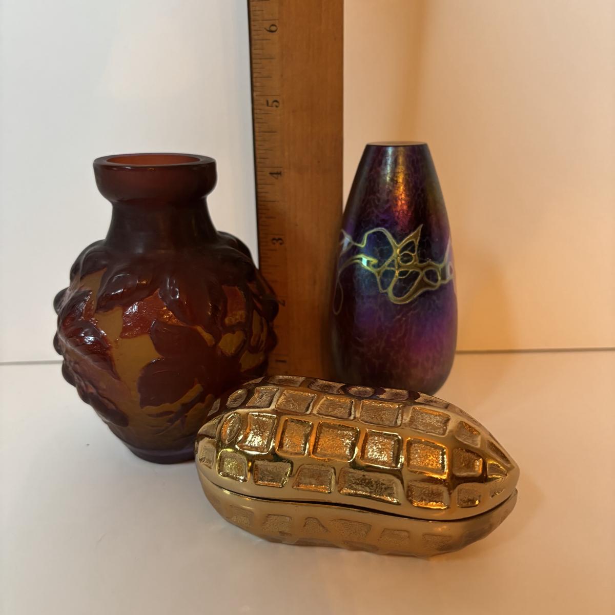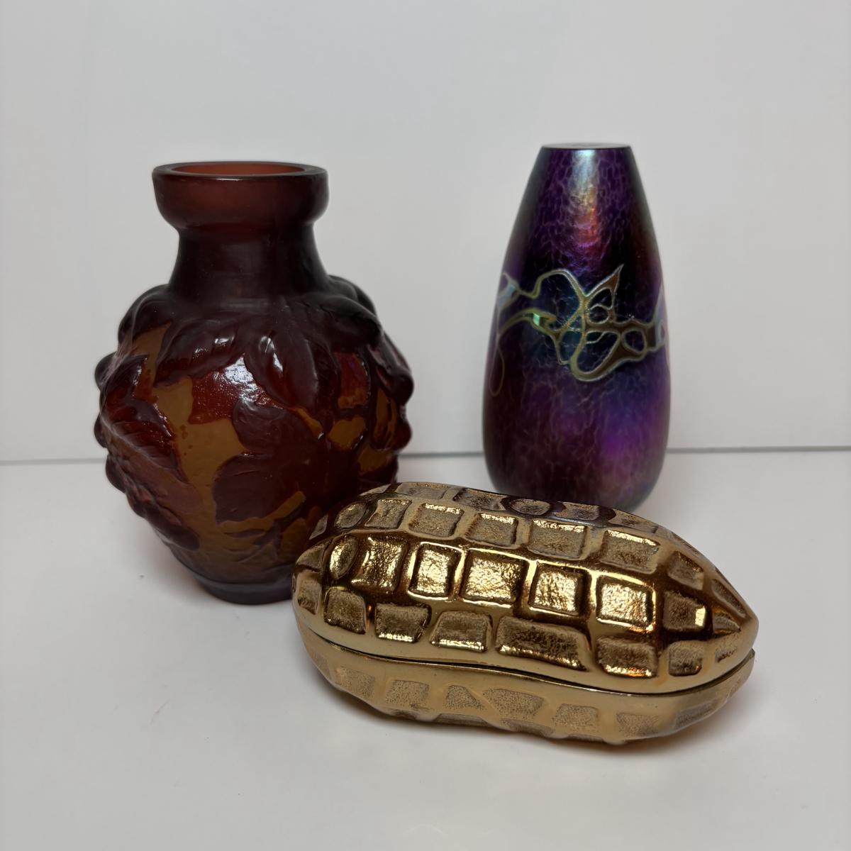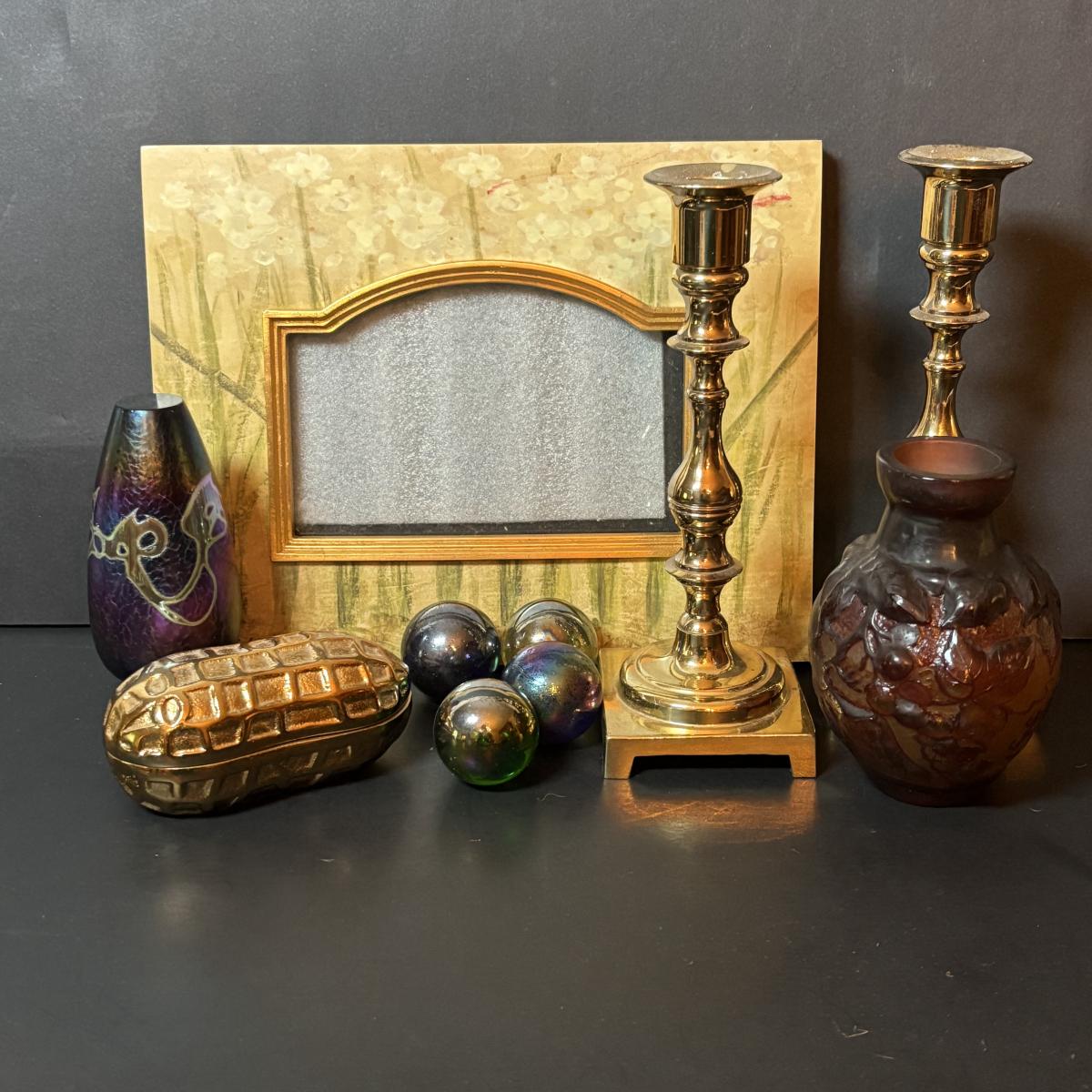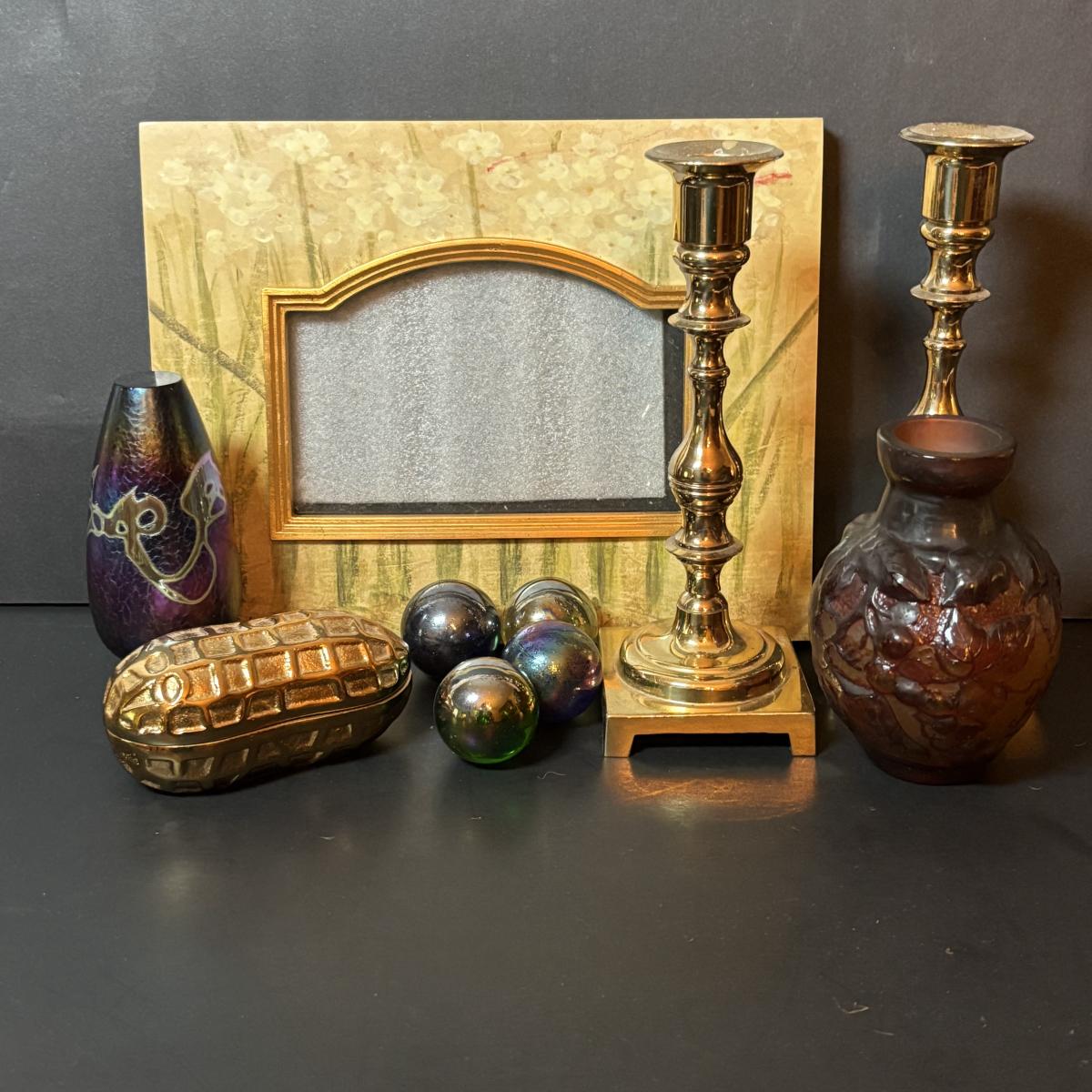 LOT 218: Iridescent Purple Bud Vase, Galle' Cameo Glass Vase, Brass Candle Sticks & Peanut Trinket Box, Iridescent Marble & More