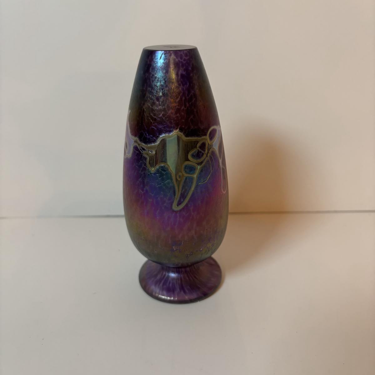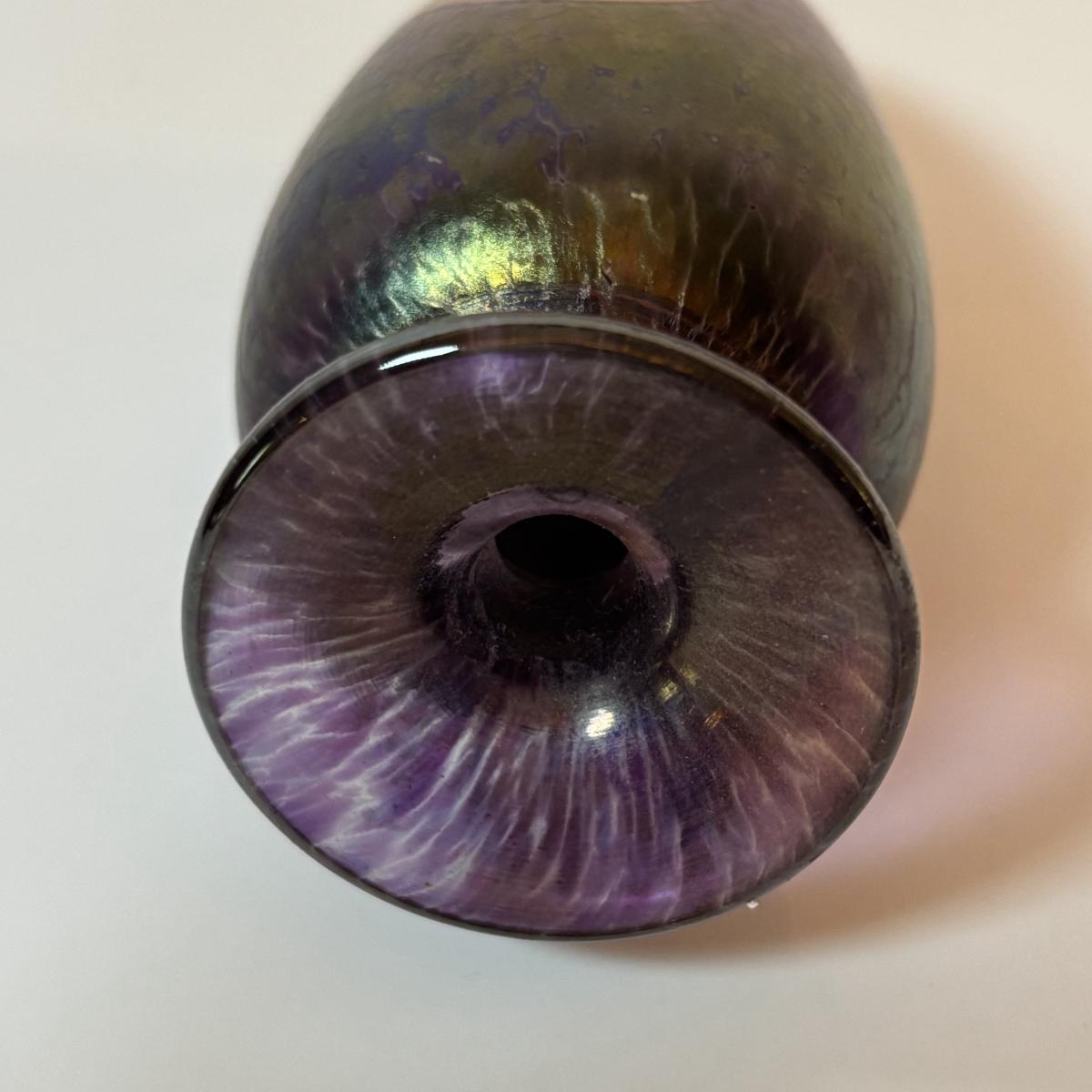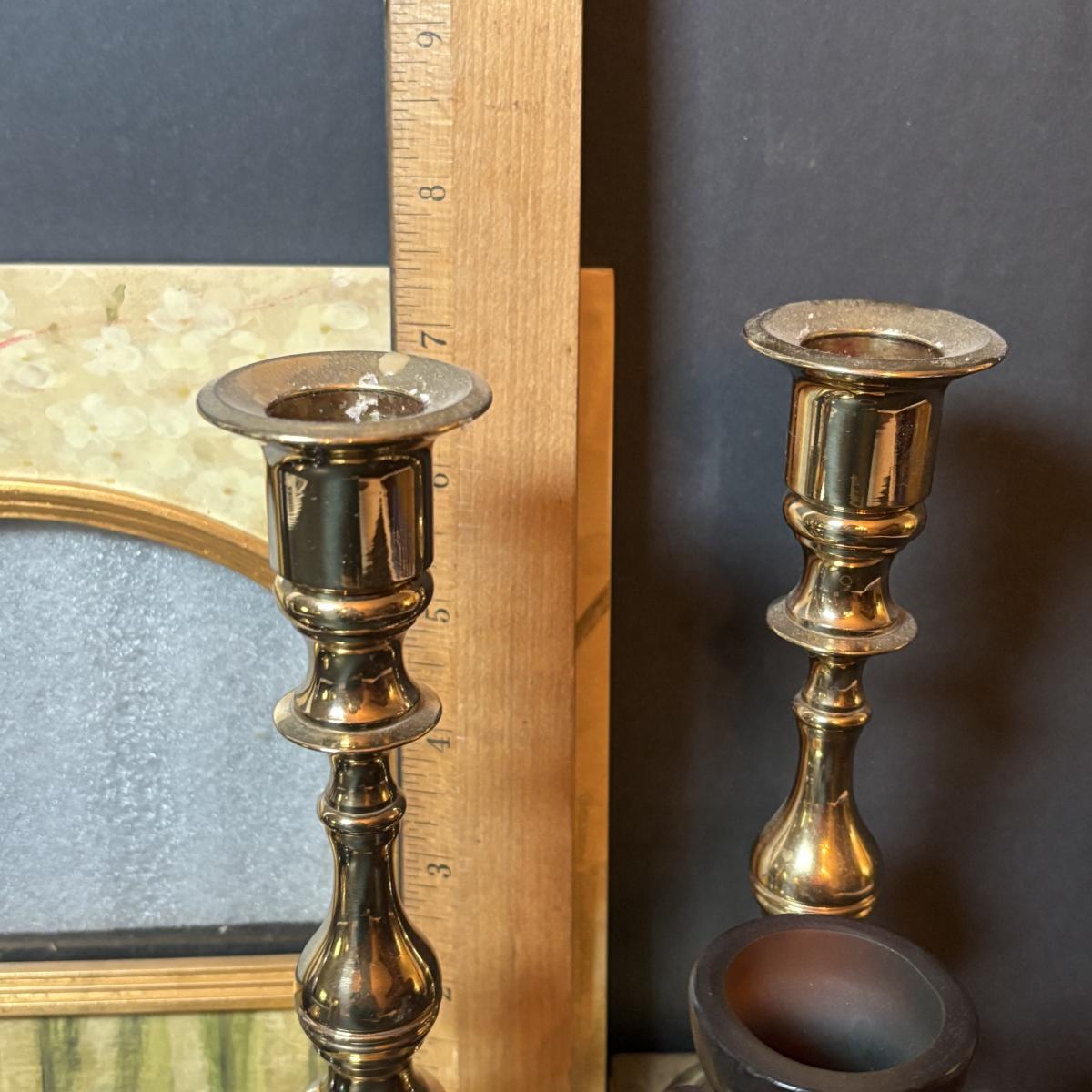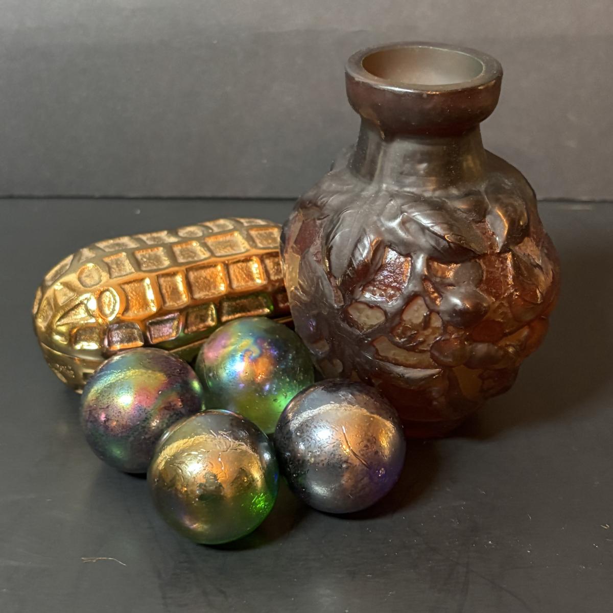 LOT 218: Iridescent Purple Bud Vase, Galle' Cameo Glass Vase, Brass Candle Sticks & Peanut Trinket Box, Iridescent Marble & More