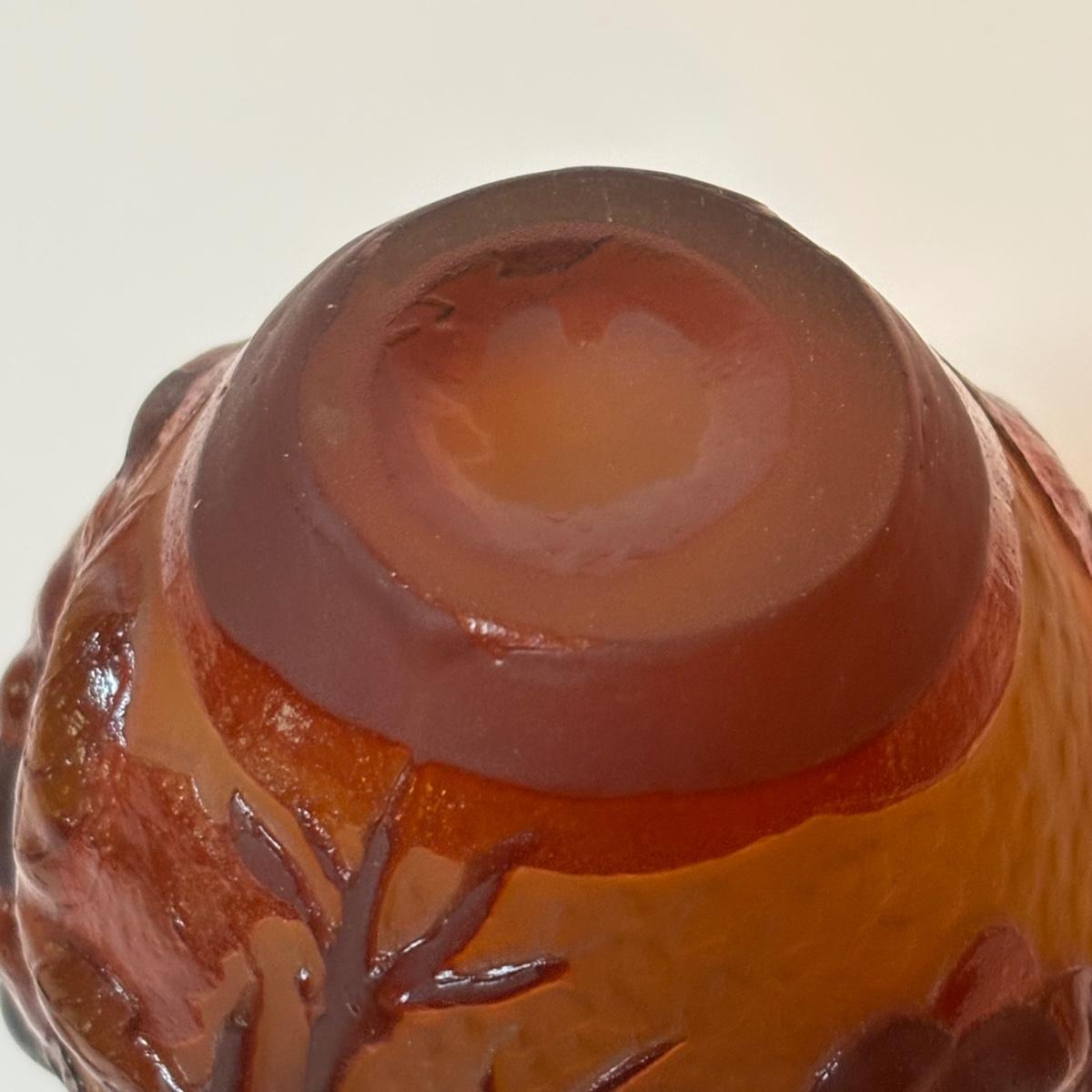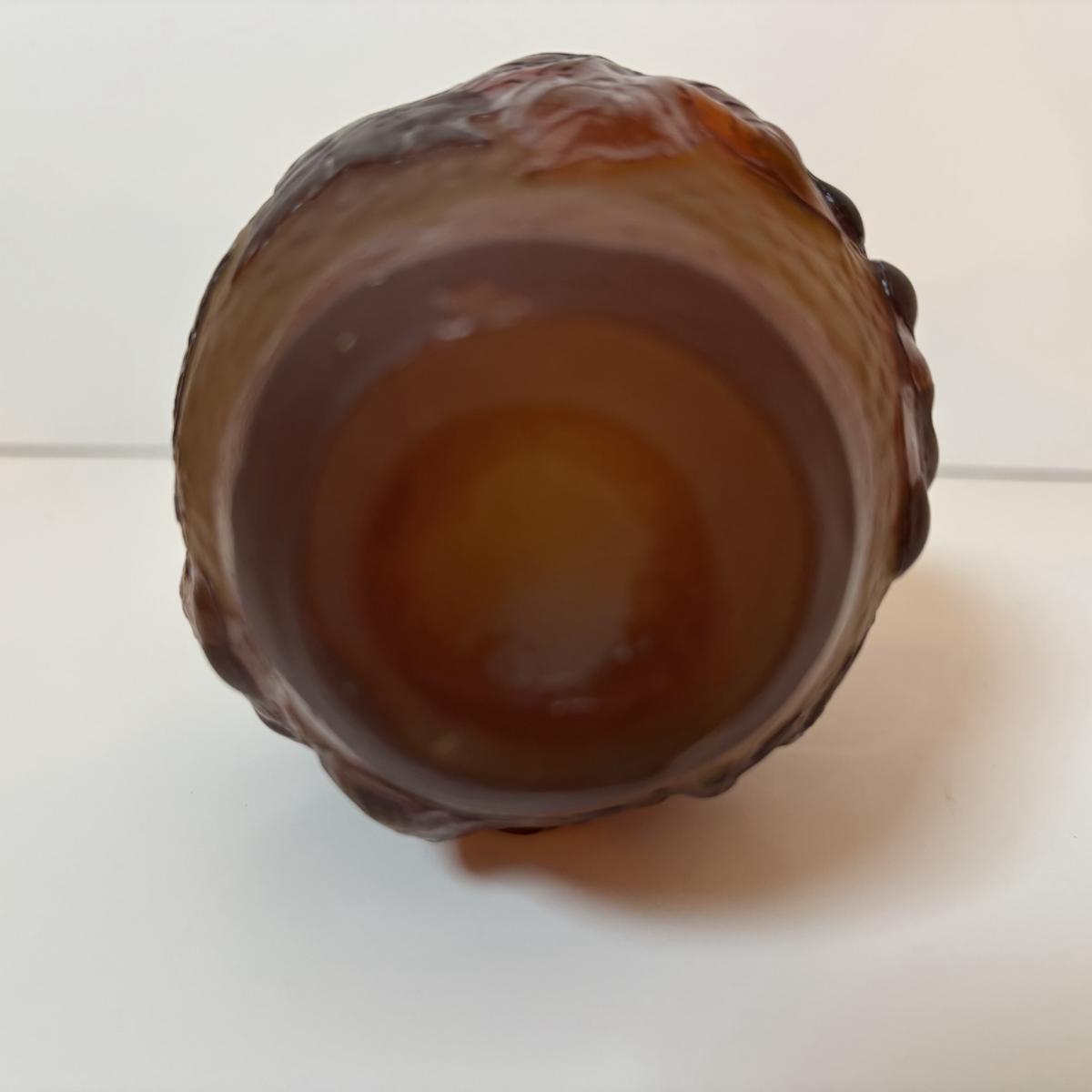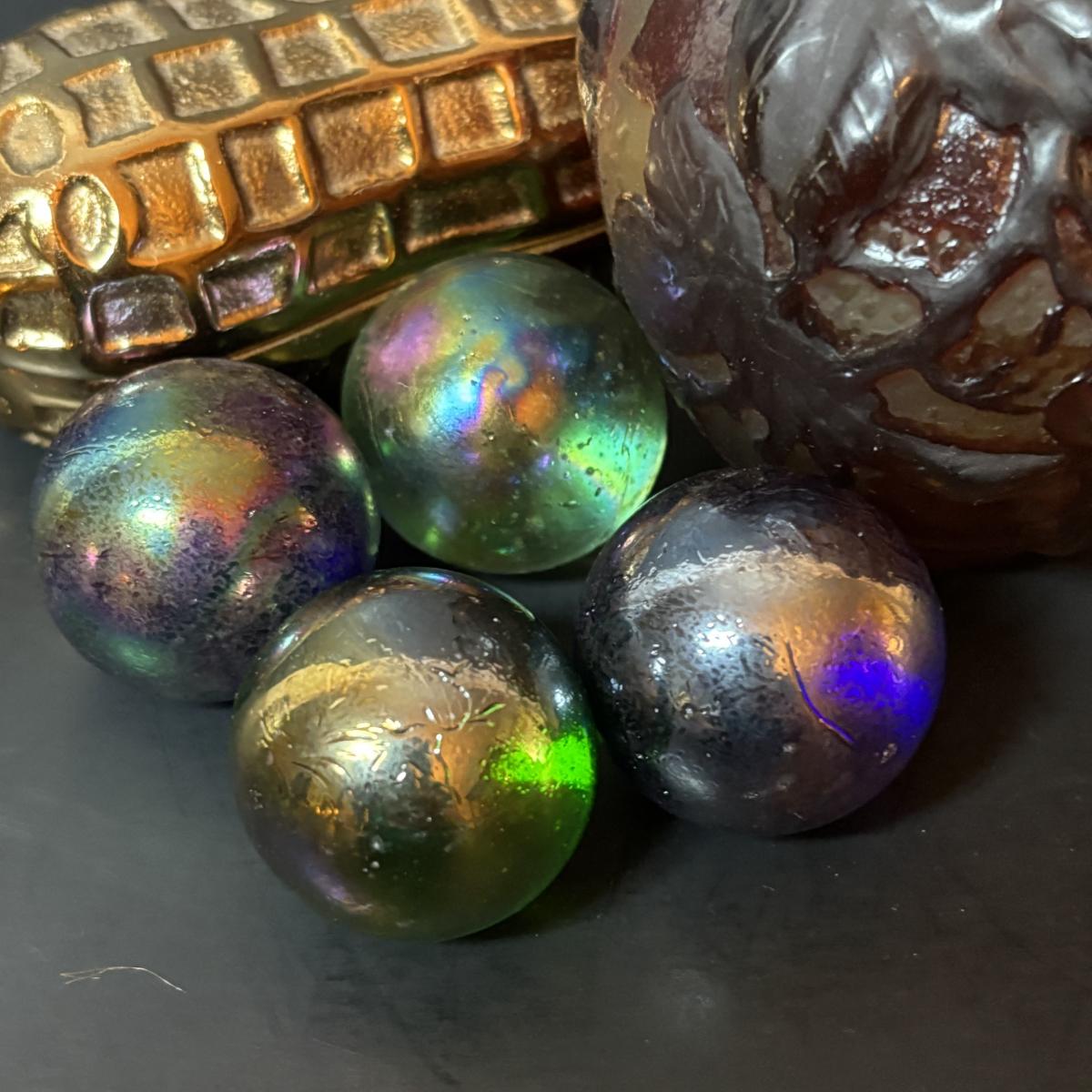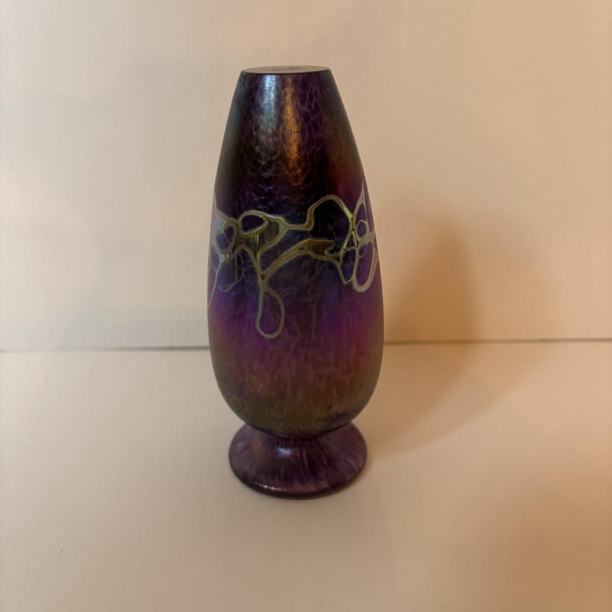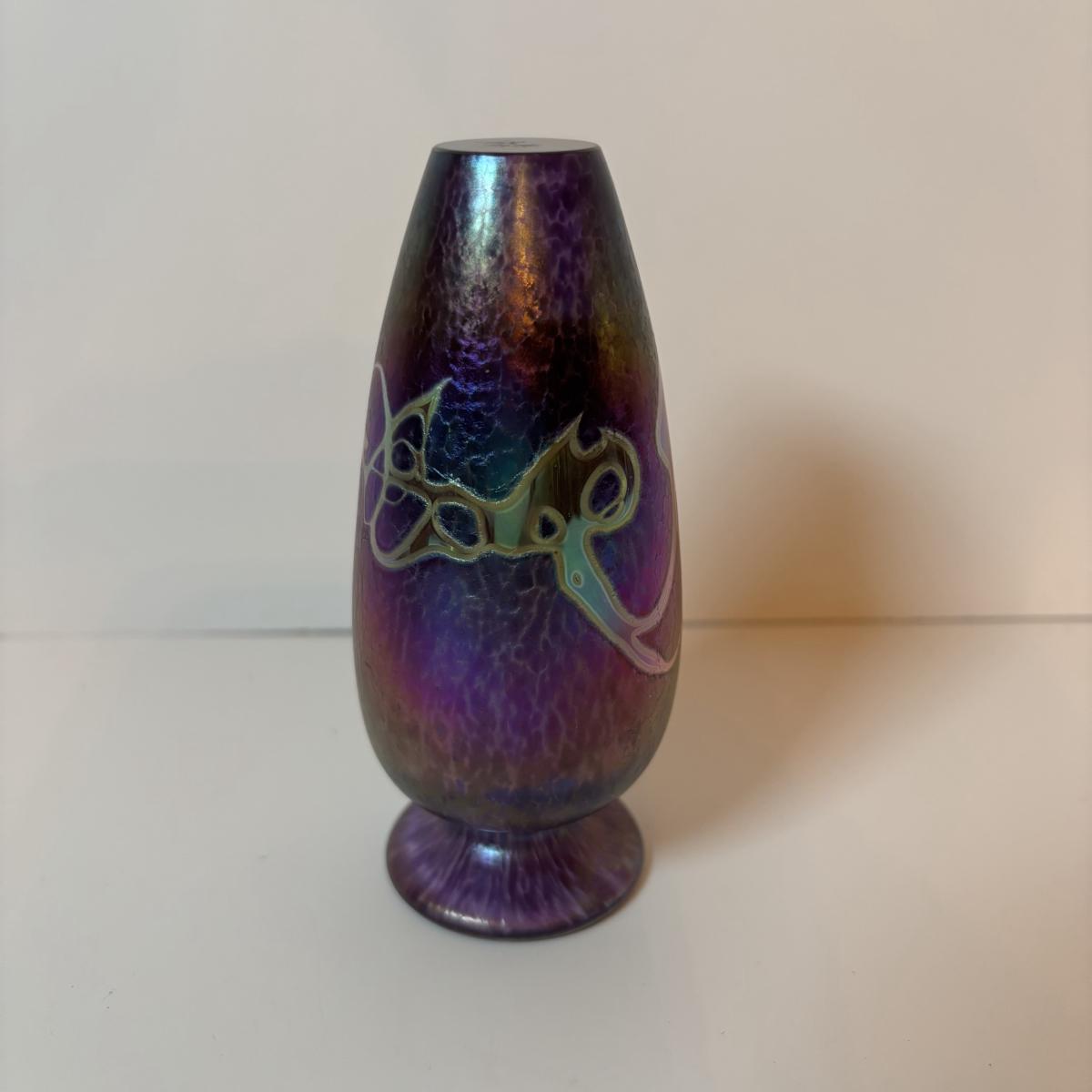 LOT 218: Iridescent Purple Bud Vase, Galle' Cameo Glass Vase, Brass Candle Sticks & Peanut Trinket Box, Iridescent Marble & More