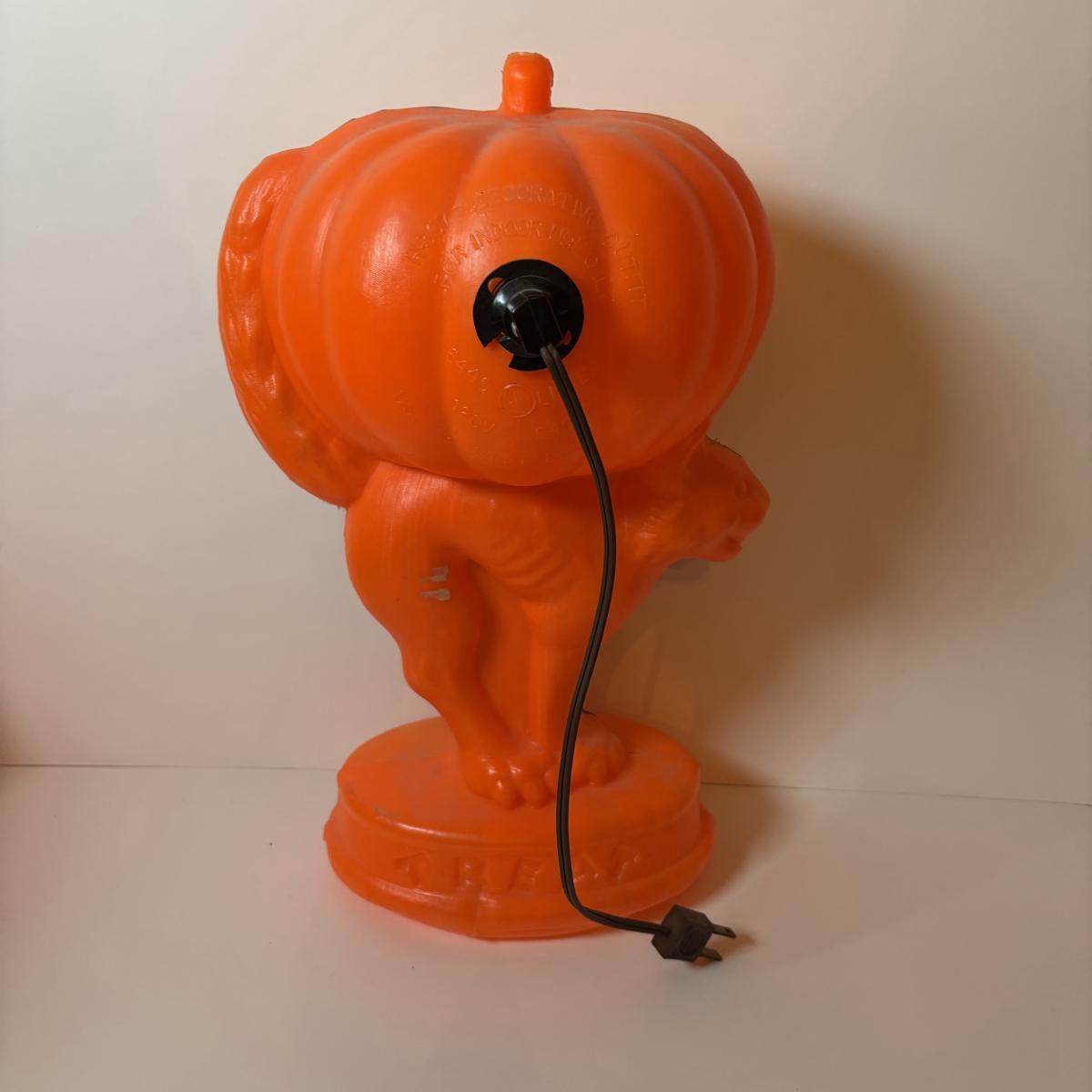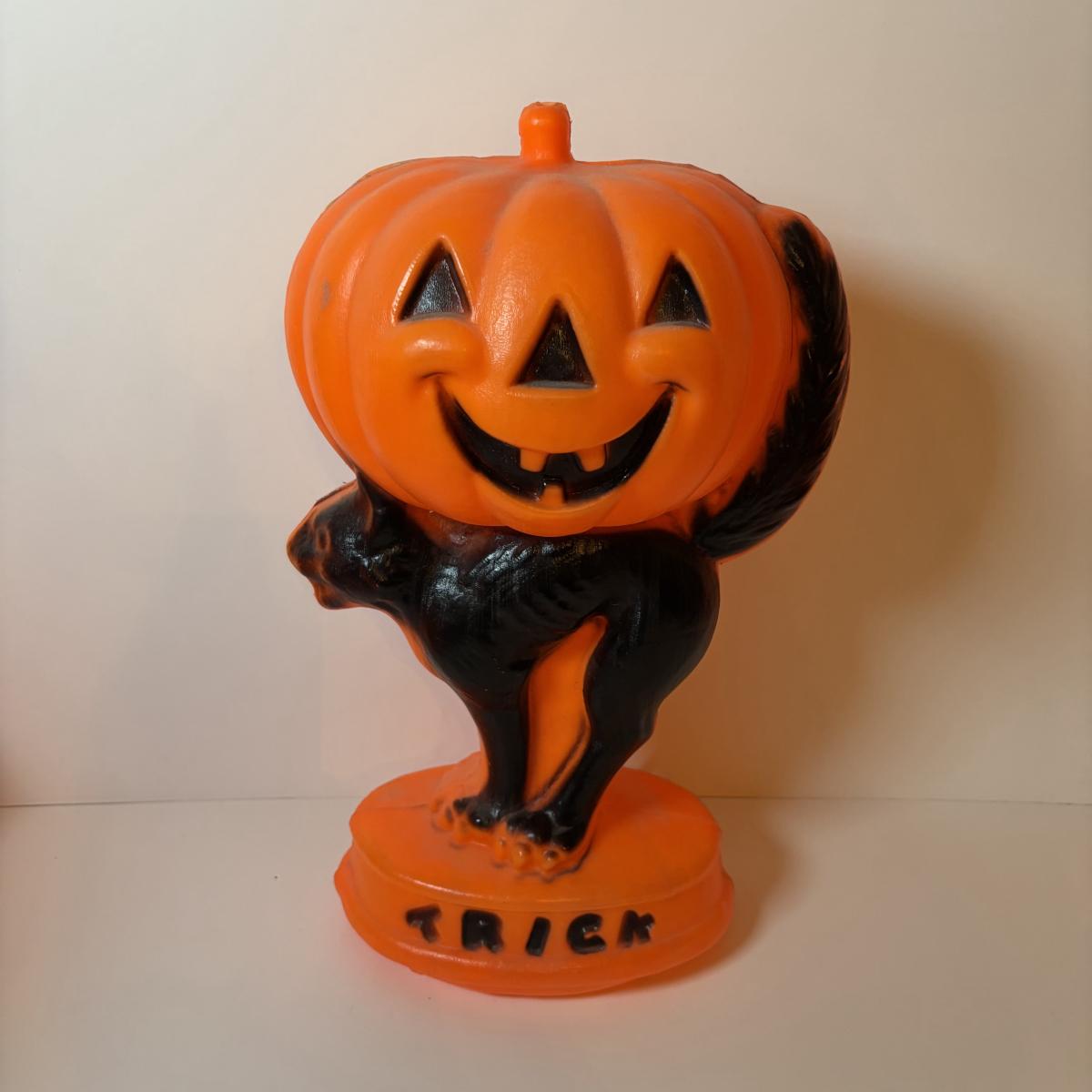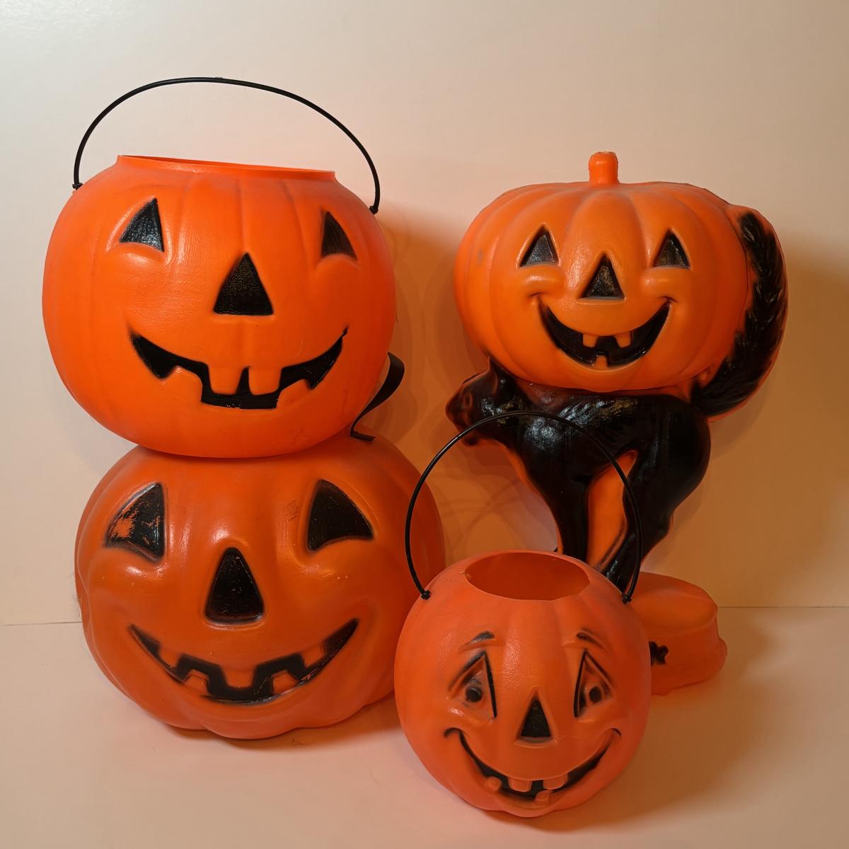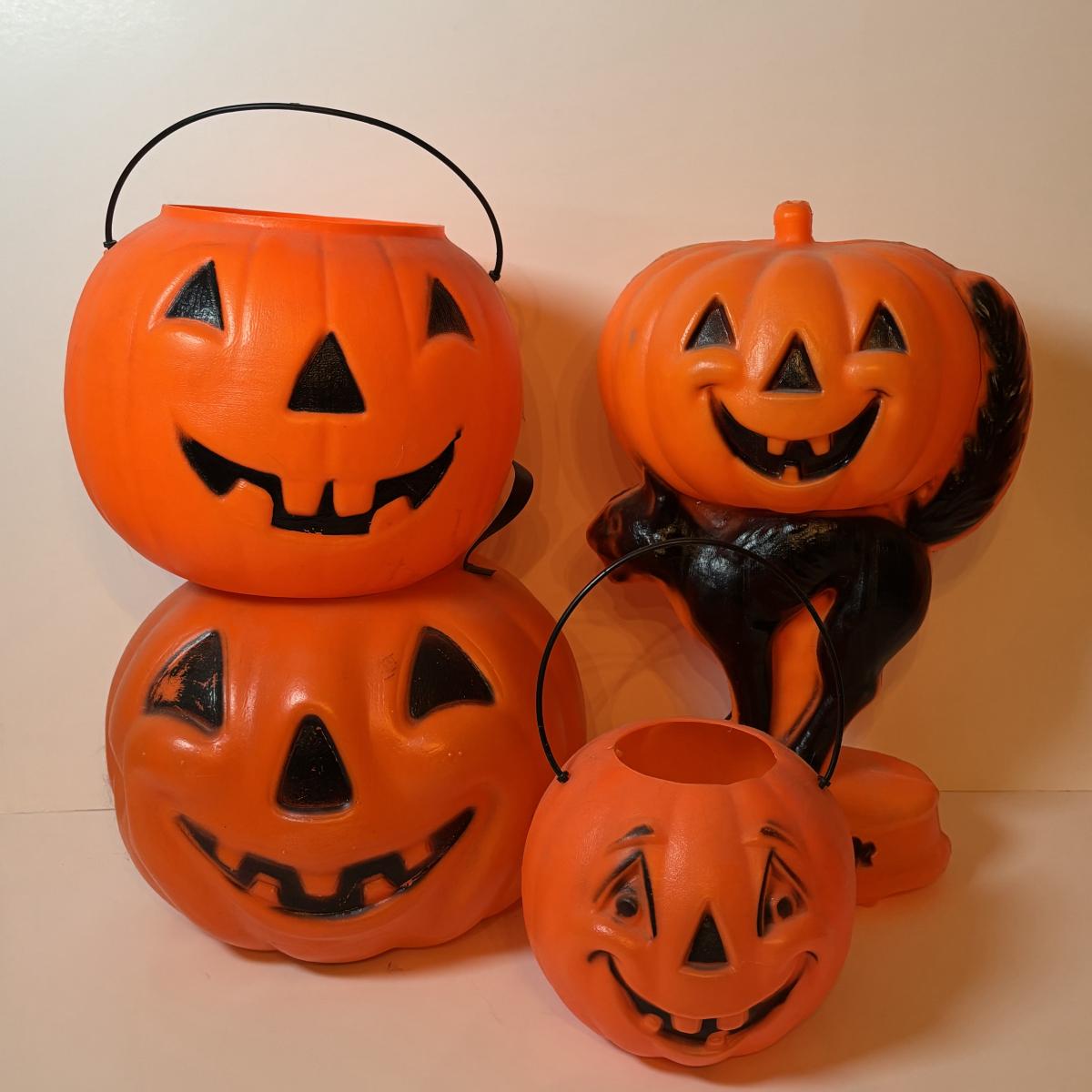 LOT 107: Blow Mold Halloween Cat w/Jack-o-Lantern and Jack-o-Lantern Candy Buckets