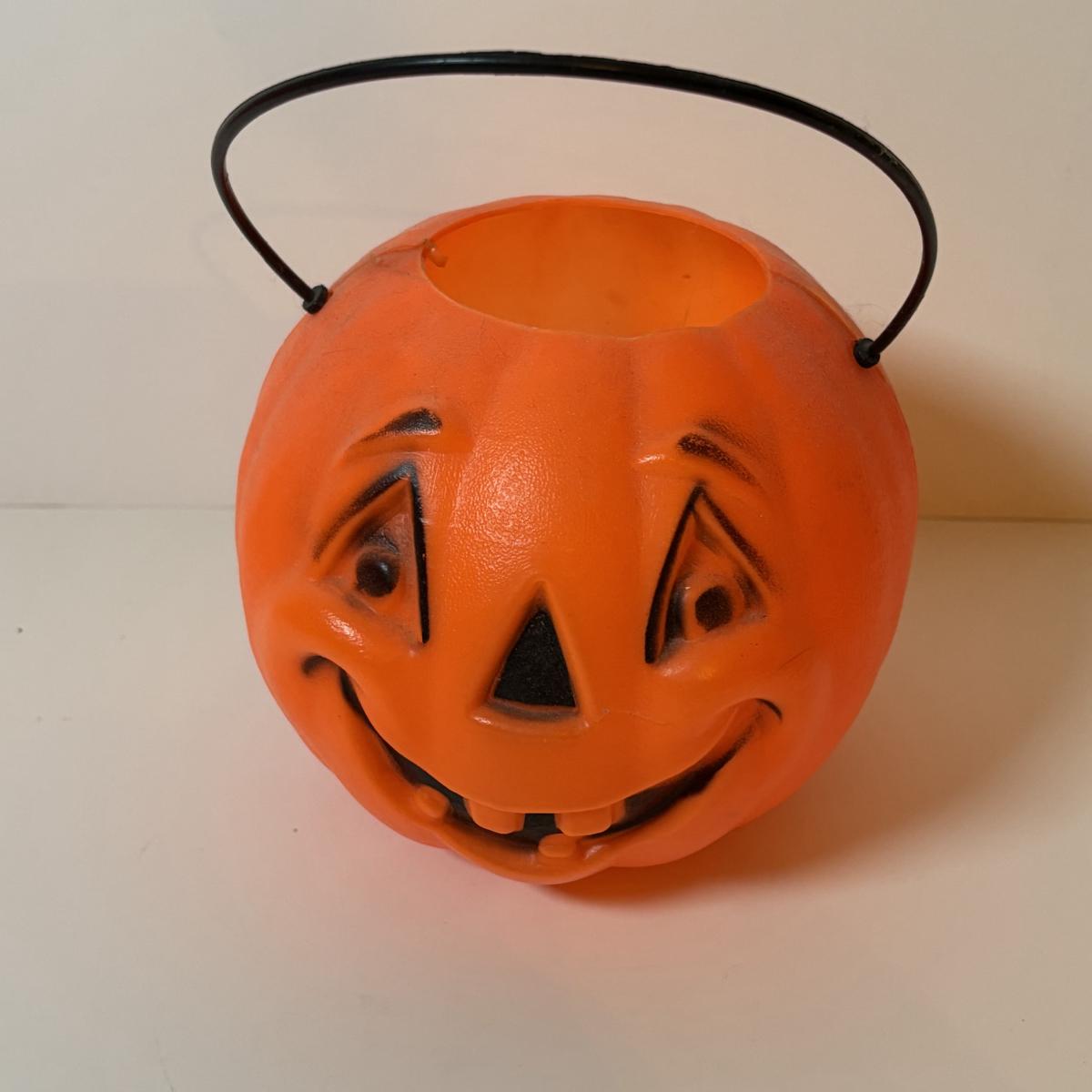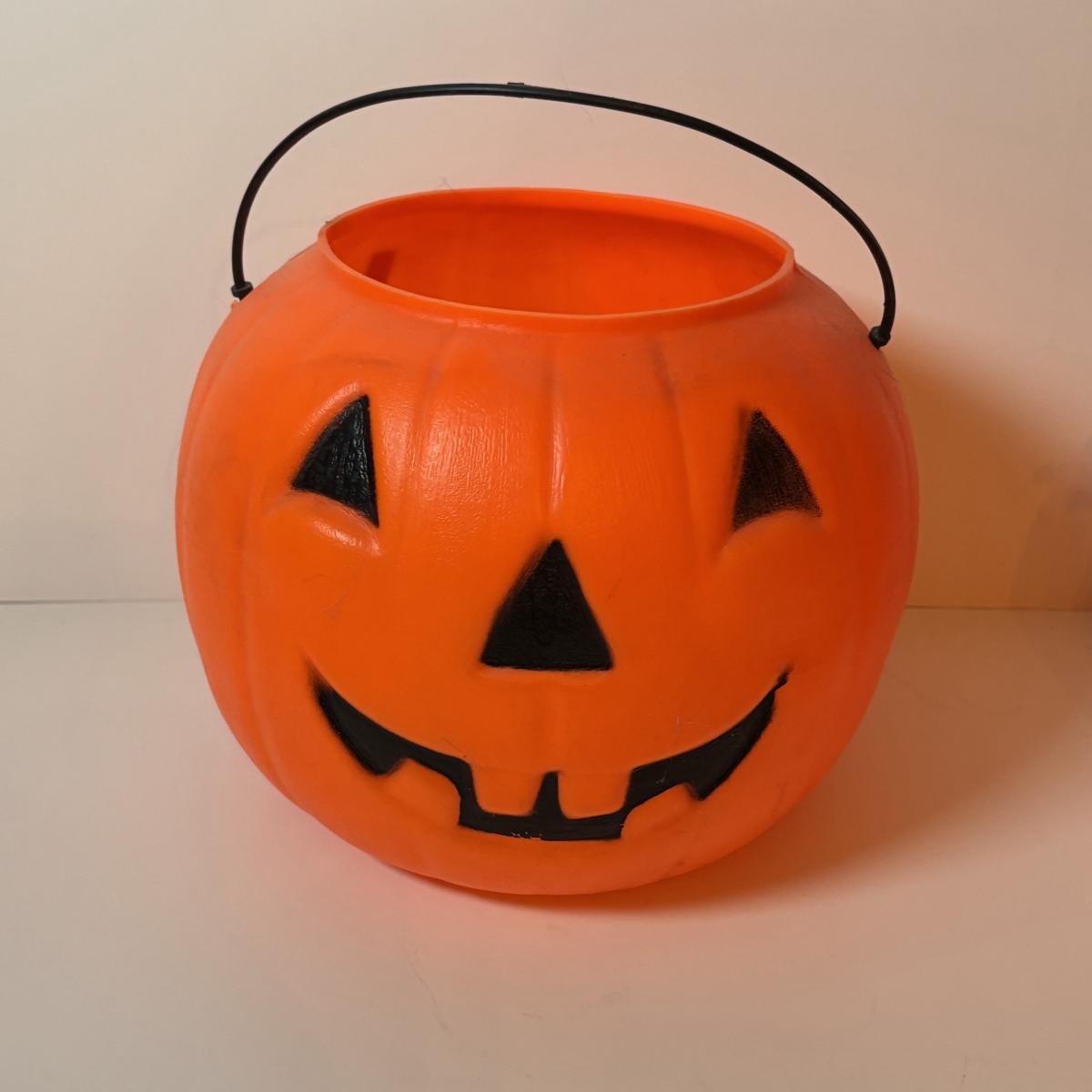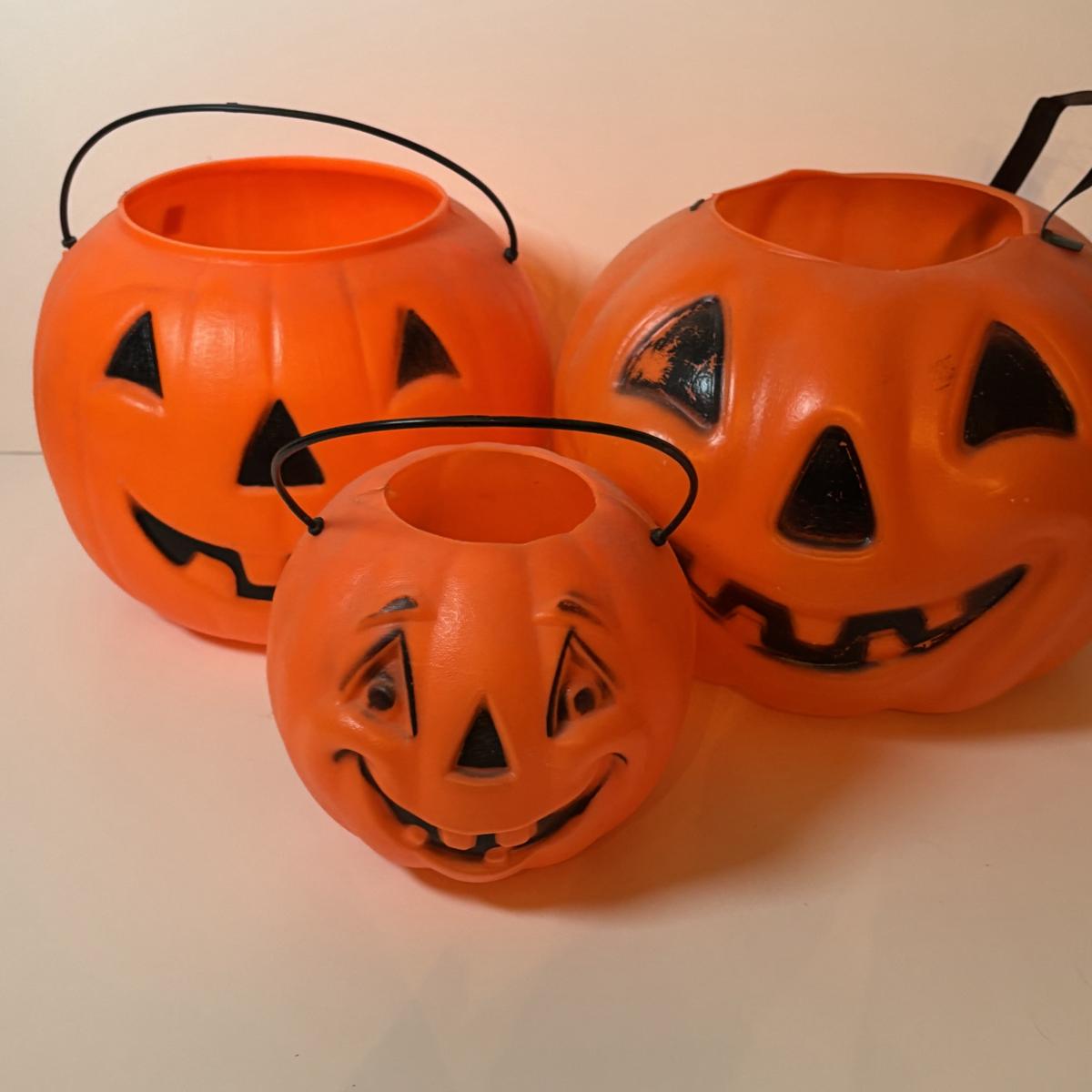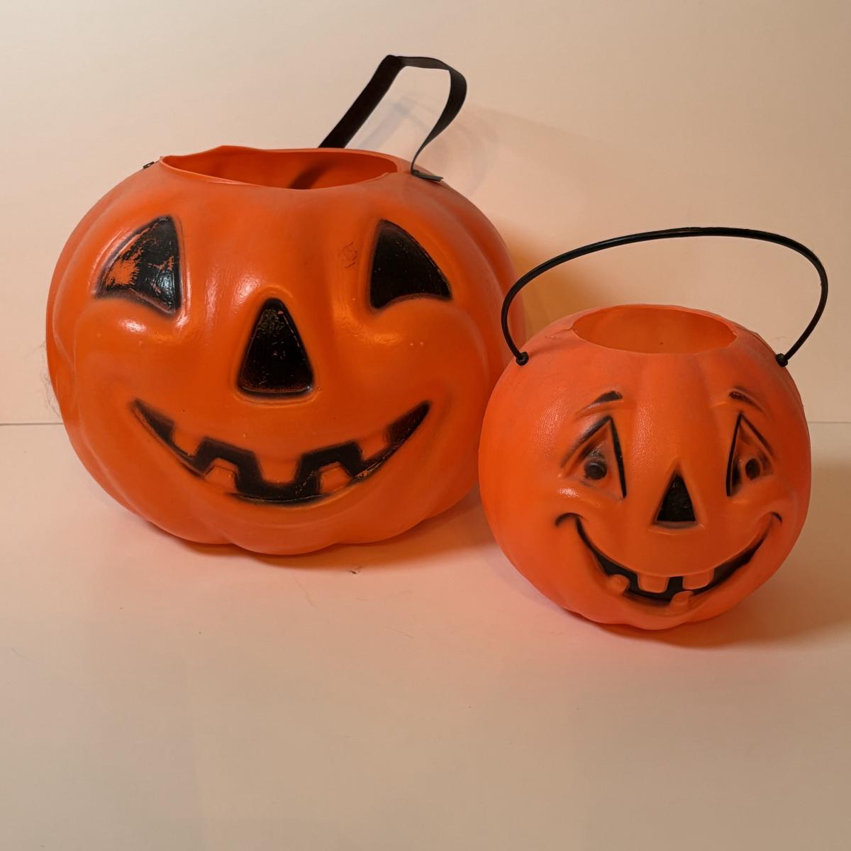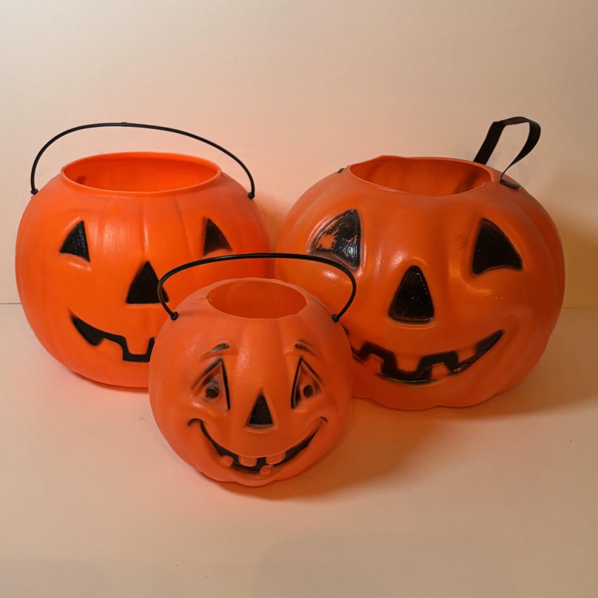 LOT 107: Blow Mold Halloween Cat w/Jack-o-Lantern and Jack-o-Lantern Candy Buckets