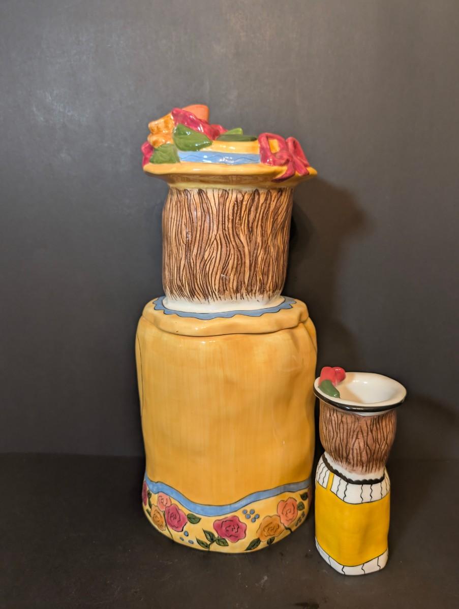 Measurements: Cookie Jar 14 1/2 " H, Matching Vase 6" H.