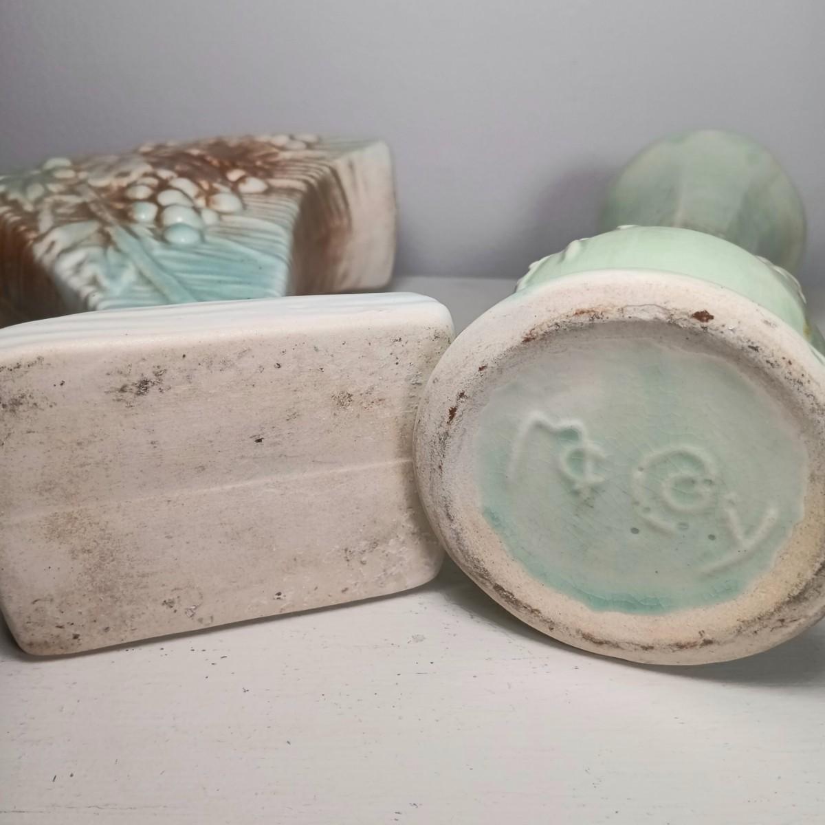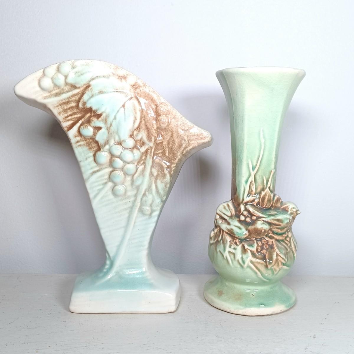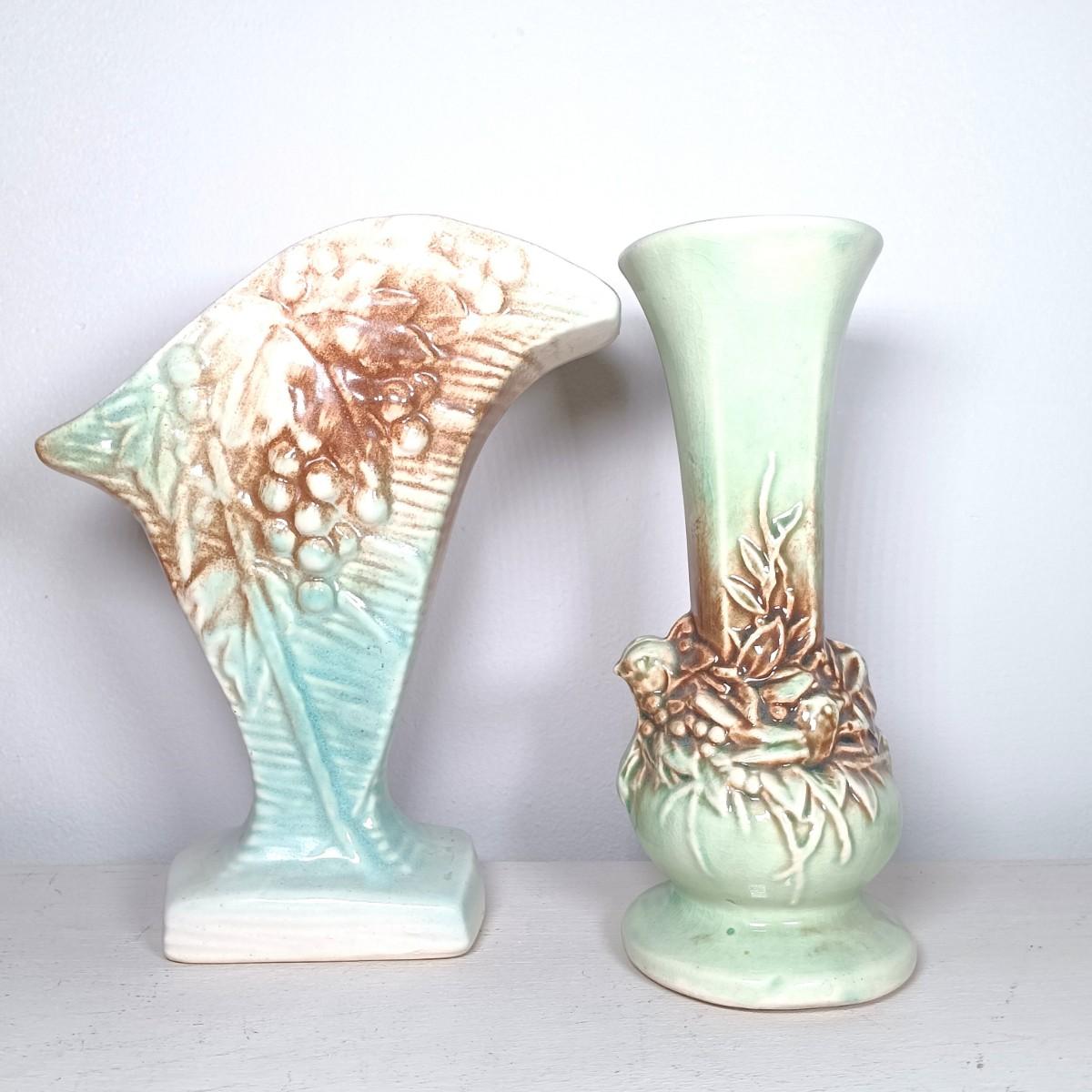 LOT 143: Vintage McCoy Green Bird Vase with Grape Leaf Pottery Planter