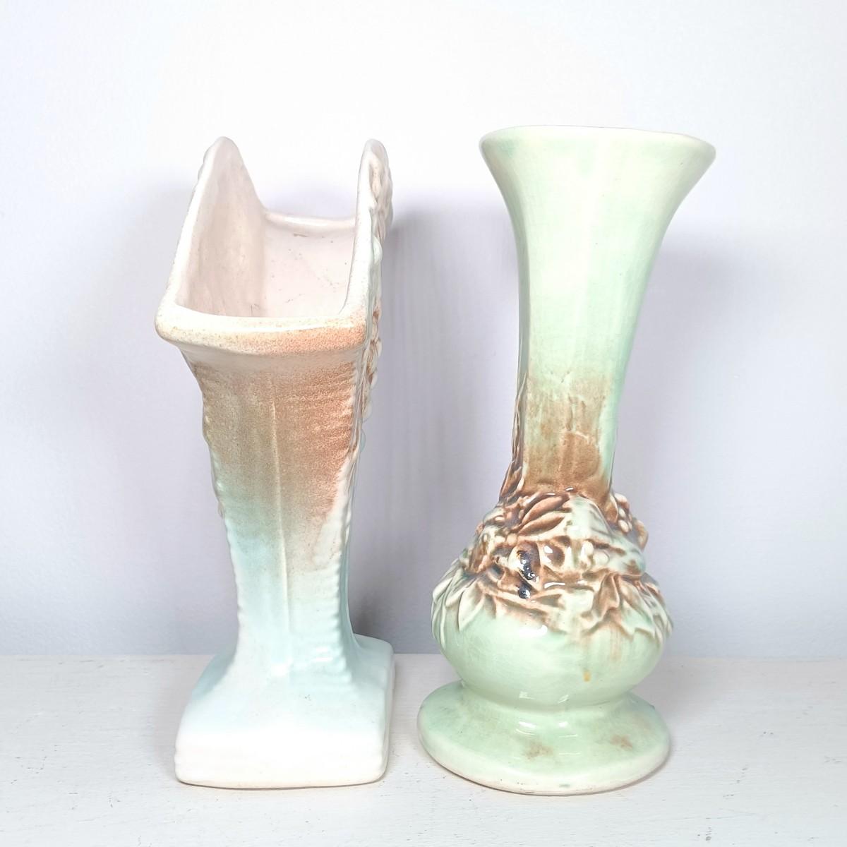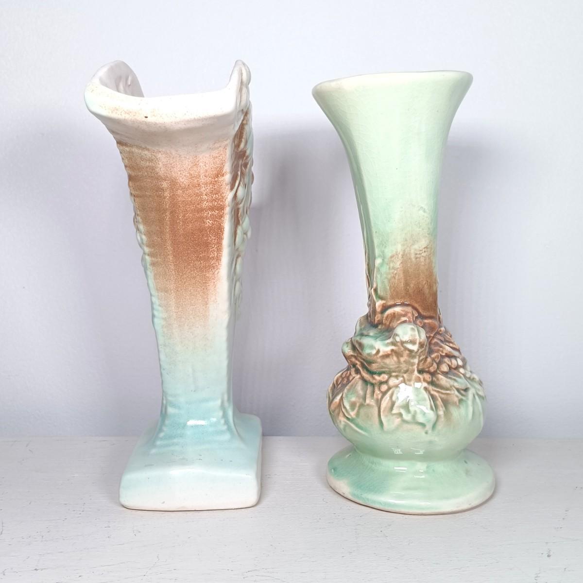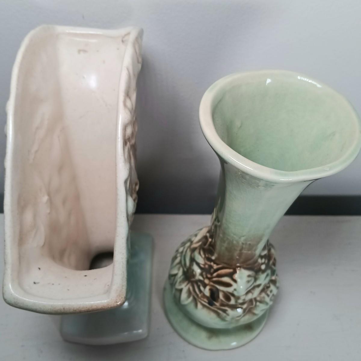 LOT 143: Vintage McCoy Green Bird Vase with Grape Leaf Pottery Planter