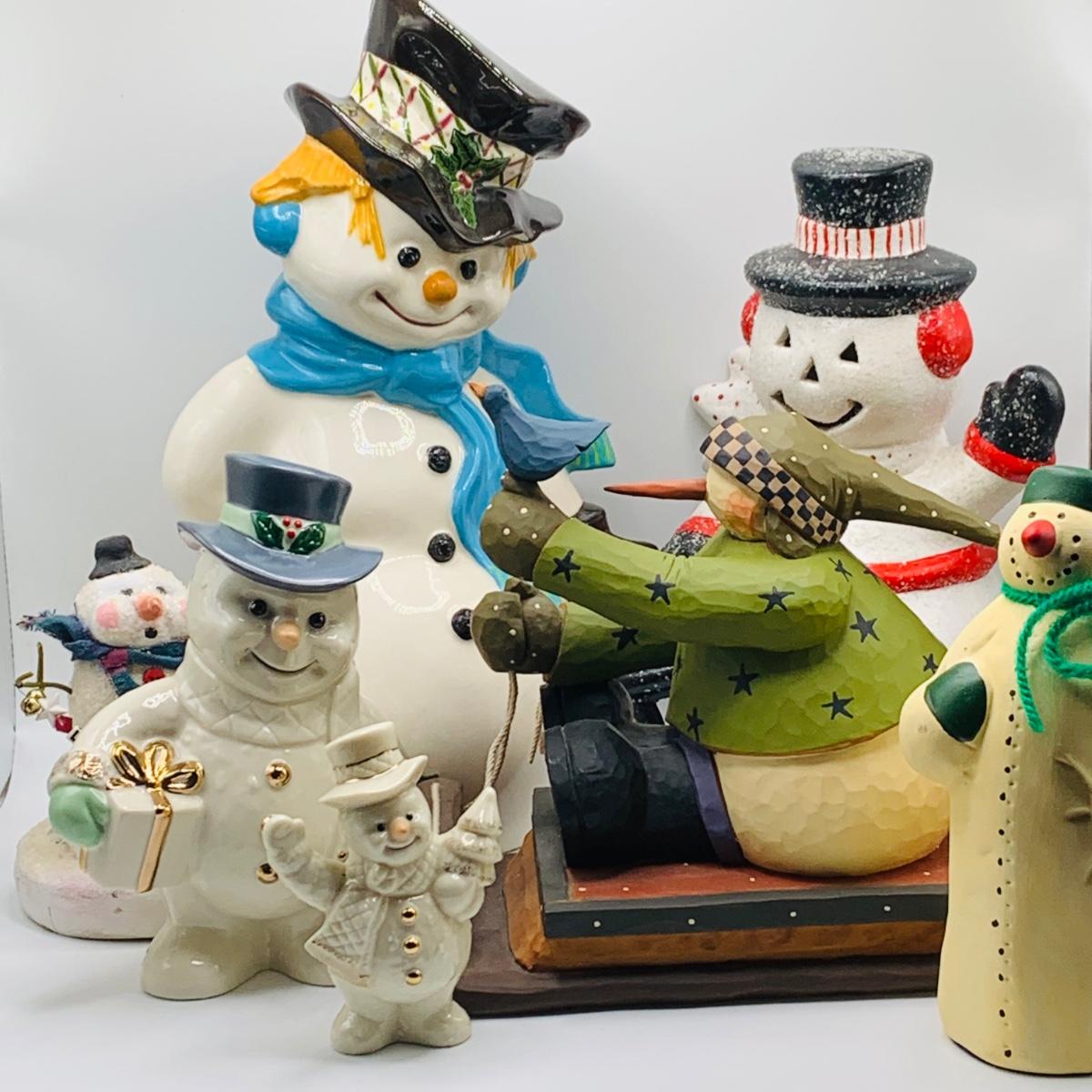 LOT 175: Assortment of Ceramic and Porcelain and Other Holiday Snowmen Featuring Two (2) Lenox Figurines and Willirays Studio Resin Snowman of a Sled