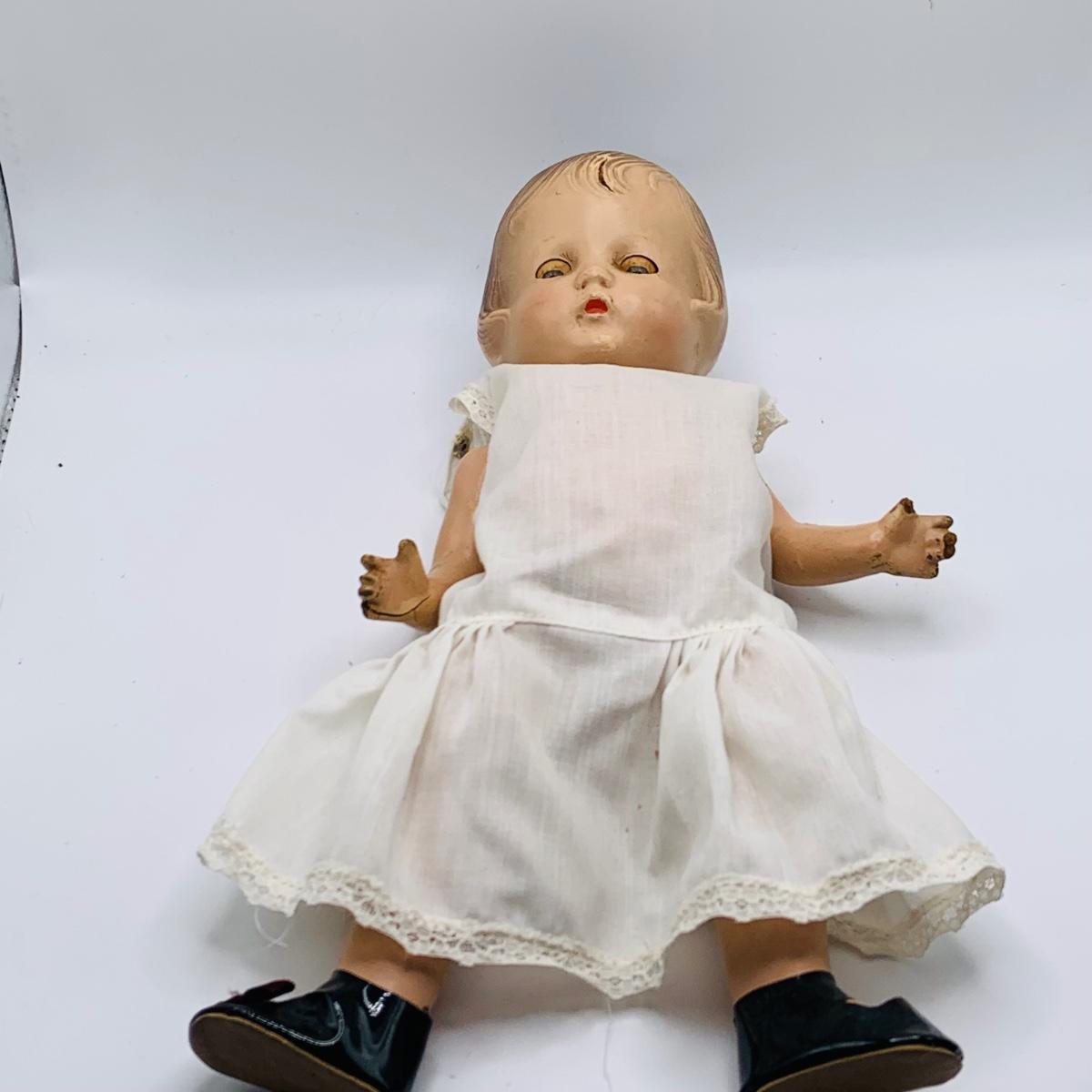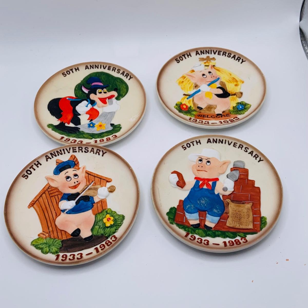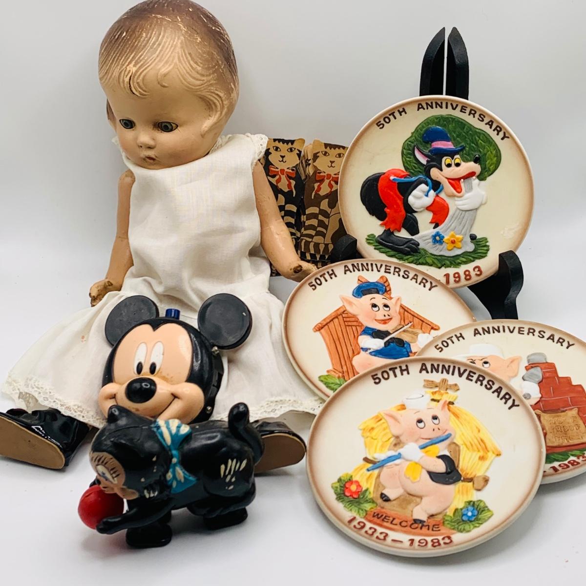 LOT 178: Collection of Vintage Toys Including Composite Doll, Disney Three Little Pigs Anniversary Plates, Mickey Mouse Digital. Clock and More