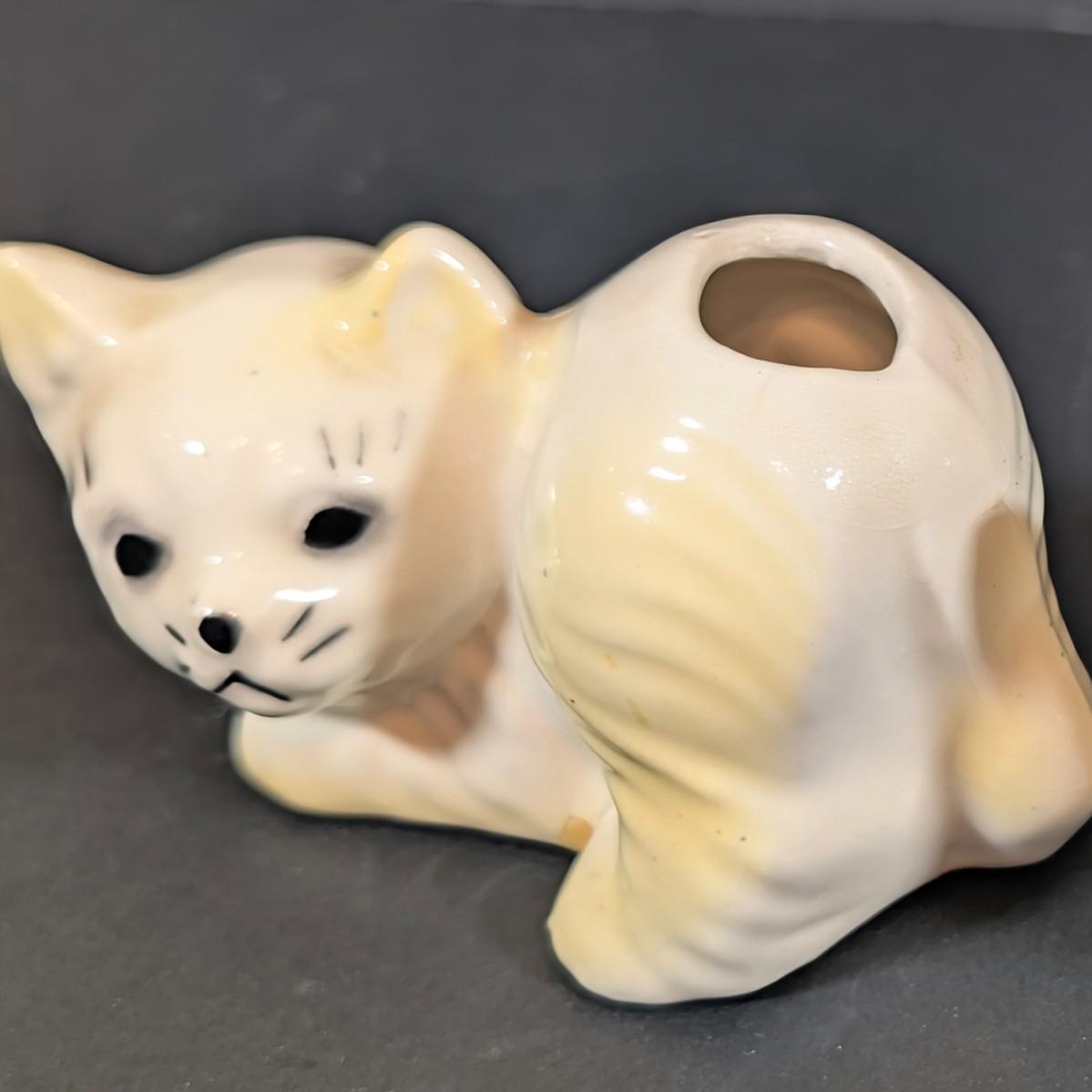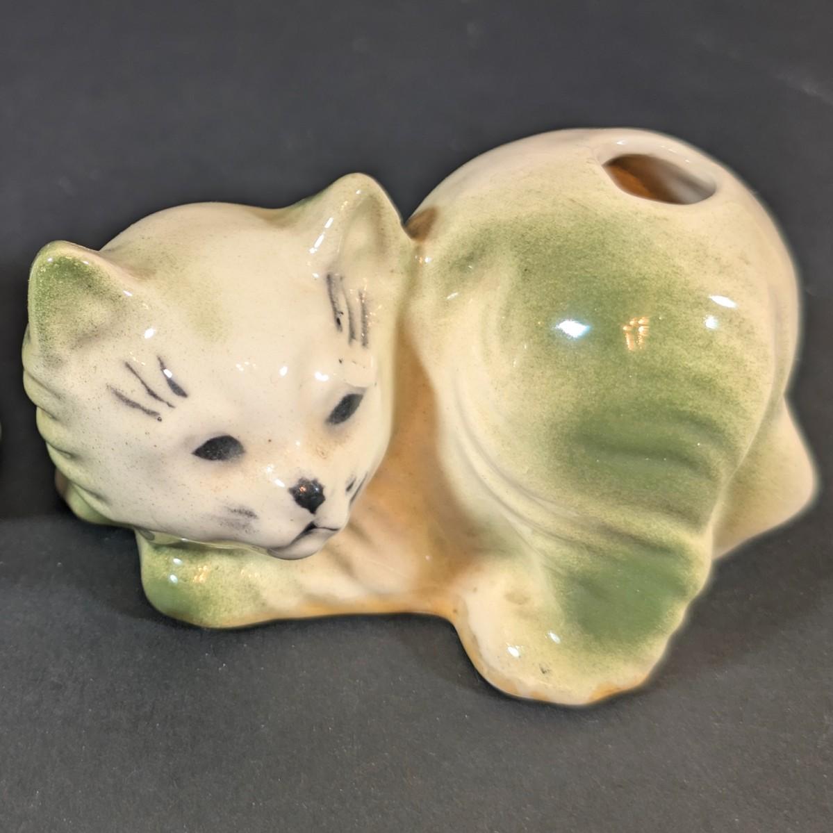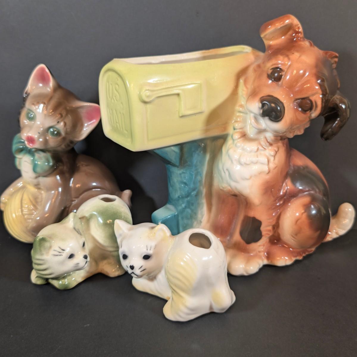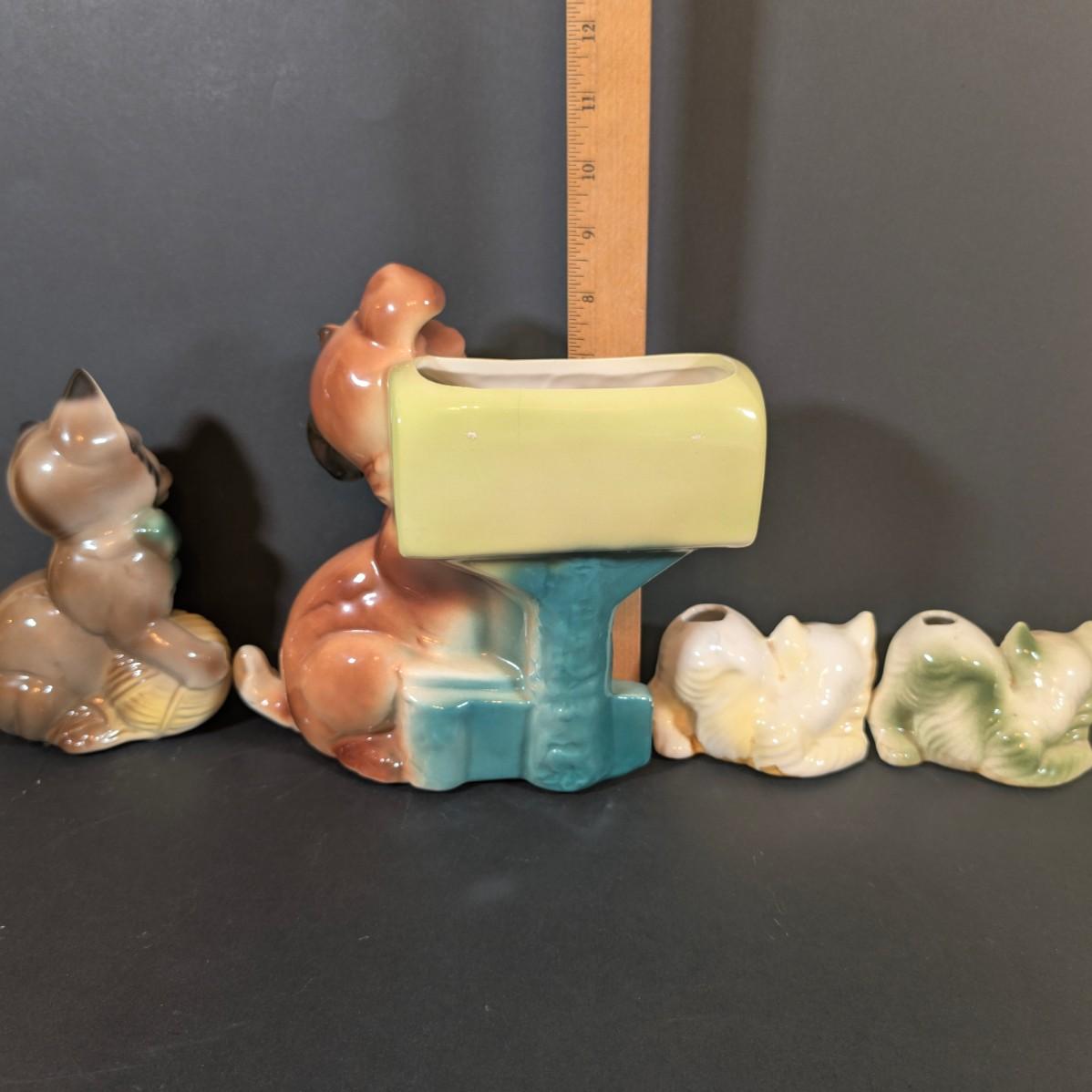 LOT 192: Vintage Doggie w/Mailbox Planter, Kitten w/Ball of Yarn Figure, and 2 Kitty Air Diffusers or Catus Planters