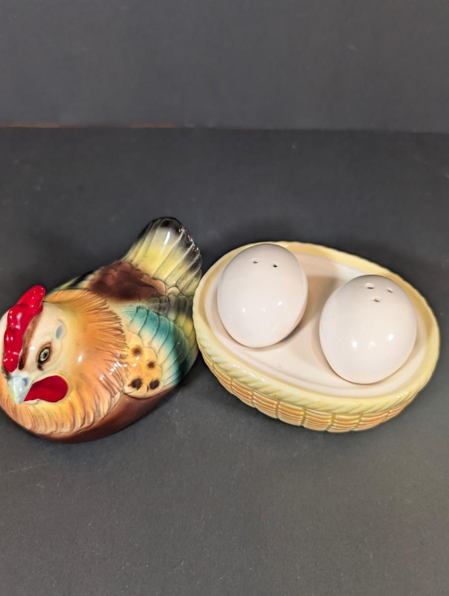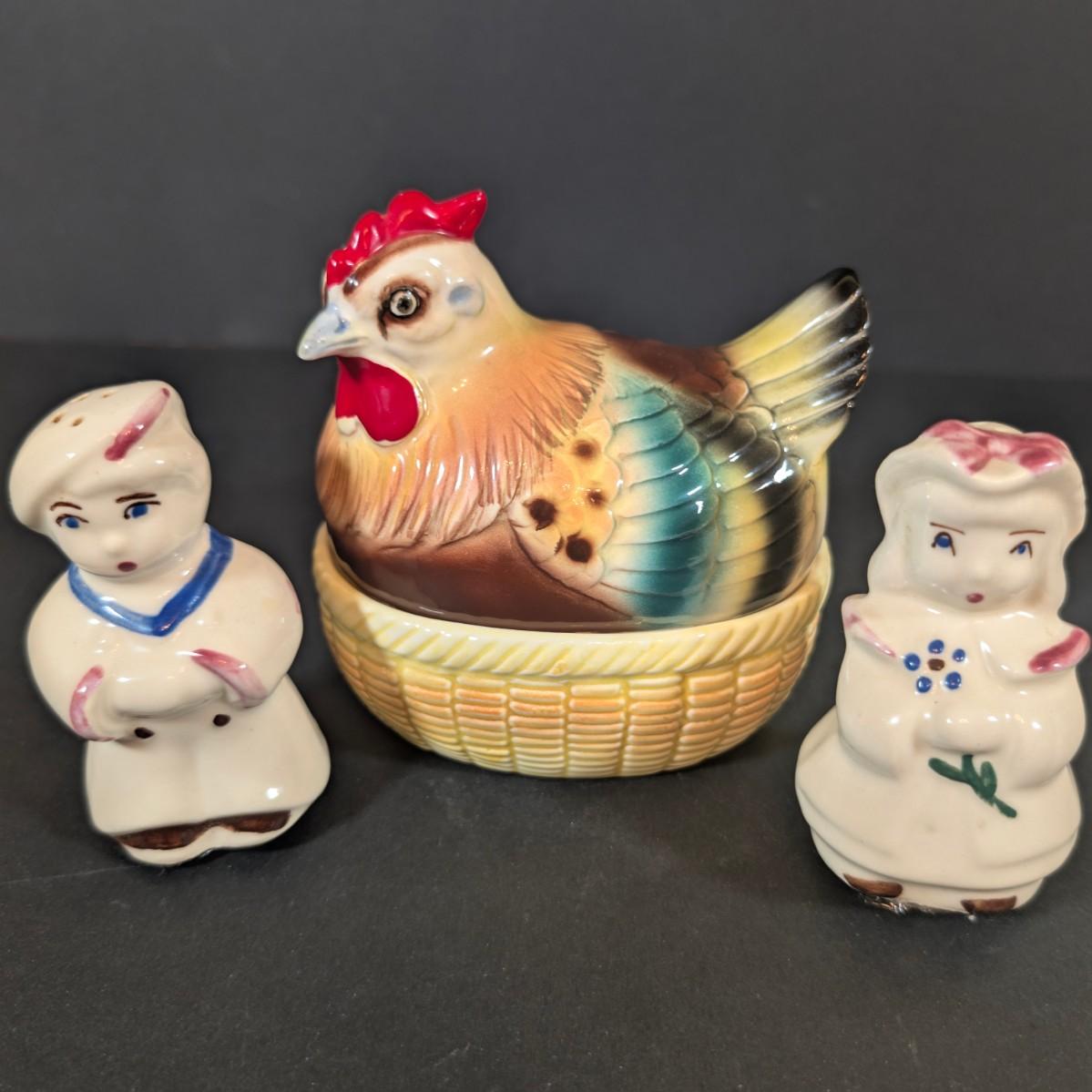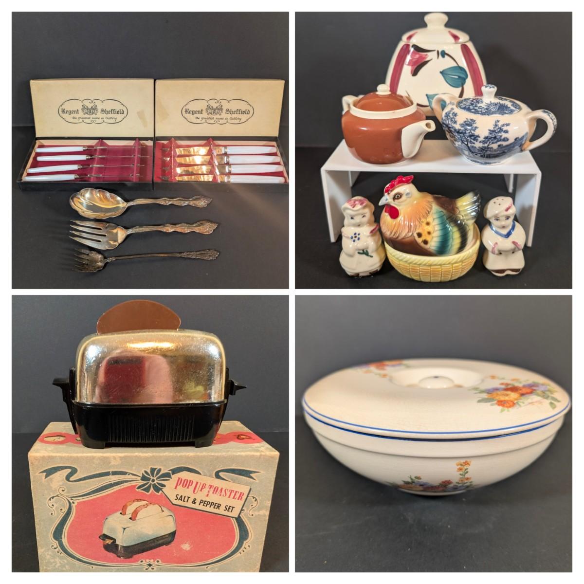 LOT 194: Vintage Kitchen Collection: Regent Sheffield Steak Knives, Norcrest Hen on Nest w/Egg Salt/Pepper Shakers, Shawnee Salt/Peppers Shakers, Pop=Up Toaster Salt/Pepper Shakers and More