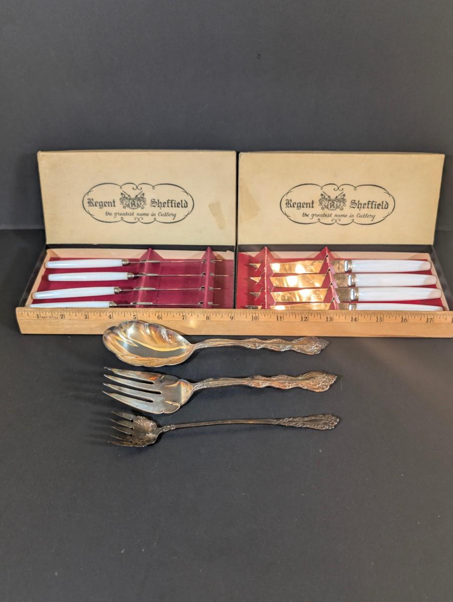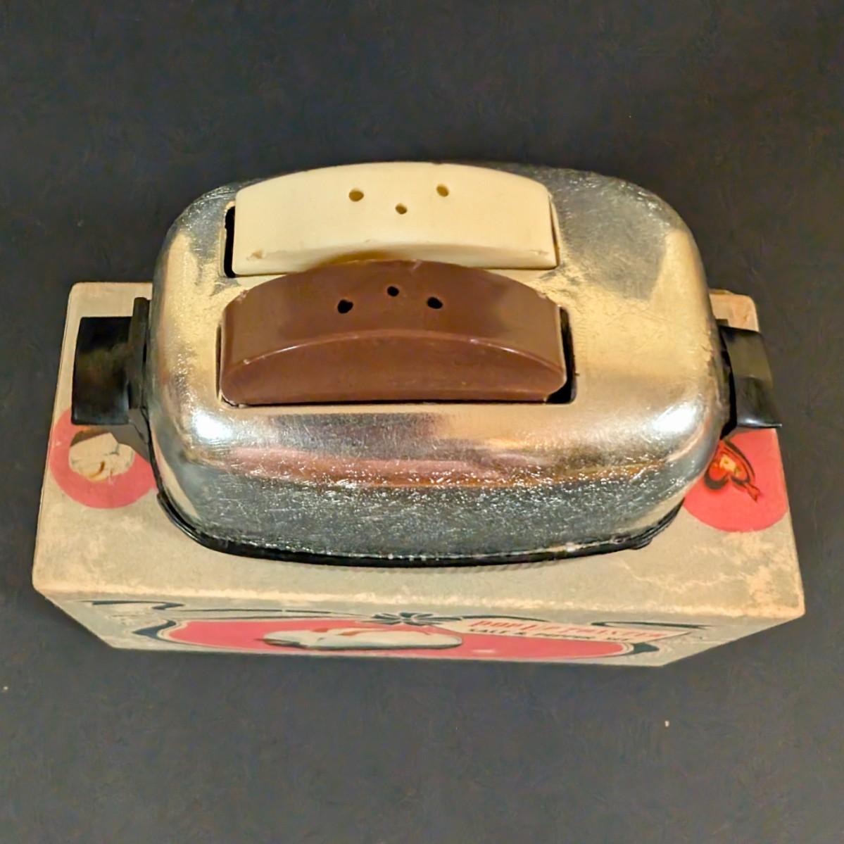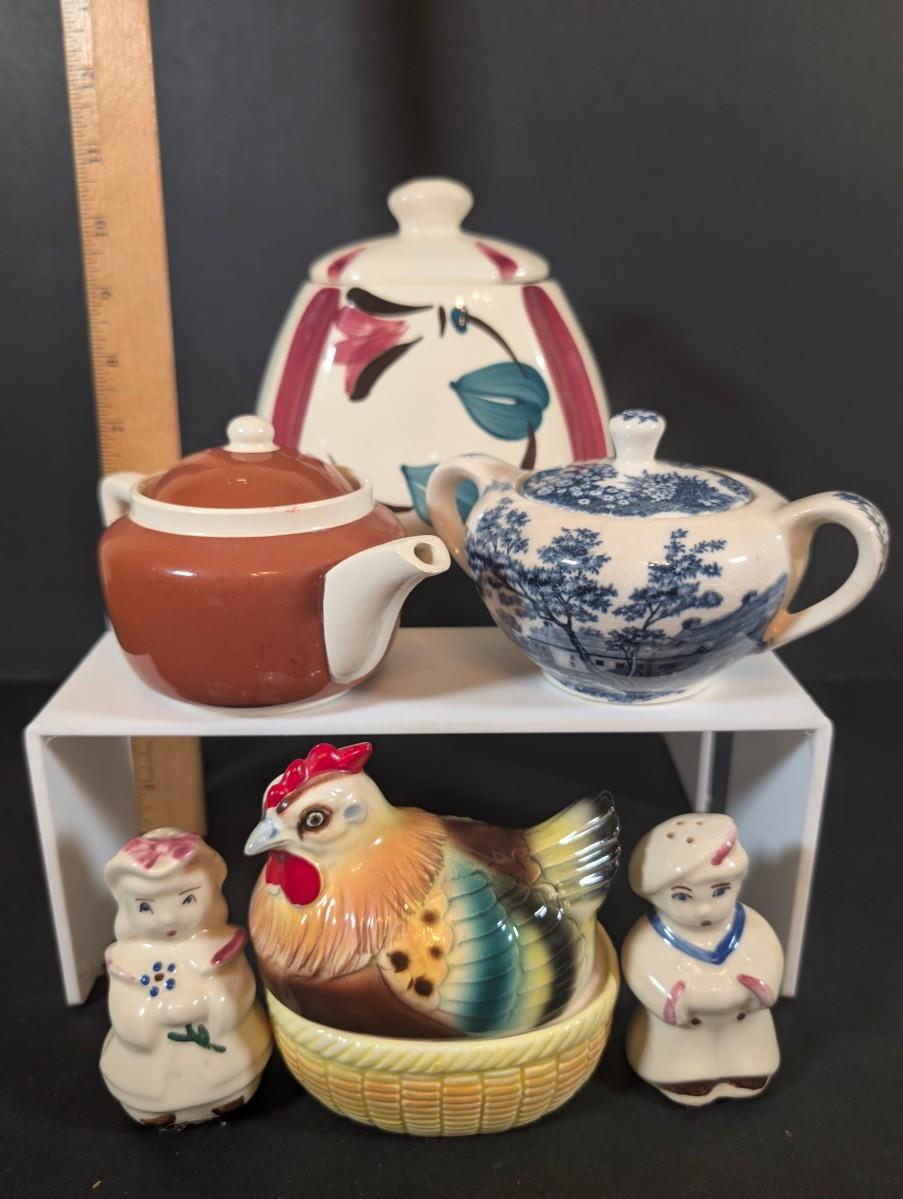 LOT 194: Vintage Kitchen Collection: Regent Sheffield Steak Knives, Norcrest Hen on Nest w/Egg Salt/Pepper Shakers, Shawnee Salt/Peppers Shakers, Pop=Up Toaster Salt/Pepper Shakers and More