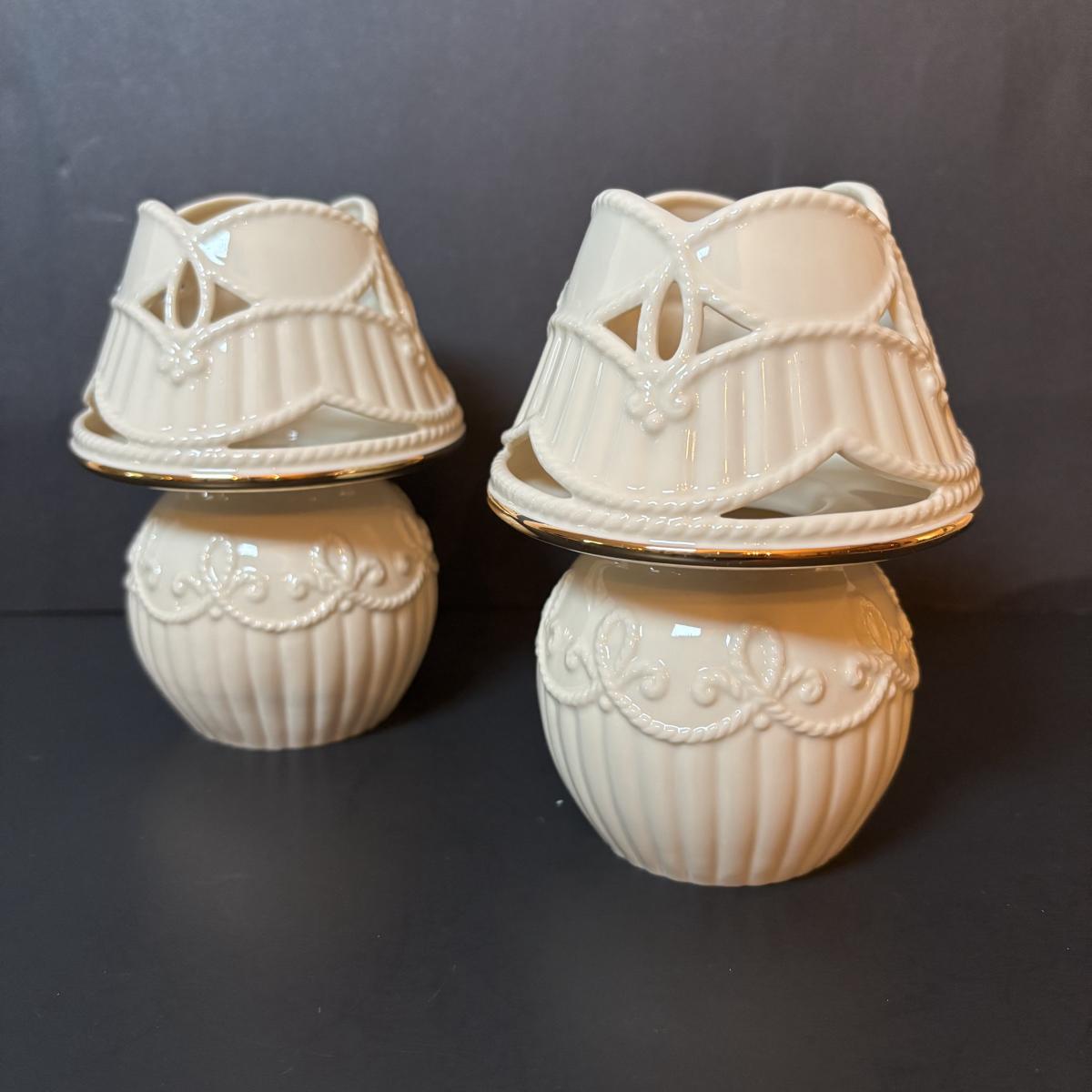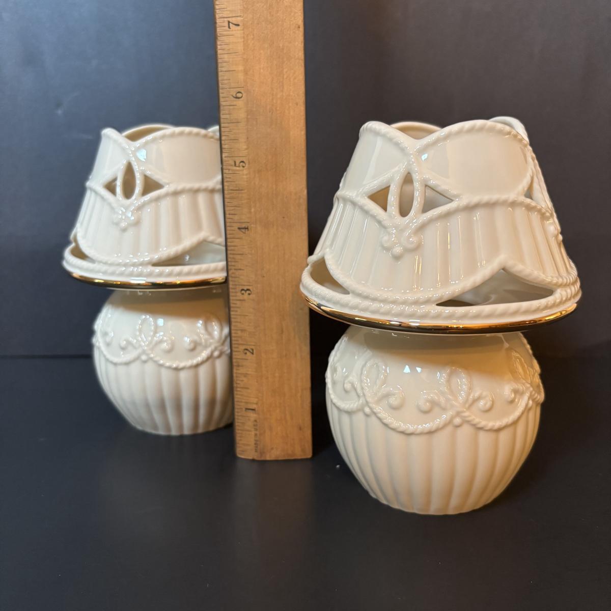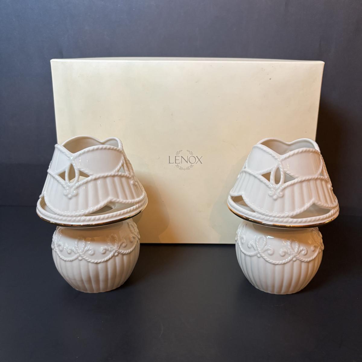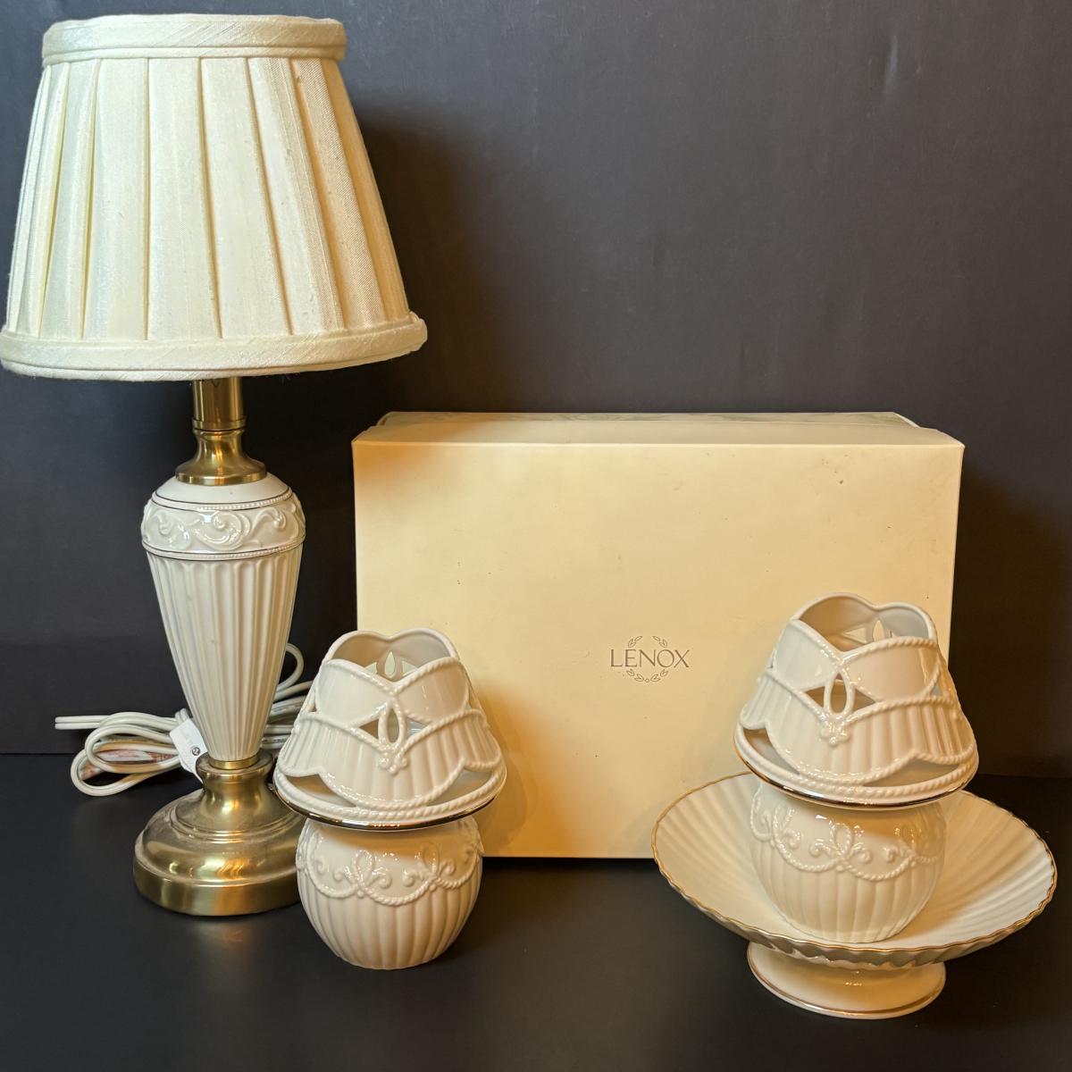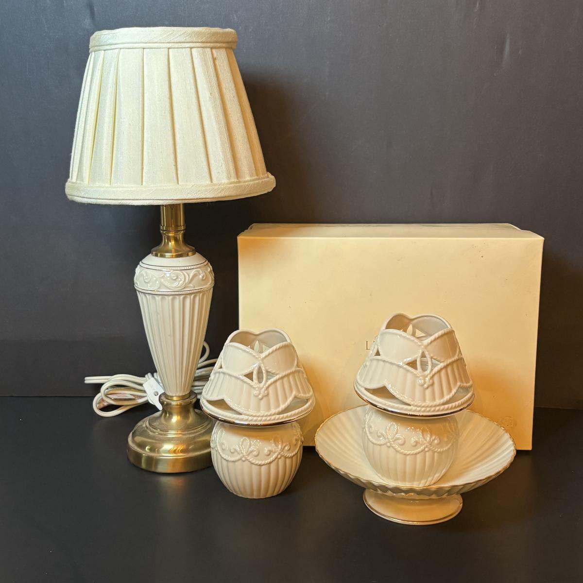 LOT 223: Lenox Accent Lamp, Carved Tea Light Lamps/Set of 2 and Pedestal Candy Bowl