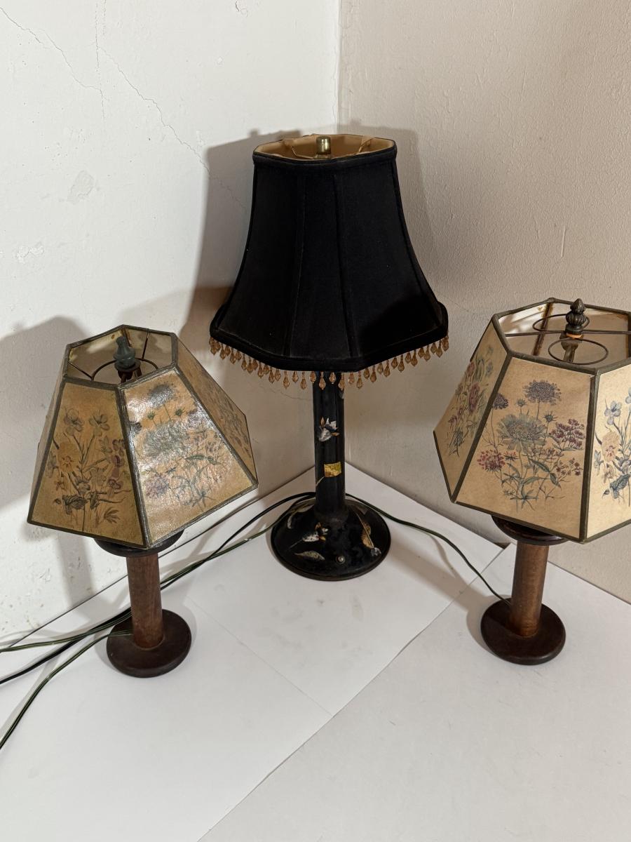 The pair of lamps are Hexagonal Botanical Lamp Shades with Wooden stick Lamps. Larger black lamp is a vintage Vanity Lamp with lamp shade with tassels. Please see all pictures as they are the best representation of the items. The pictures show condition, measurements if taken, and what is included in the lot. Due to the large amount that we photograph and the time frame, we are not always able to take measurements. All items unless noted, are pre-owned and have been used. If you purchased furniture, you must bring help. We do not allow one person to carry large furniture out on their own. Bring help, tools and a truck for the safety of our client’s homes, and your personal safety. Any damages that result to the property including walls, and floors due to moving of the furniture will be charged to the buyer. Company policy. Thank you.