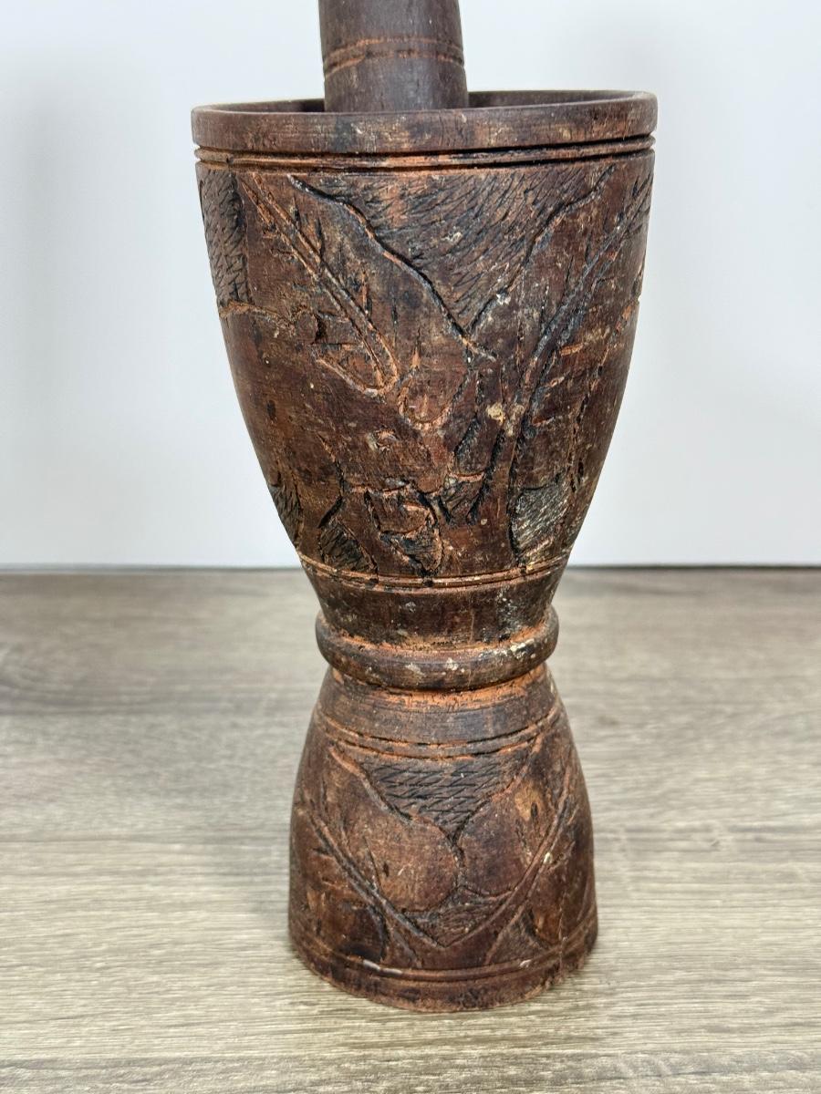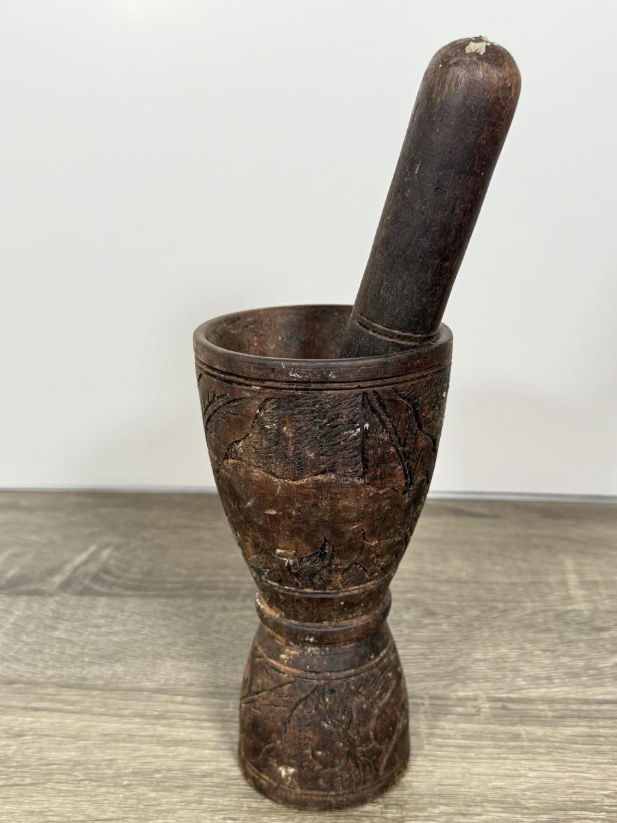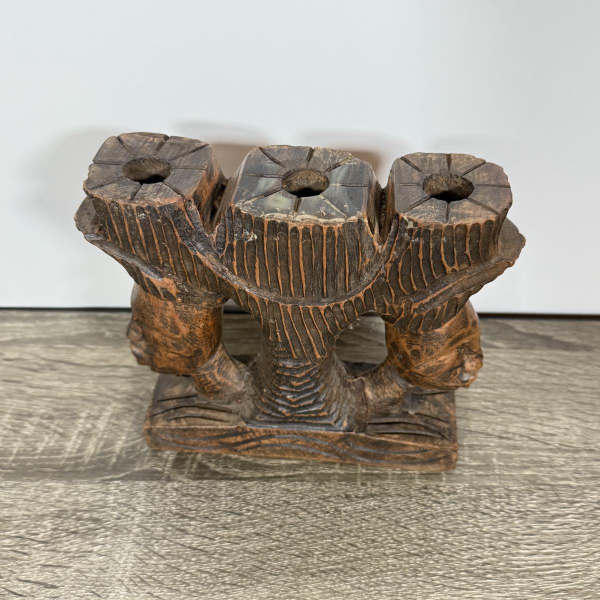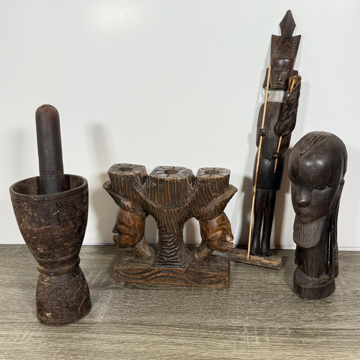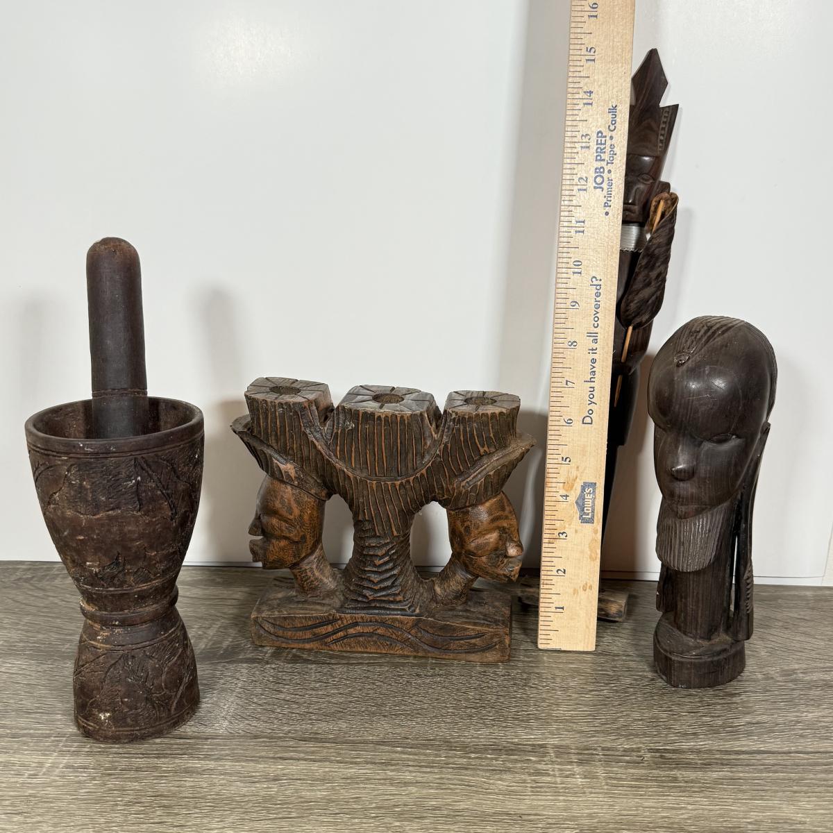 LOT 73L: Hand Carved Wood Collection: Mortar & Pestle, Candle Holder, Vintage Tribal Statues
